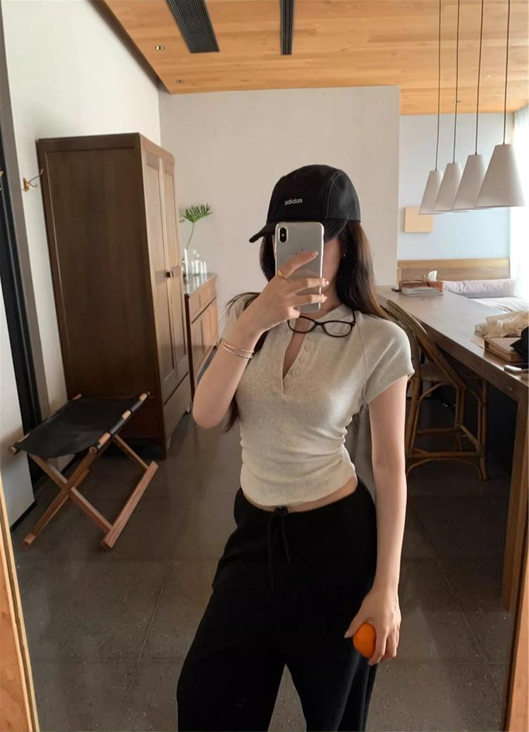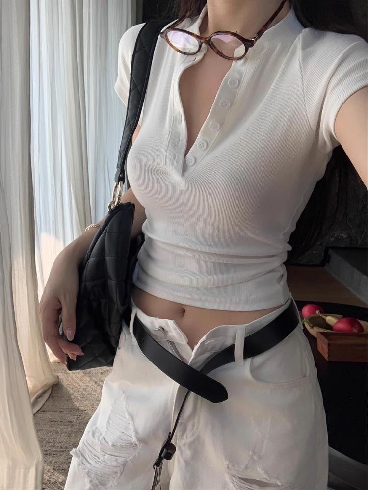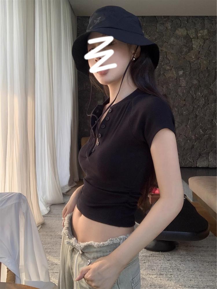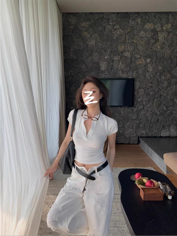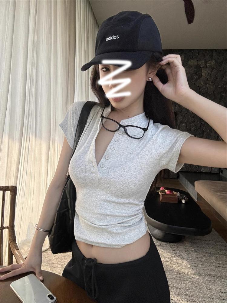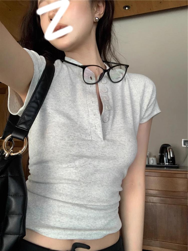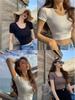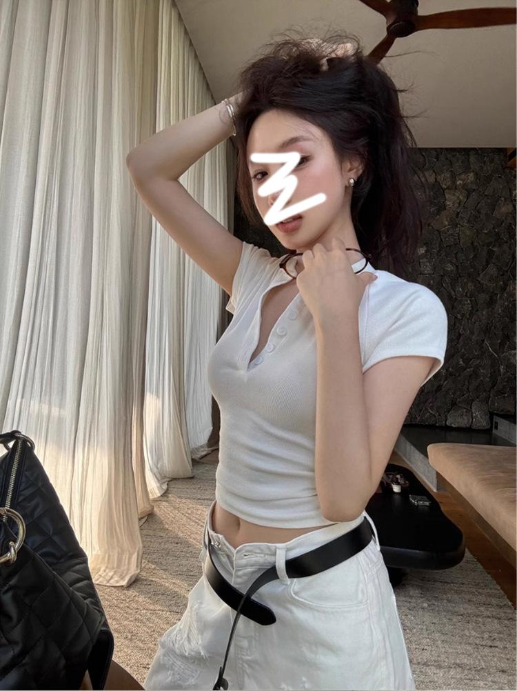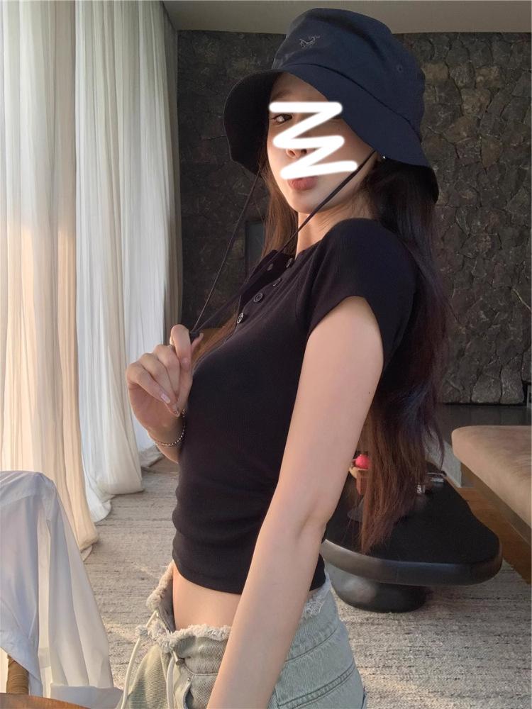 Camiseta Francesa de Cuello Medio Abierto y Manga Corta para Mujer, Diseño de Verano de Nicho, Ajustada, Adelgazante, Estilo Spice Girl, Top Corto