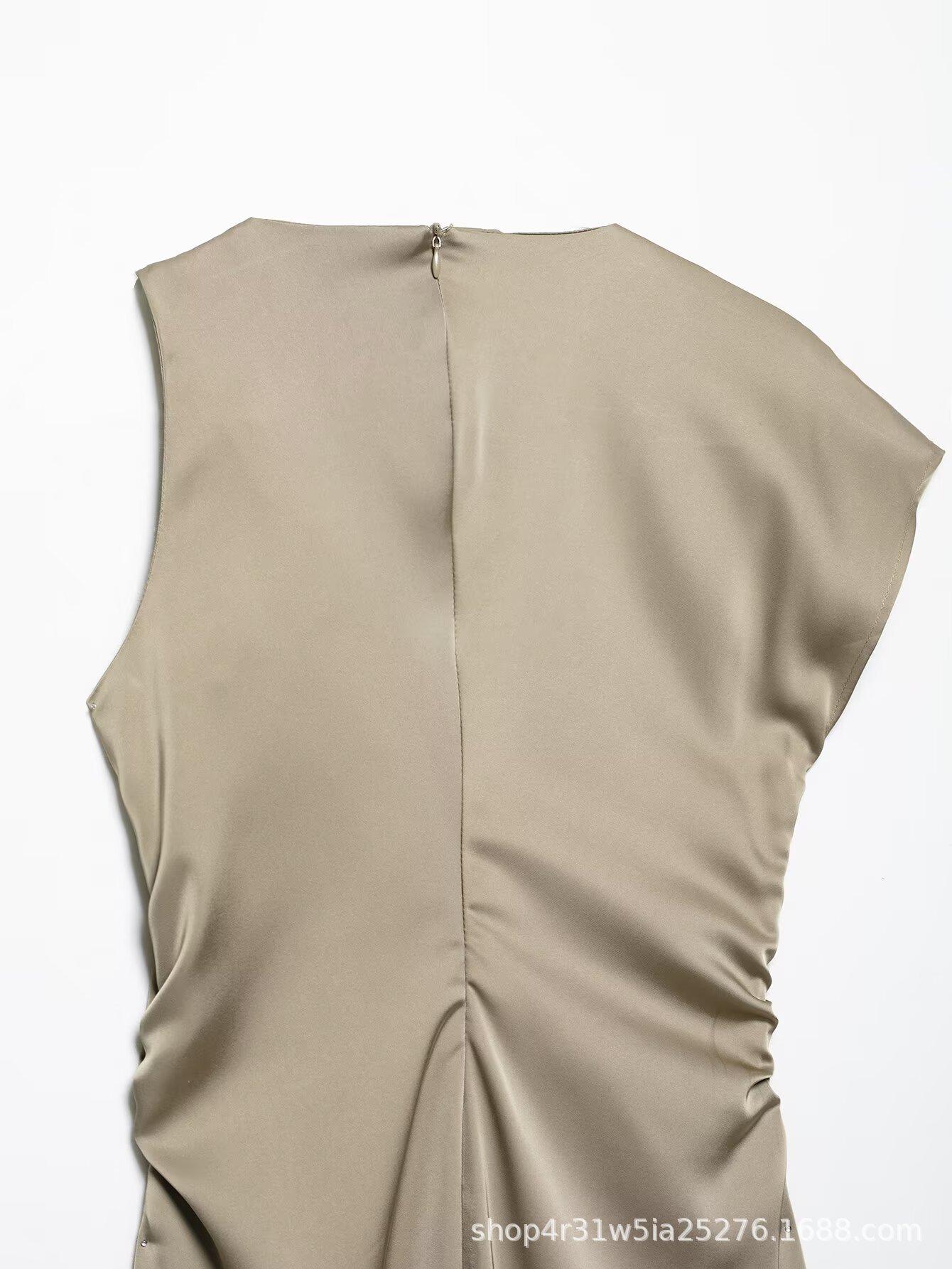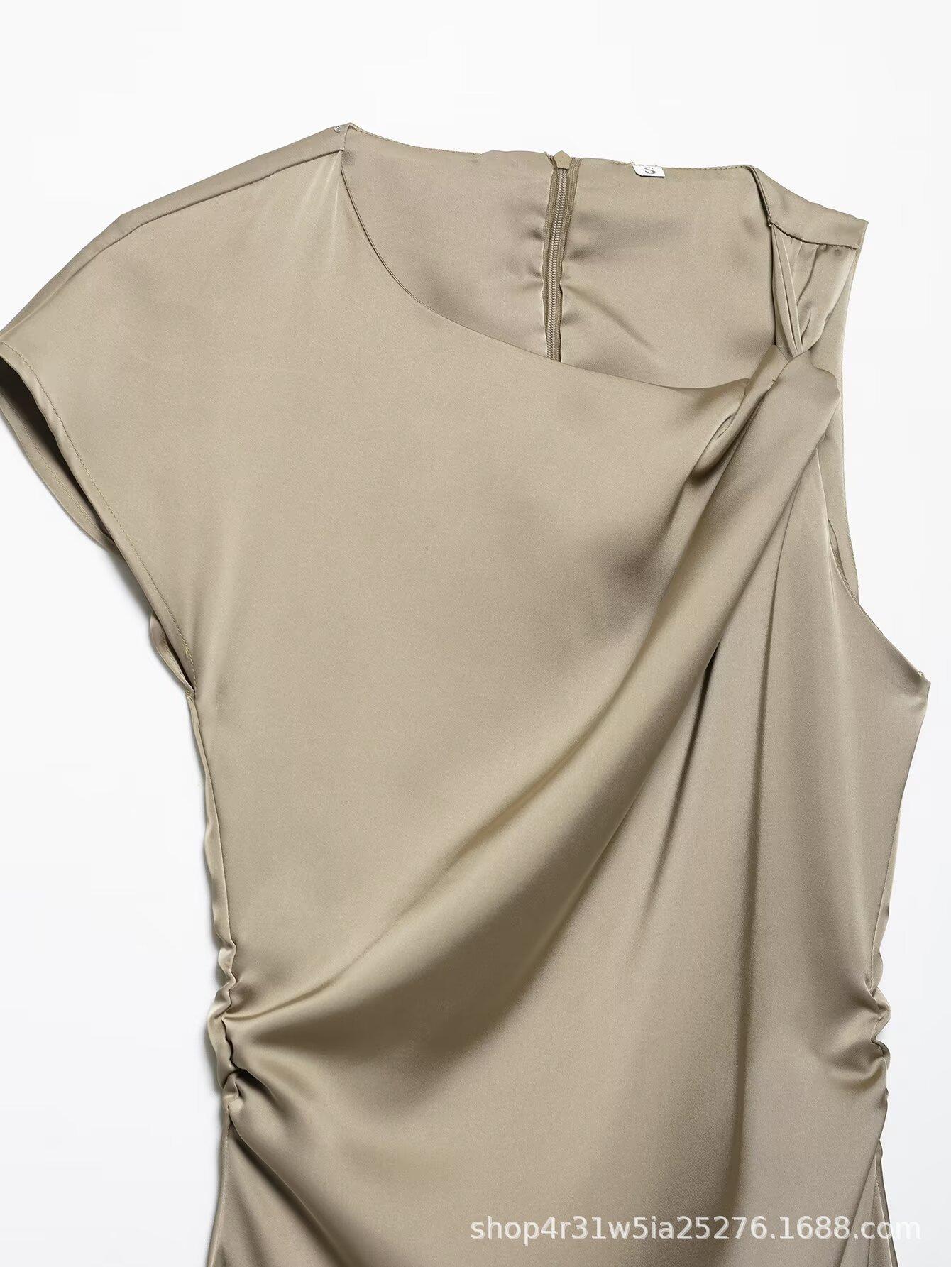 Amazon Aliexpress Exportación Transfronteriza Ropa de Mujer 2025 Verano Vestido con Textura de Satén de Seda Decorativo Plisado Irregular