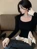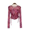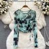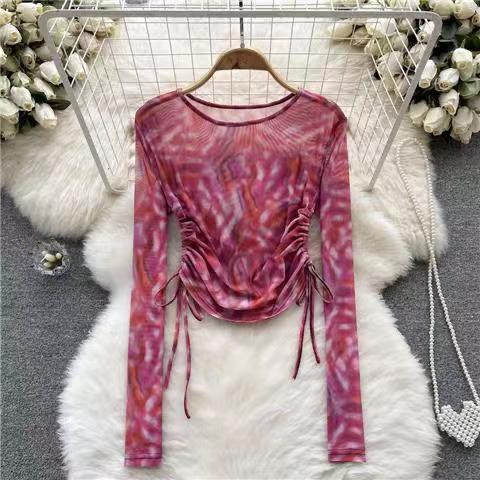 Camiseta de Cuello Redondo con Cordón Ajustable de Diseño Nicho Retro Francés Tie-Dye Otoño para Mujer de Manga Larga Camiseta Base