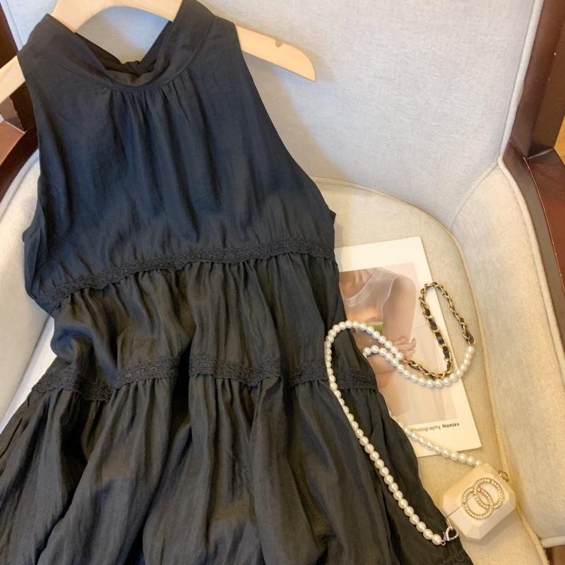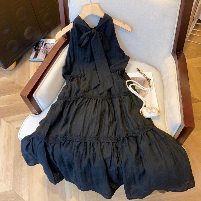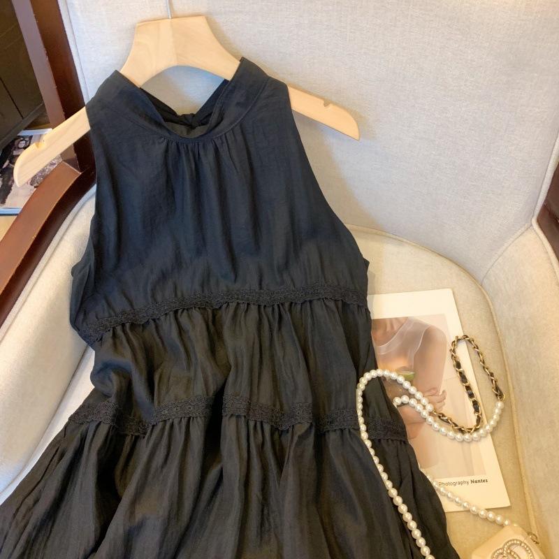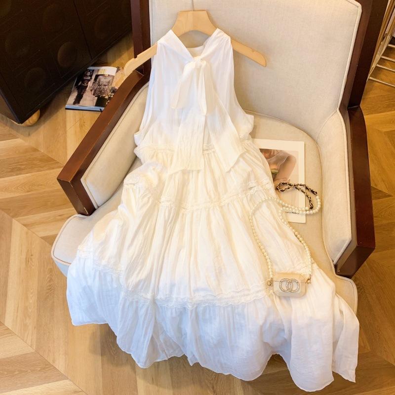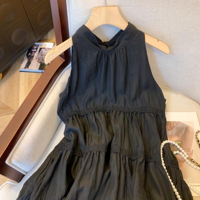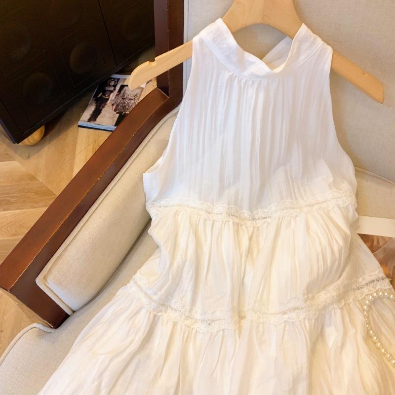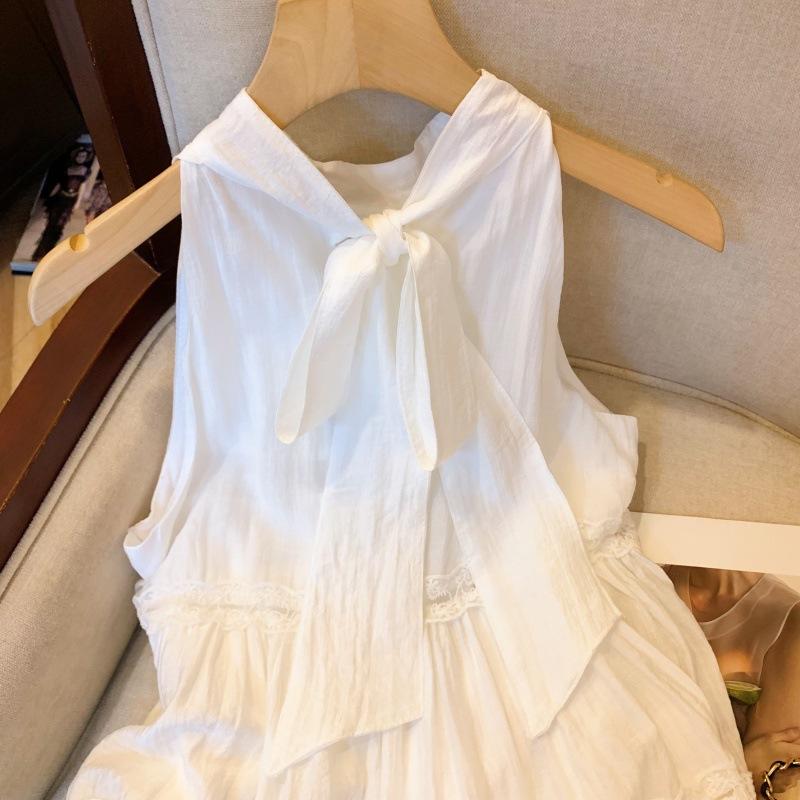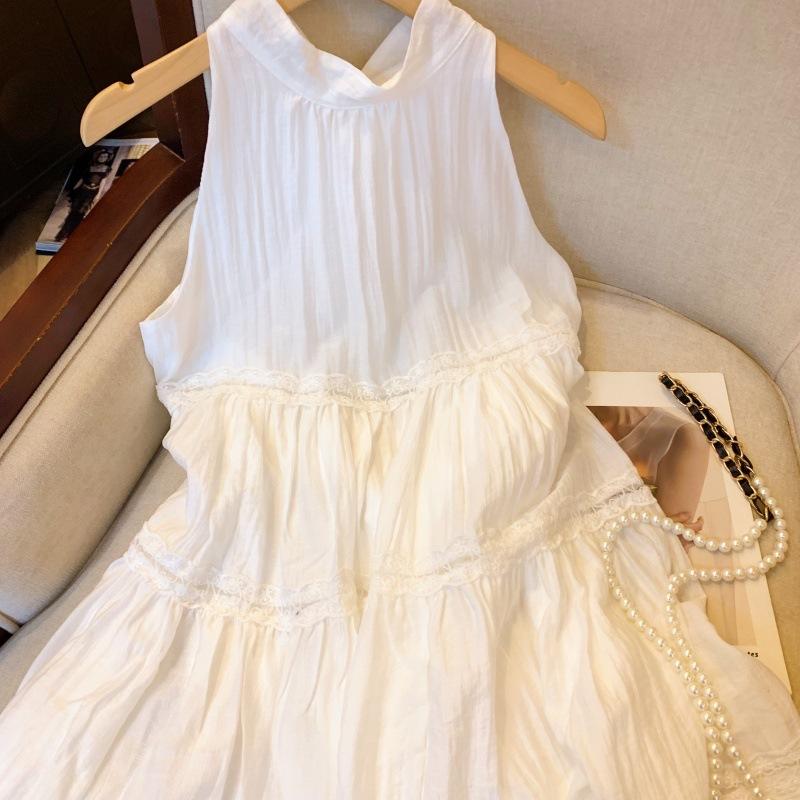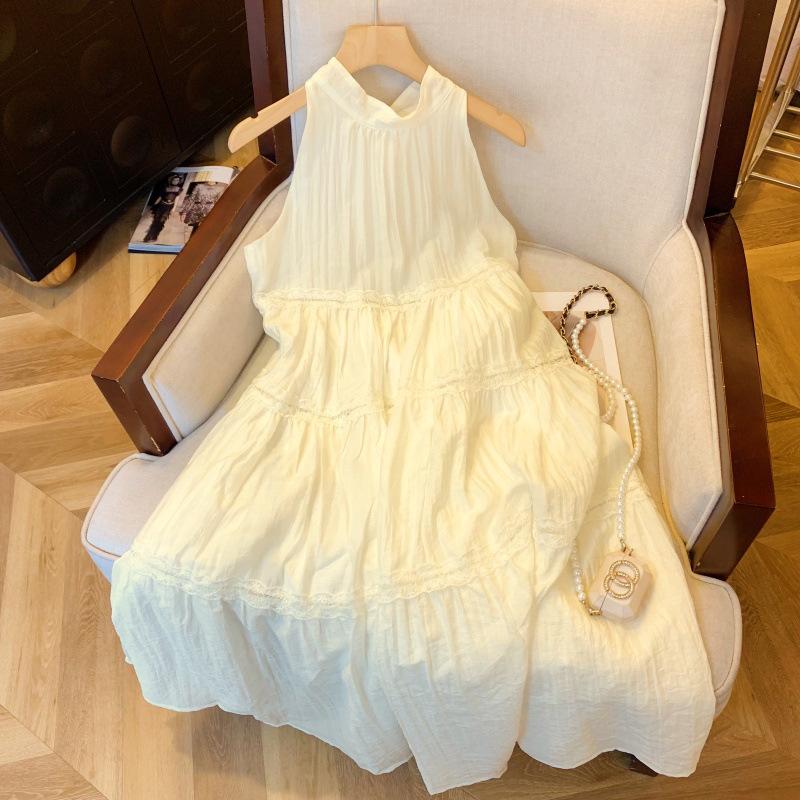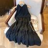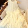2025 Nuevo Vestido de Cuello Halter Amarillo Claro sin Mangas para Mujer Verano Vacaciones Junto al Mar Hada Vestido de Playa