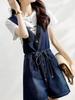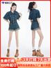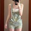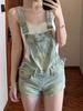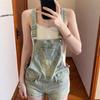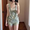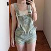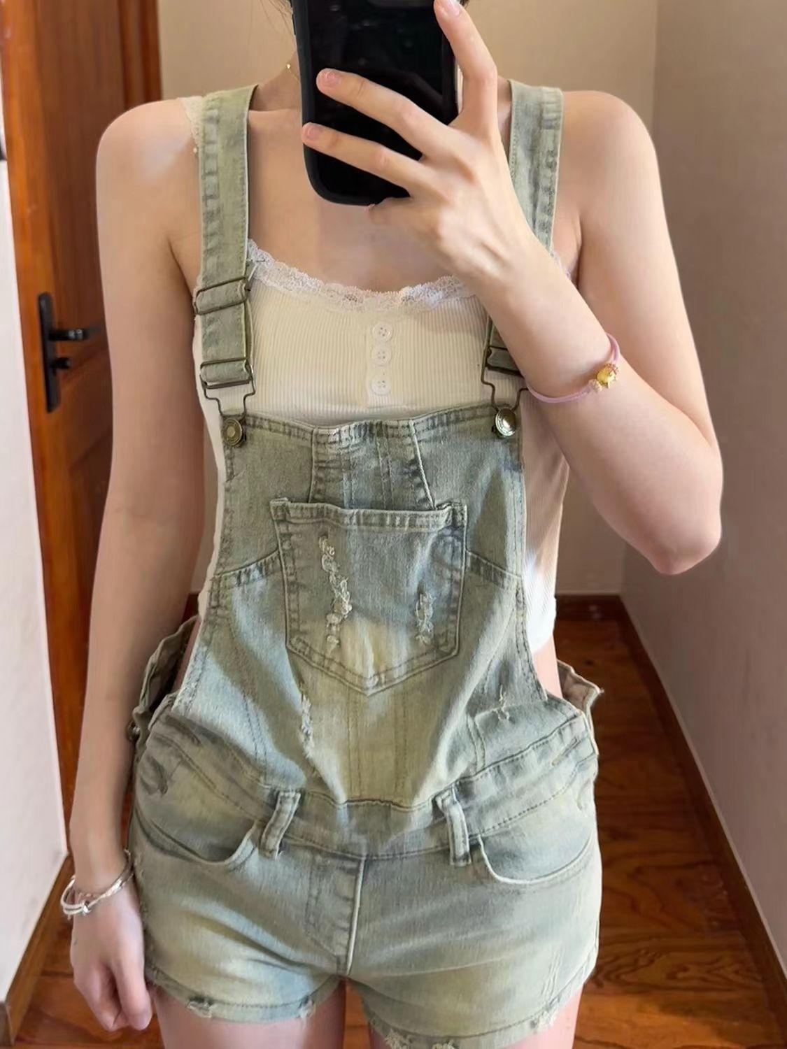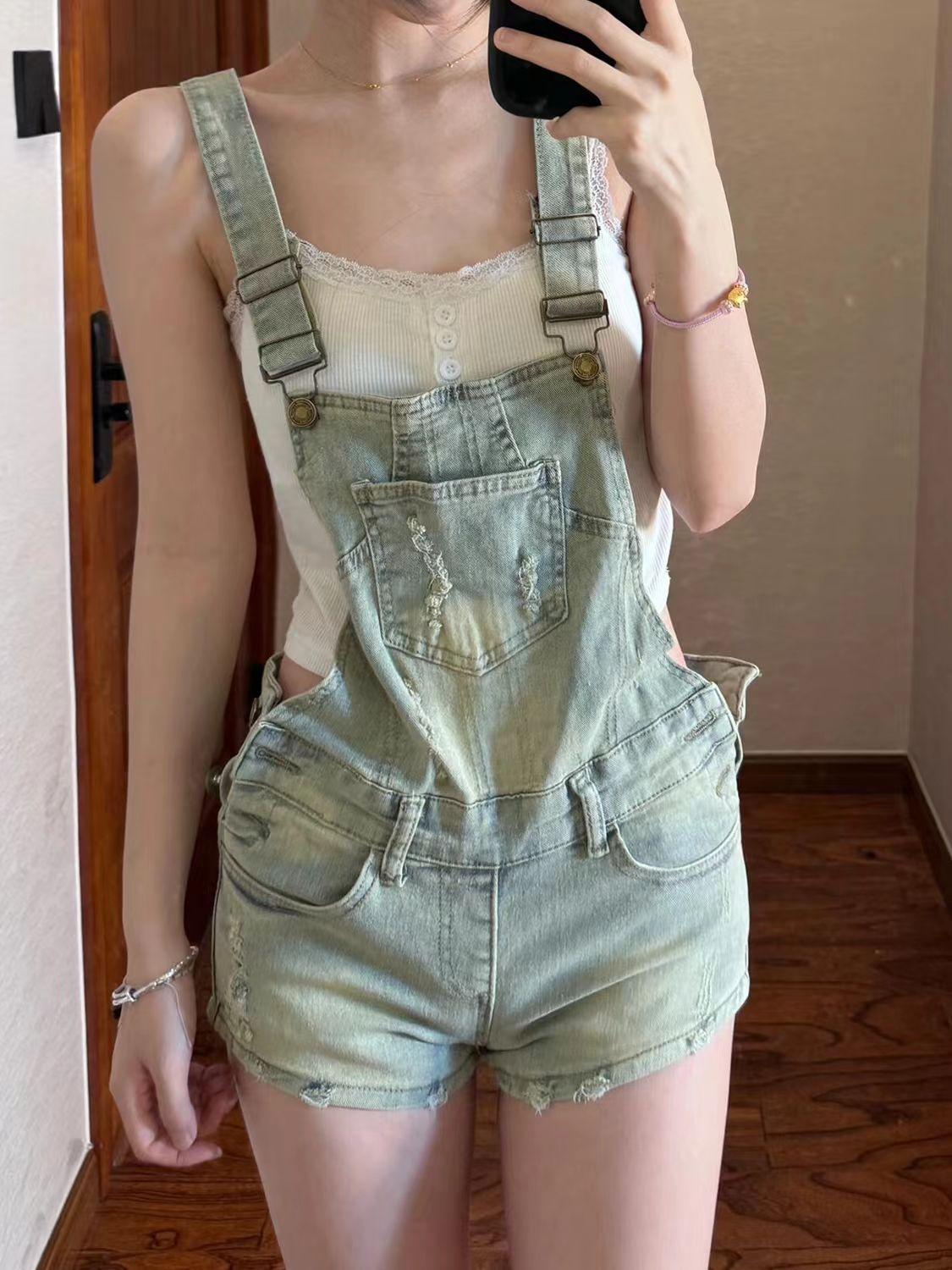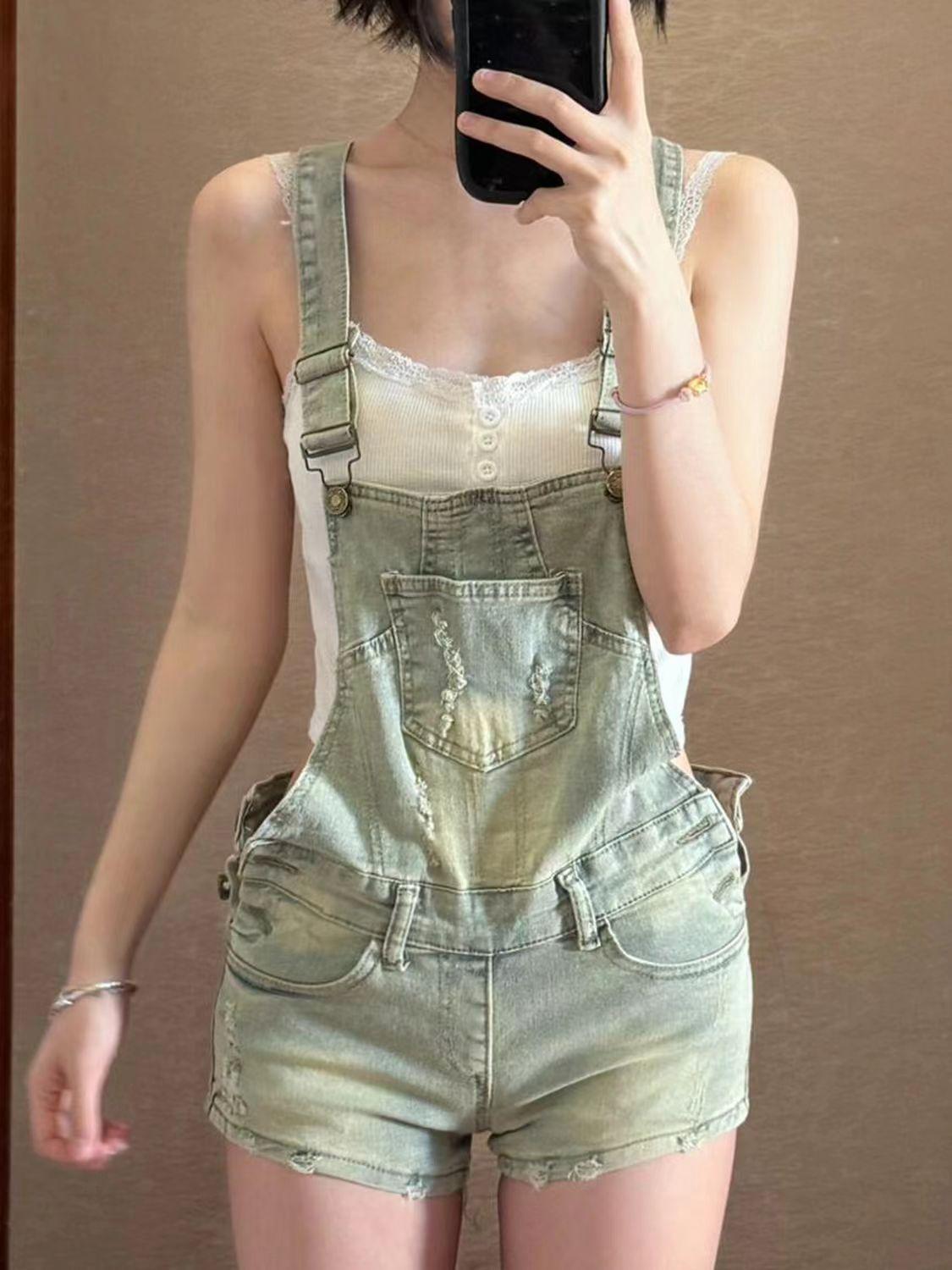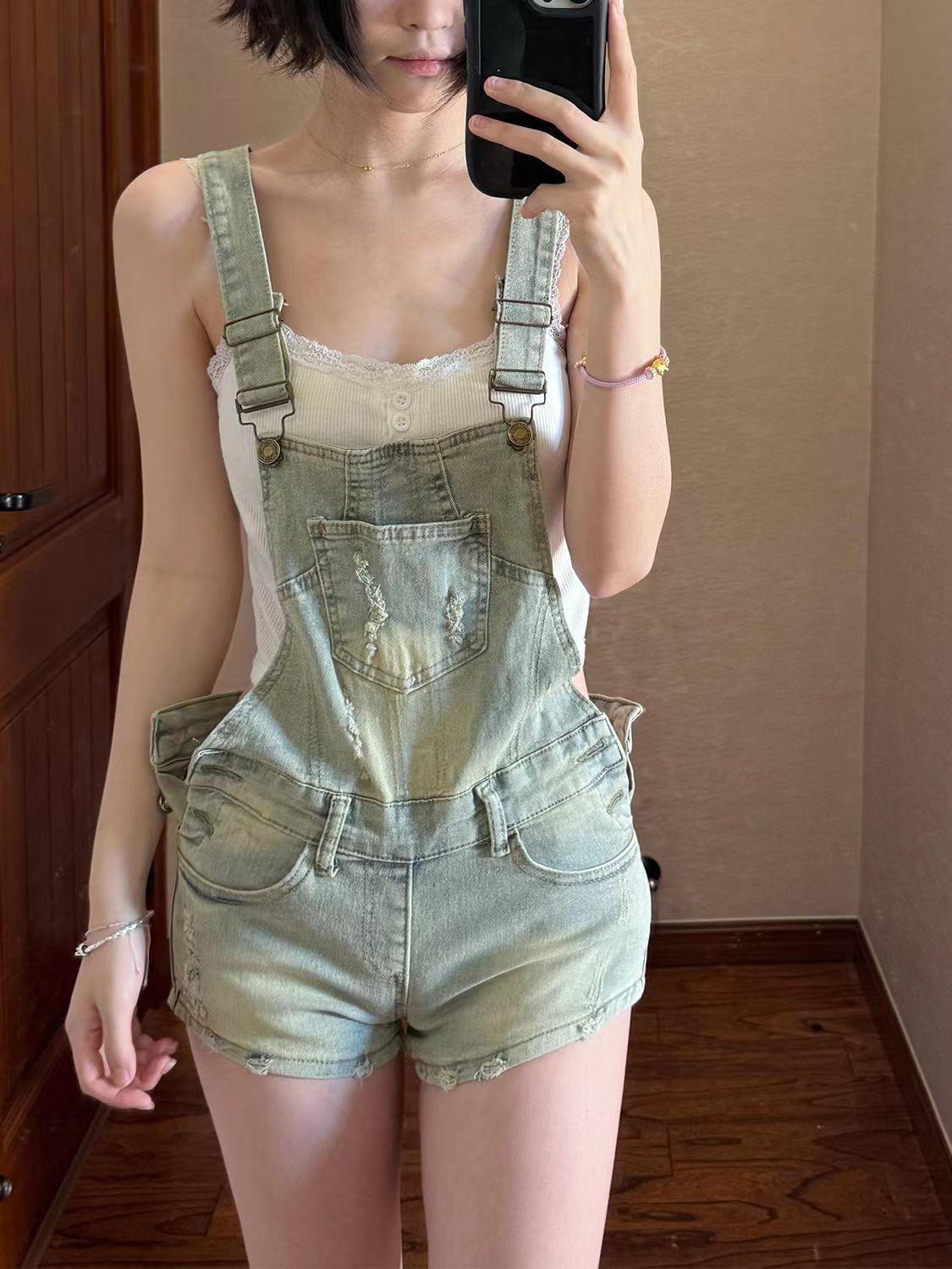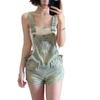 Overol de mezclilla vintage para mujer 2025 Nuevo verano Diseño petite ceñido a la cintura Mono corto roto