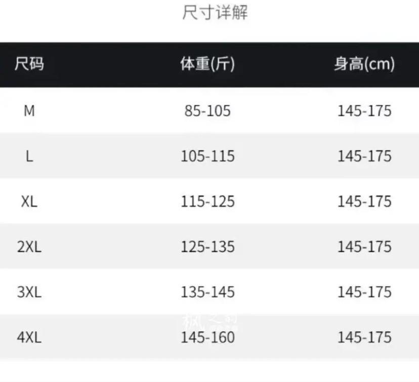 M 42.5-52.5kg, L 53-57.5kg, Xl 58-62.5kg, 2xl 63-67.5kg, 3xl 68-72.5kg, 4xl 73-77.5kg, 5xl 78-85kg