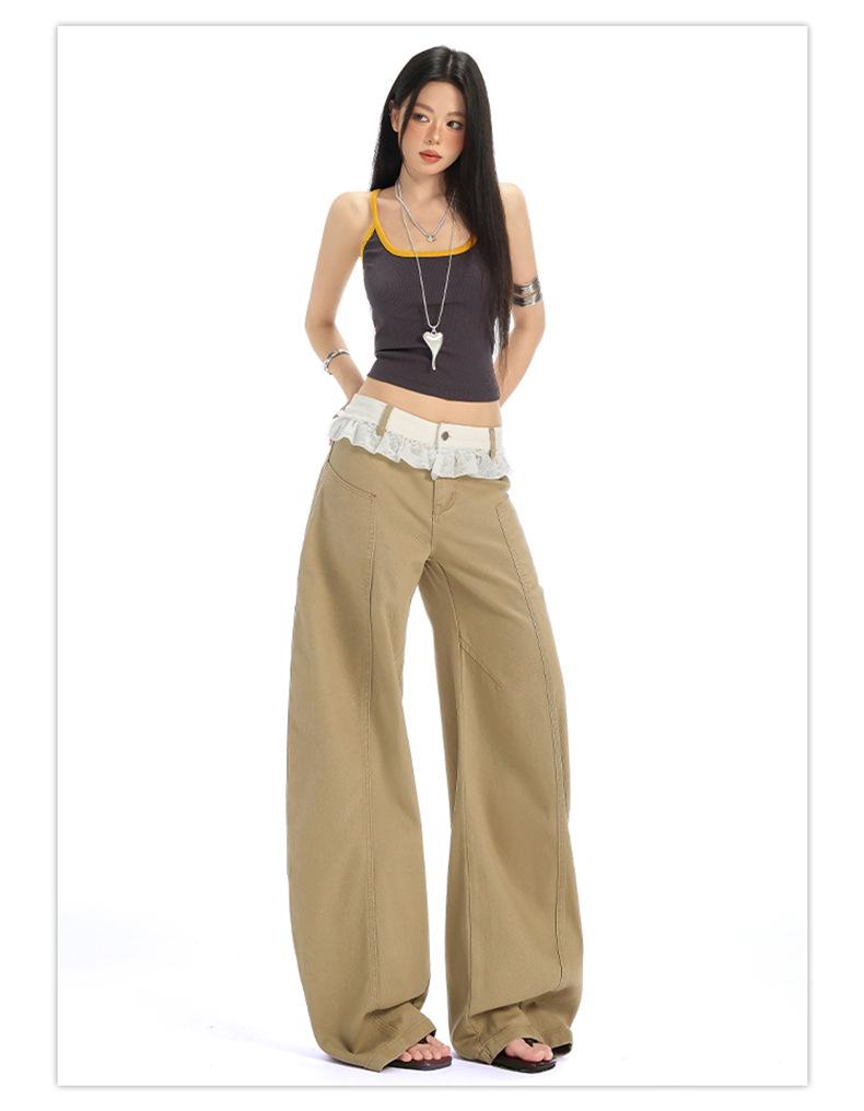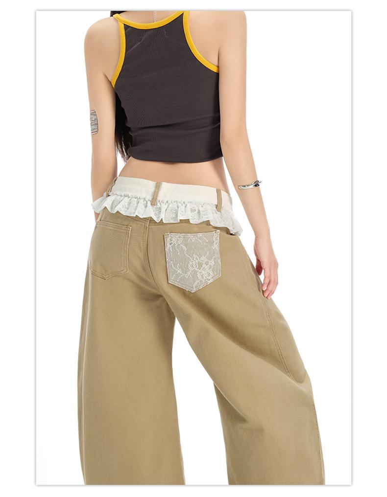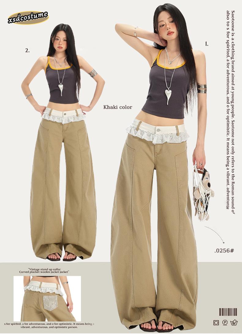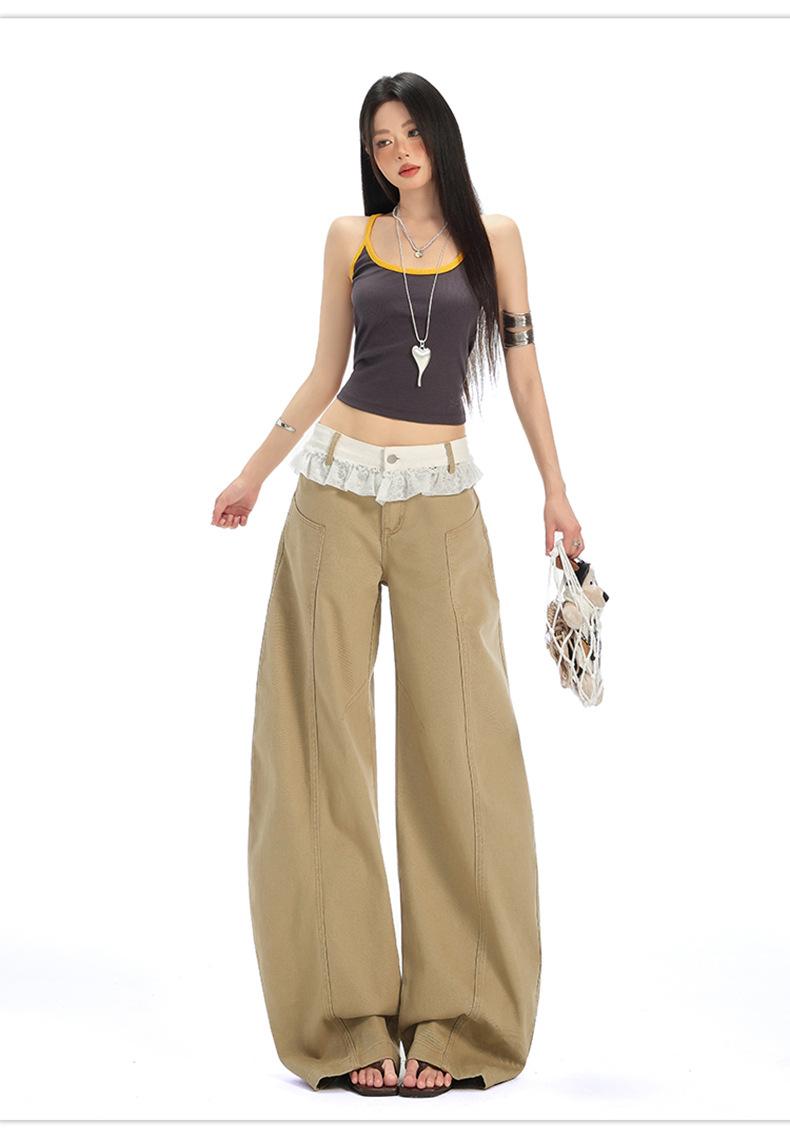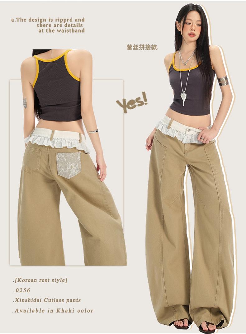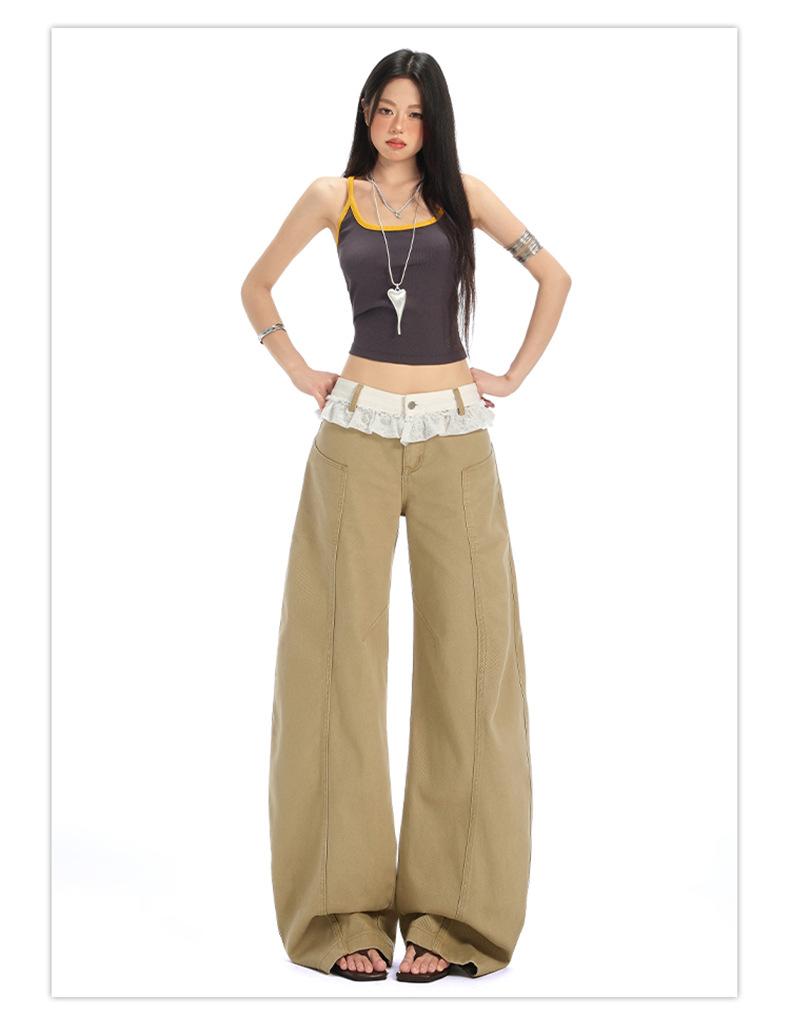 Ropa de Mujer de Seda Naranja # Encaje Empalmado Jeans Caqui de Cintura Baja Verano Nuevo Suelto Pierna Ancha Pantalones Cimitarra