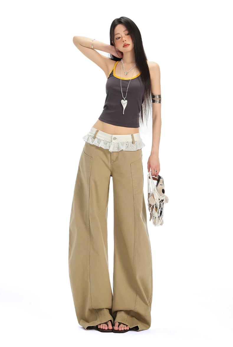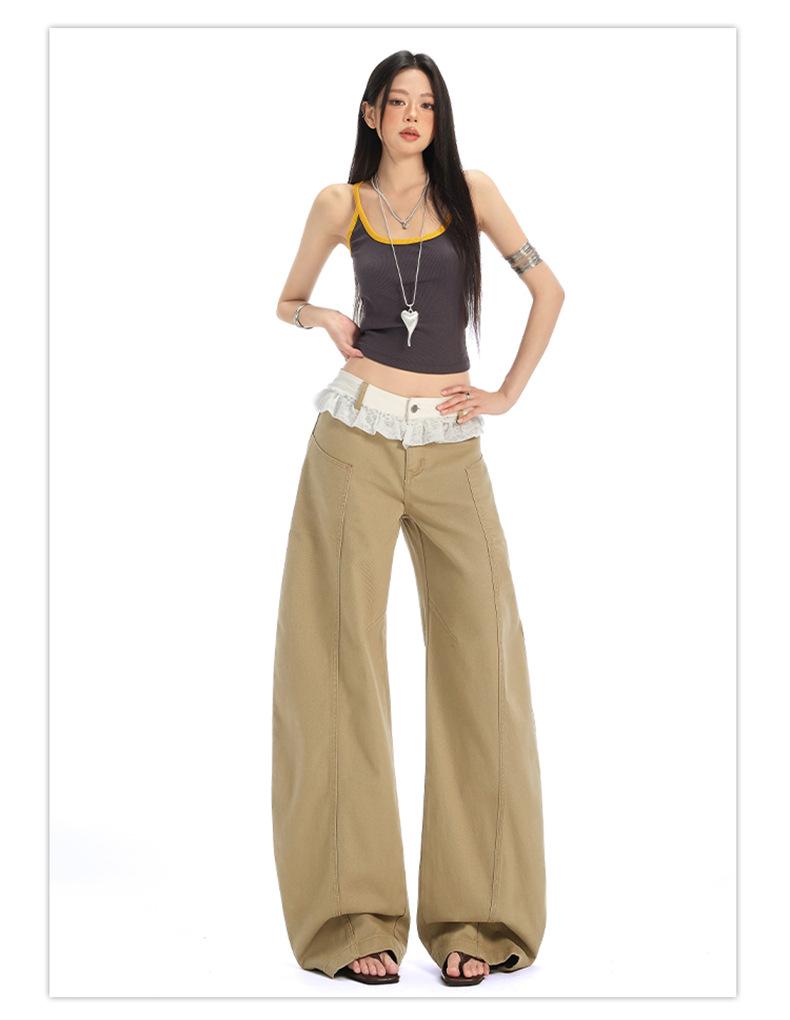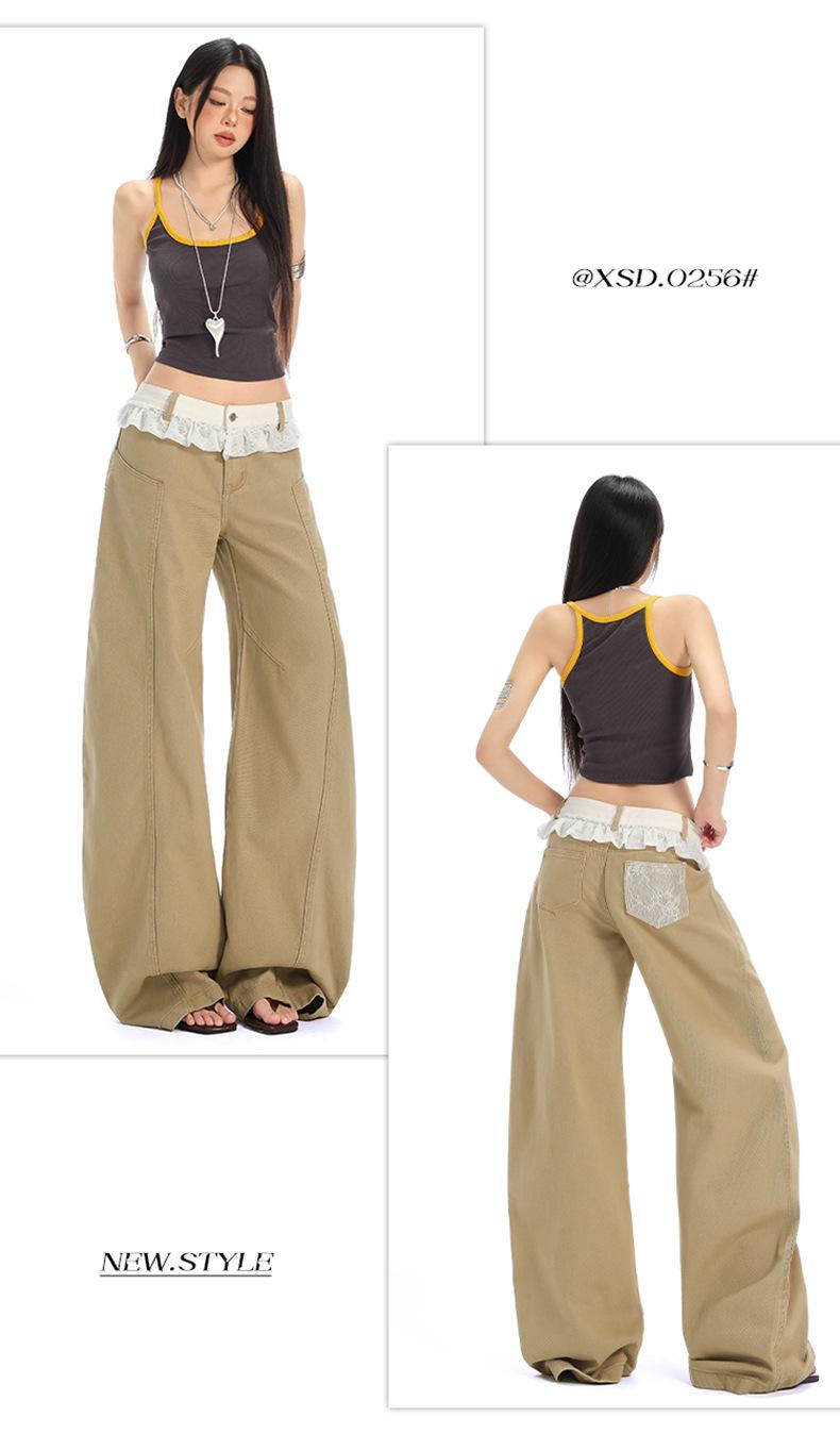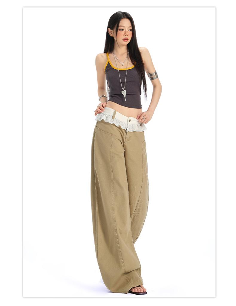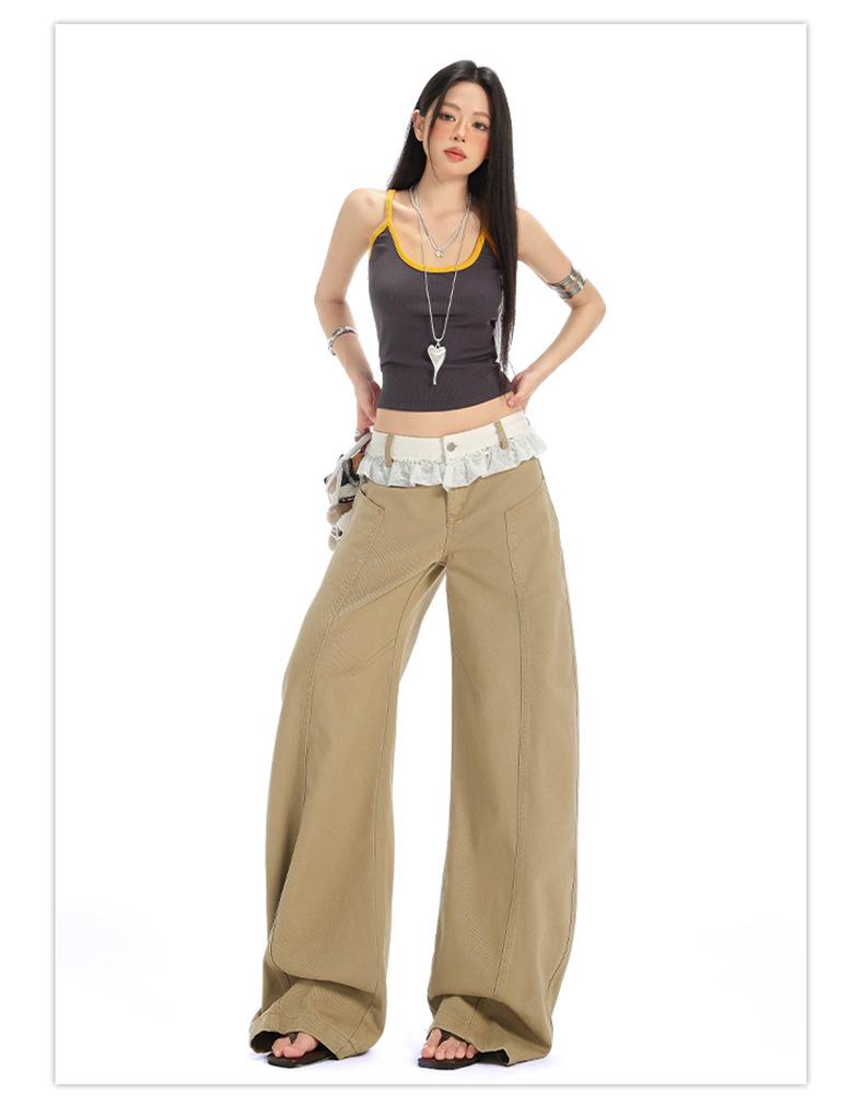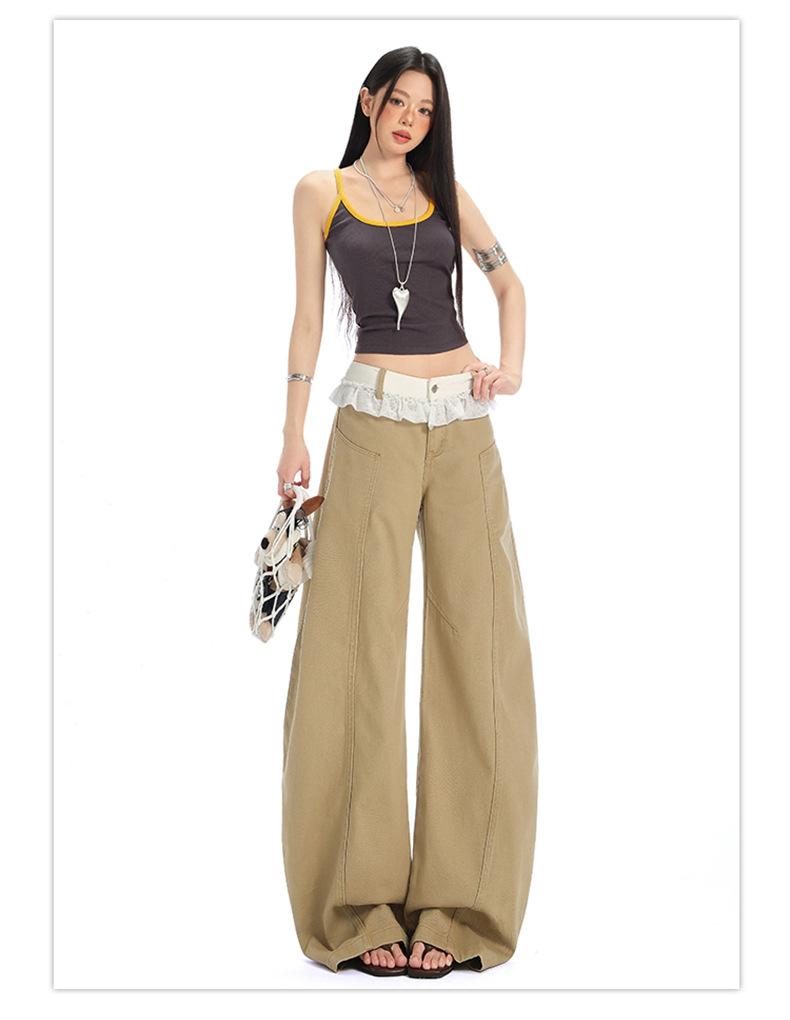 Ropa de Mujer de Seda Naranja # Encaje Empalmado Jeans Caqui de Cintura Baja Verano Nuevo Suelto Pierna Ancha Pantalones Cimitarra