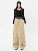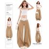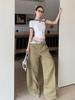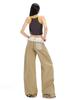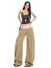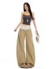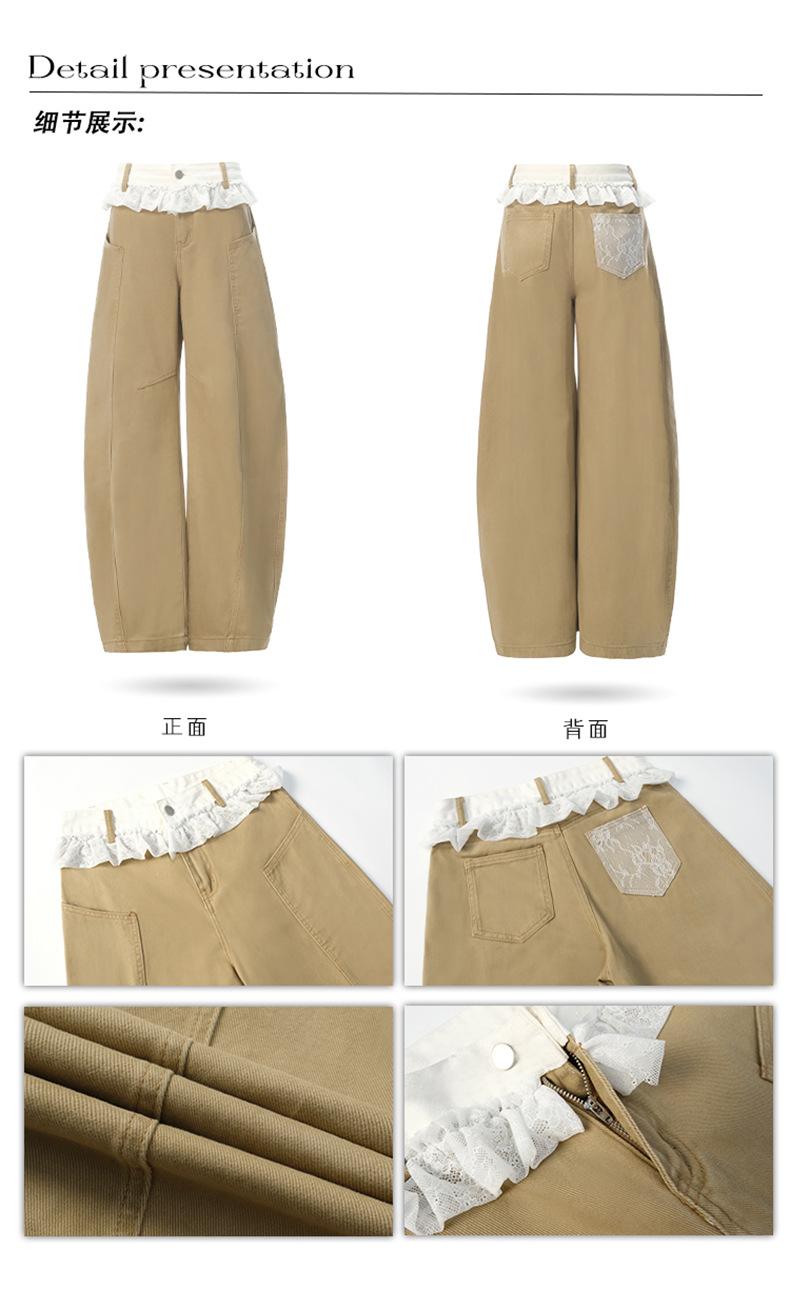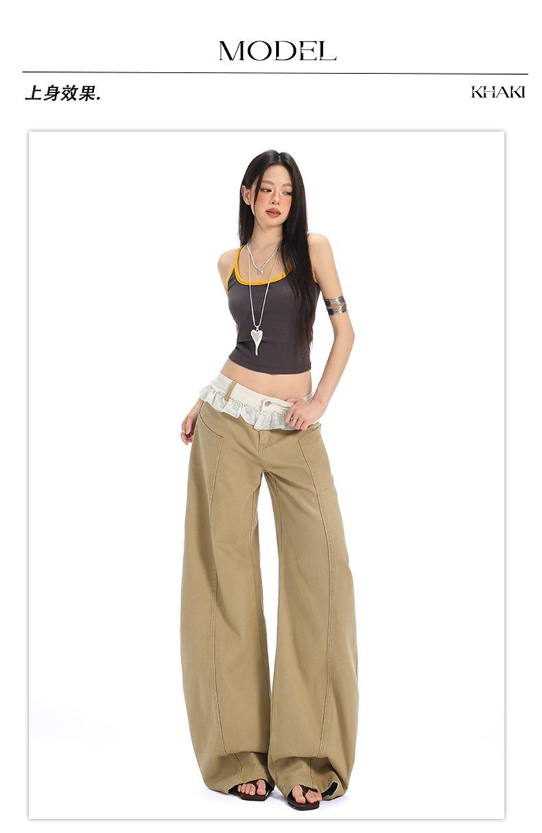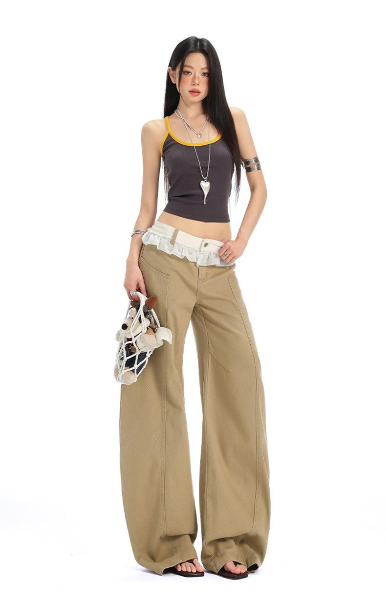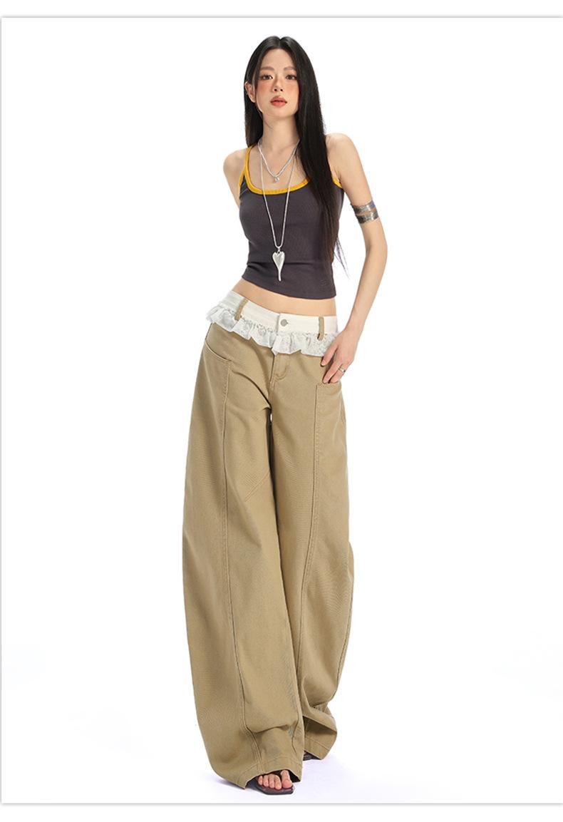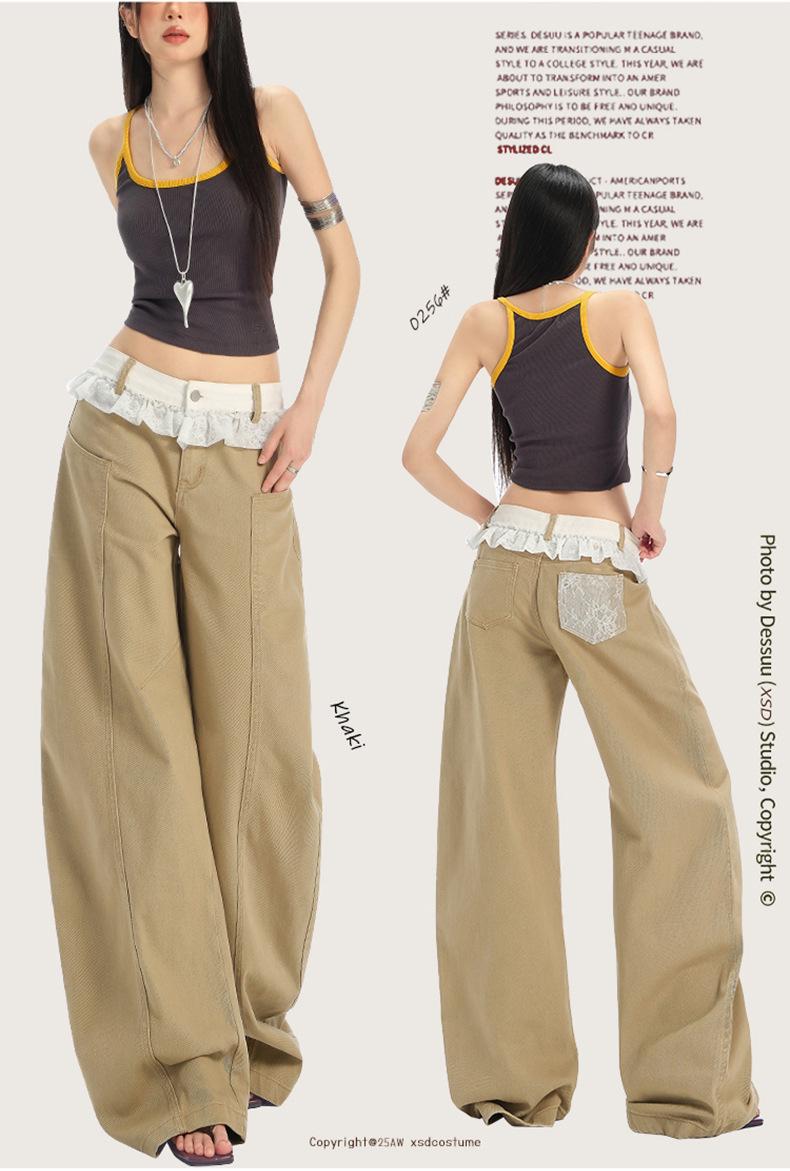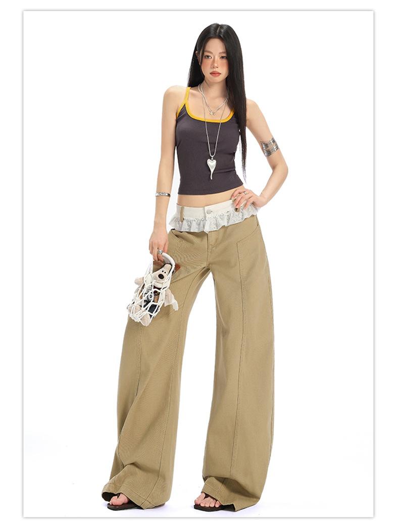Ropa de Mujer de Seda Naranja # Encaje Empalmado Jeans Caqui de Cintura Baja Verano Nuevo Suelto Pierna Ancha Pantalones Cimitarra