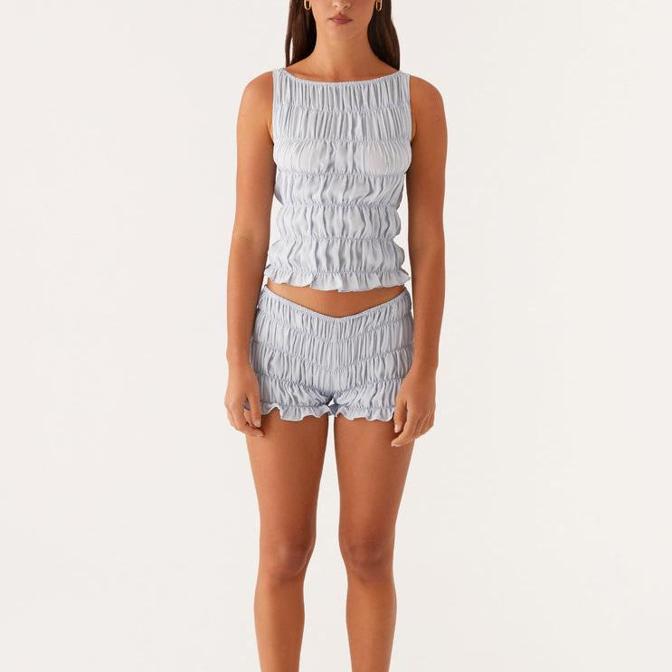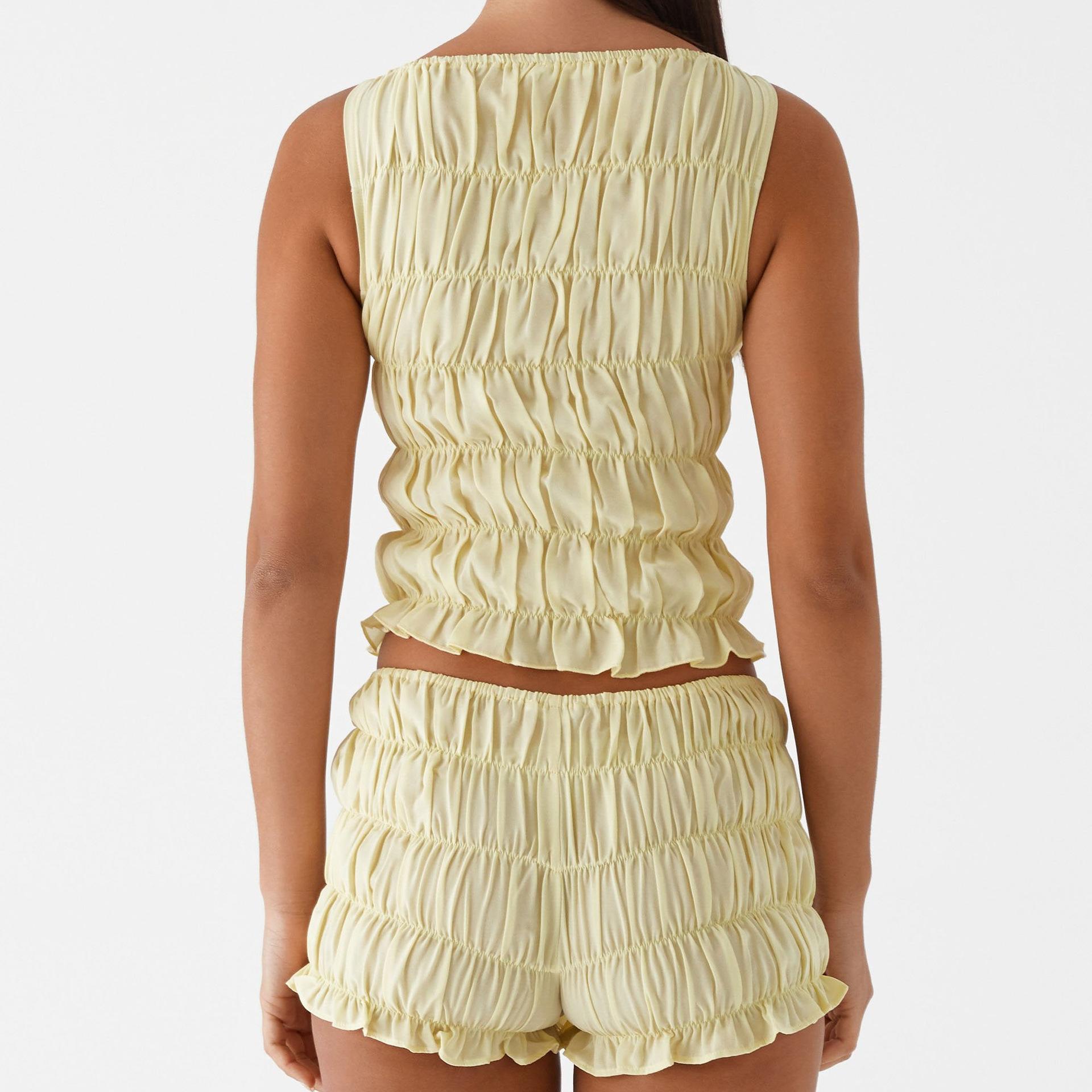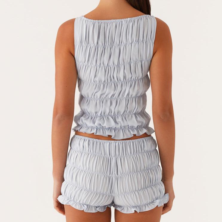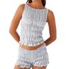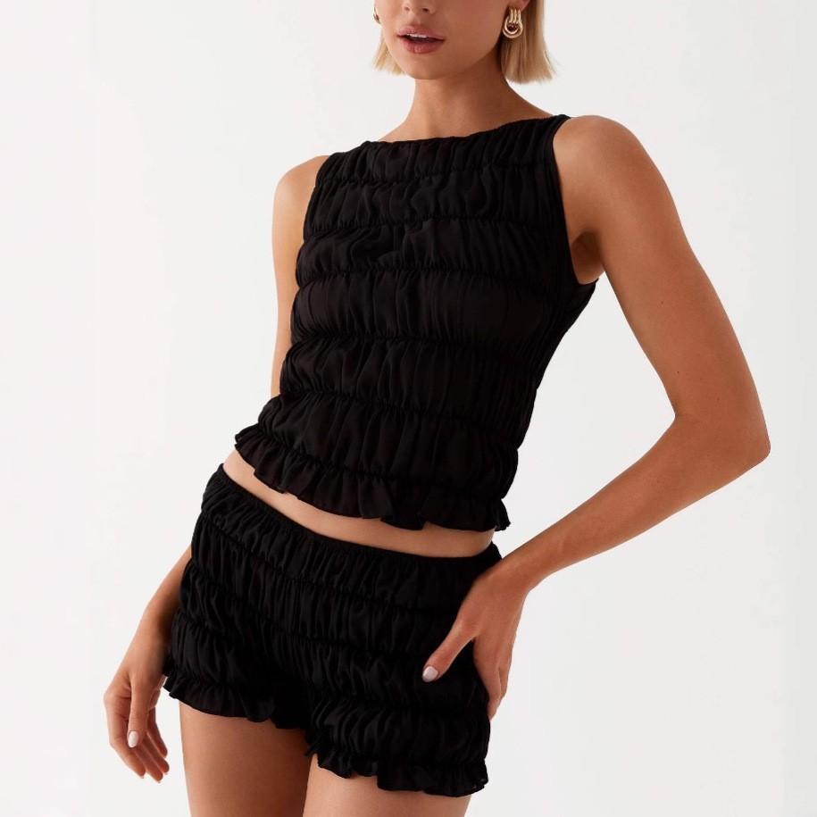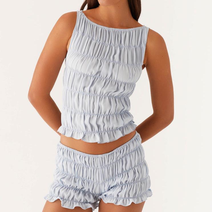 Traje de Chaleco y Shorts Casuales para Mujer Europeo y Americano 2025 Vacaciones Playa Sin Mangas Ombligo Borde Enrollado Plisado