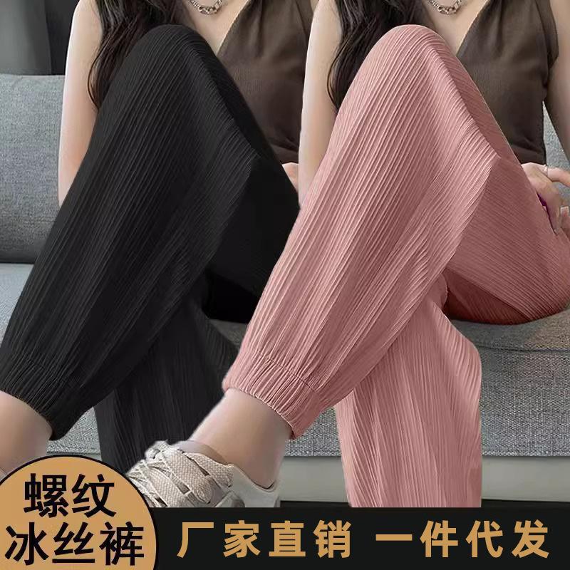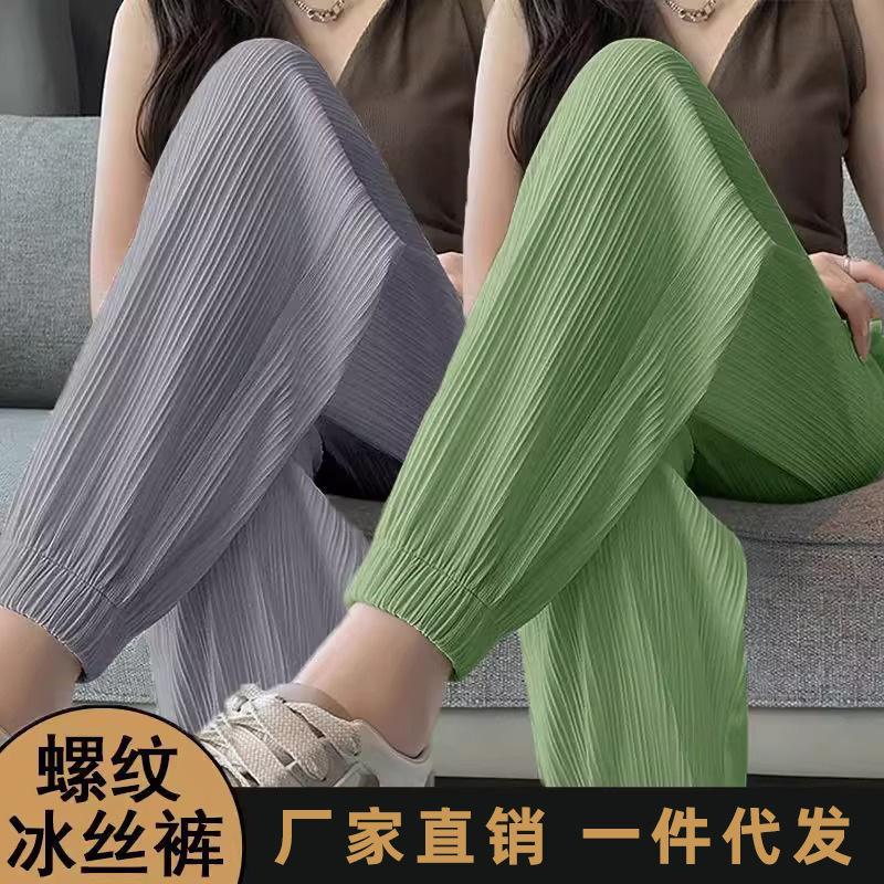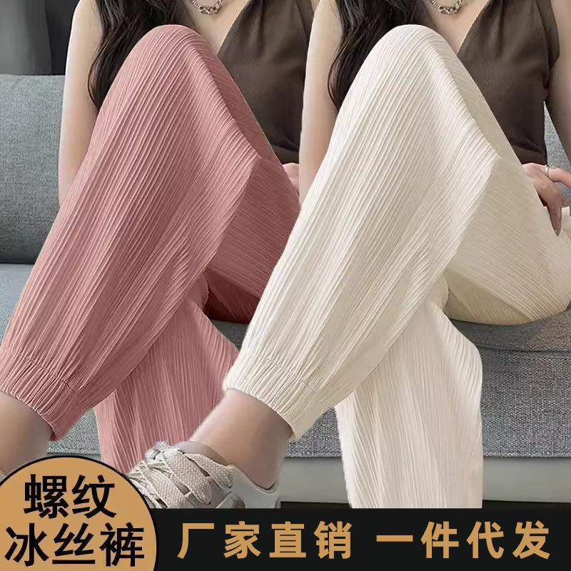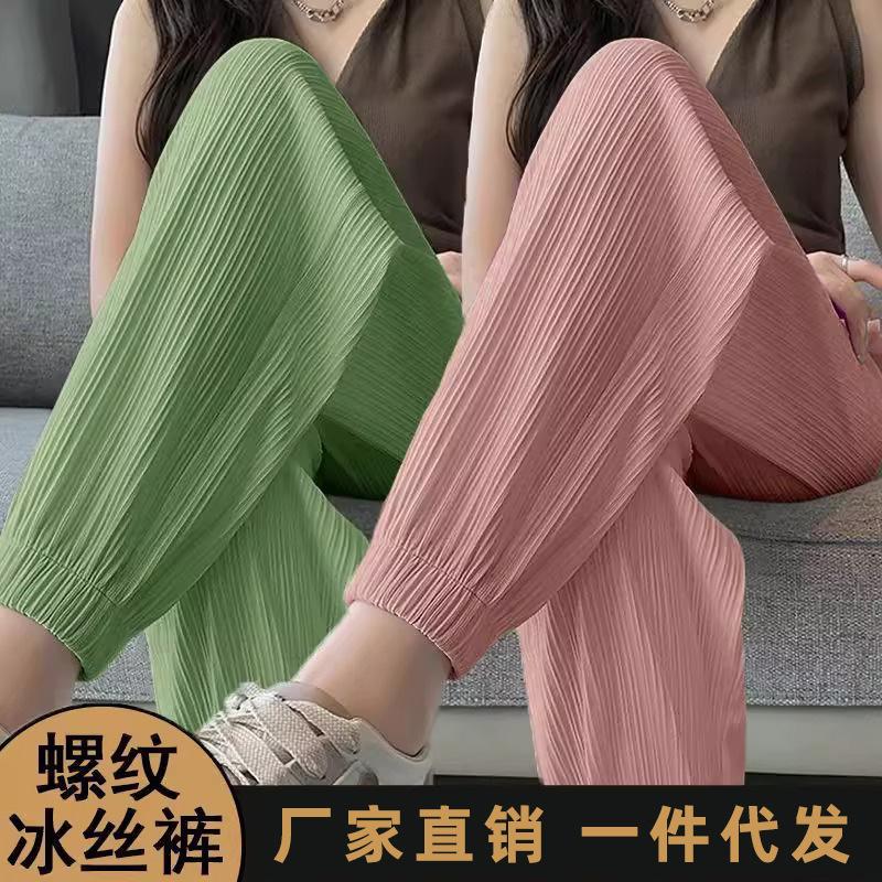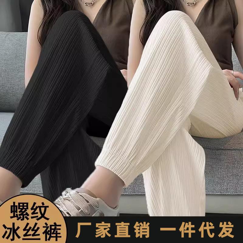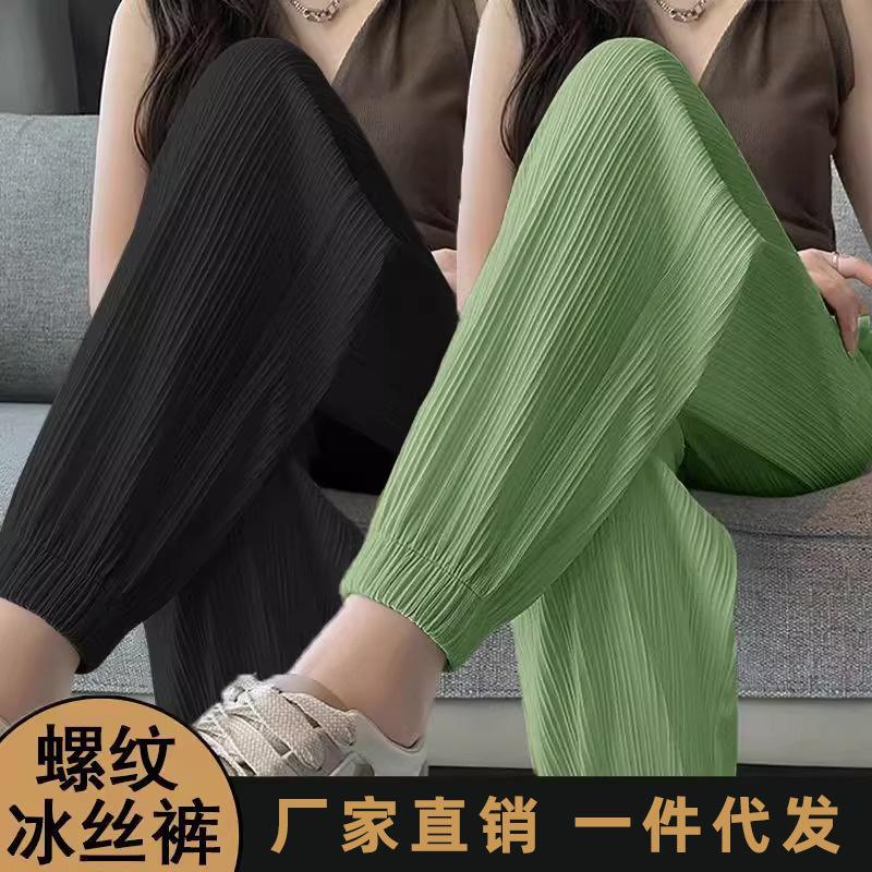 Verano Nuevo Estilo Petite Pantalones Casuales Tipo Linterna de Seda de Hielo para Mujer, Pantalones Casuales Recortados Adelgazantes de Cintura Alta con Diseño Drapeado de Pierna Ancha