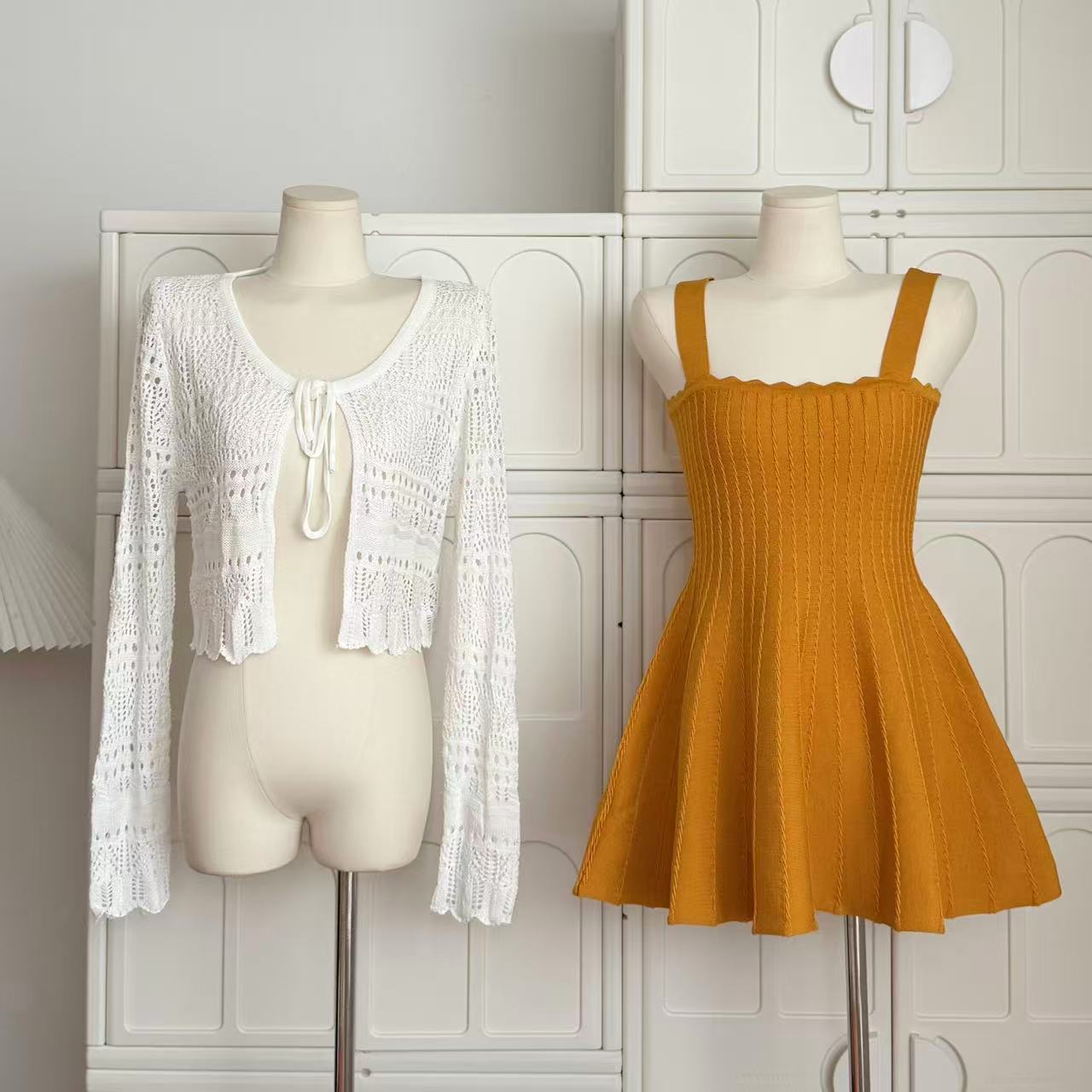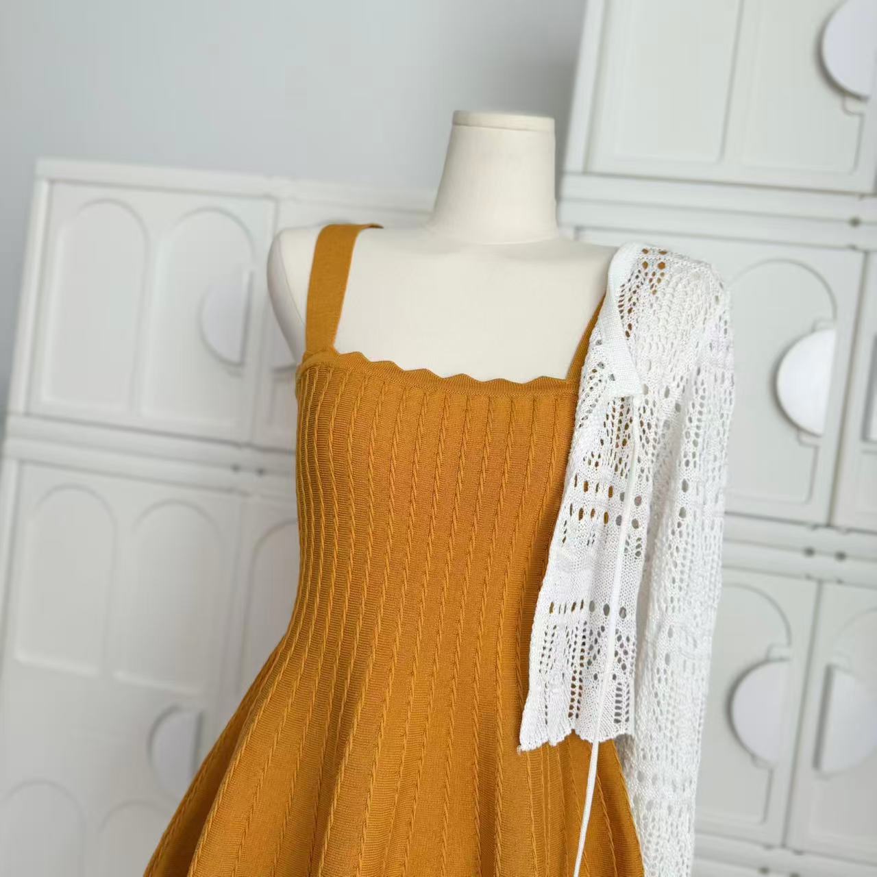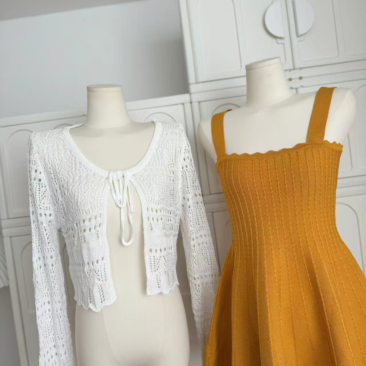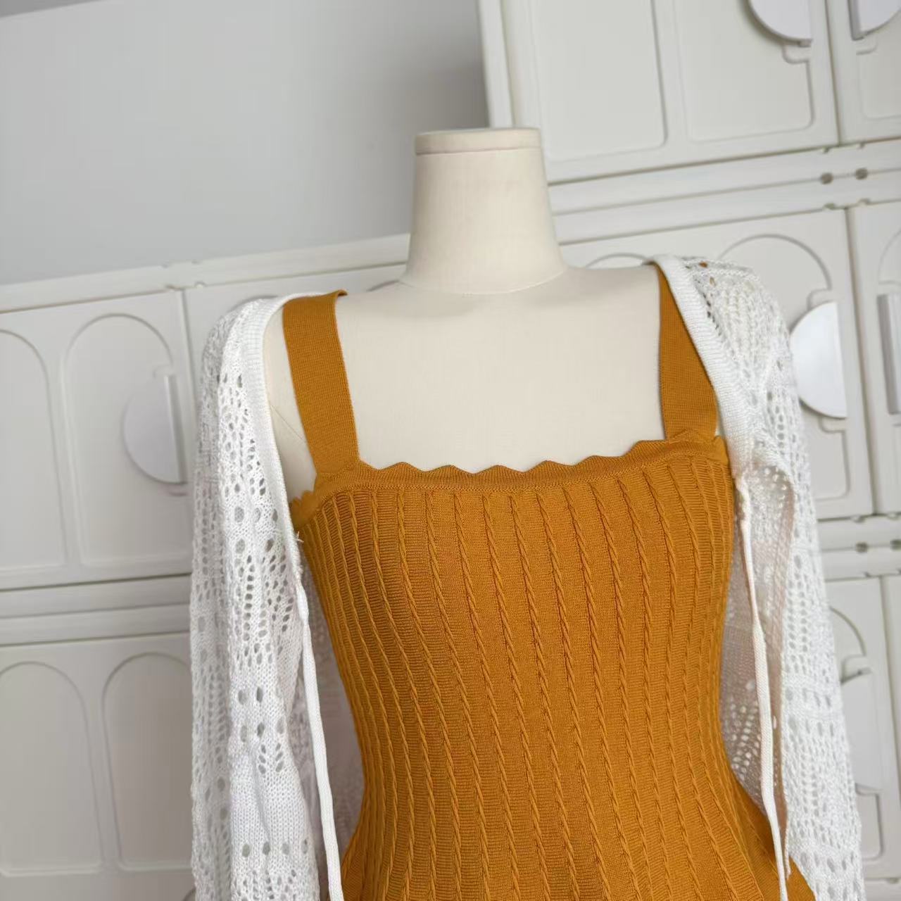 -1 orange dress, -2 white cardigans