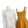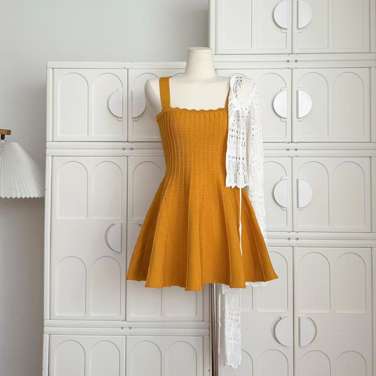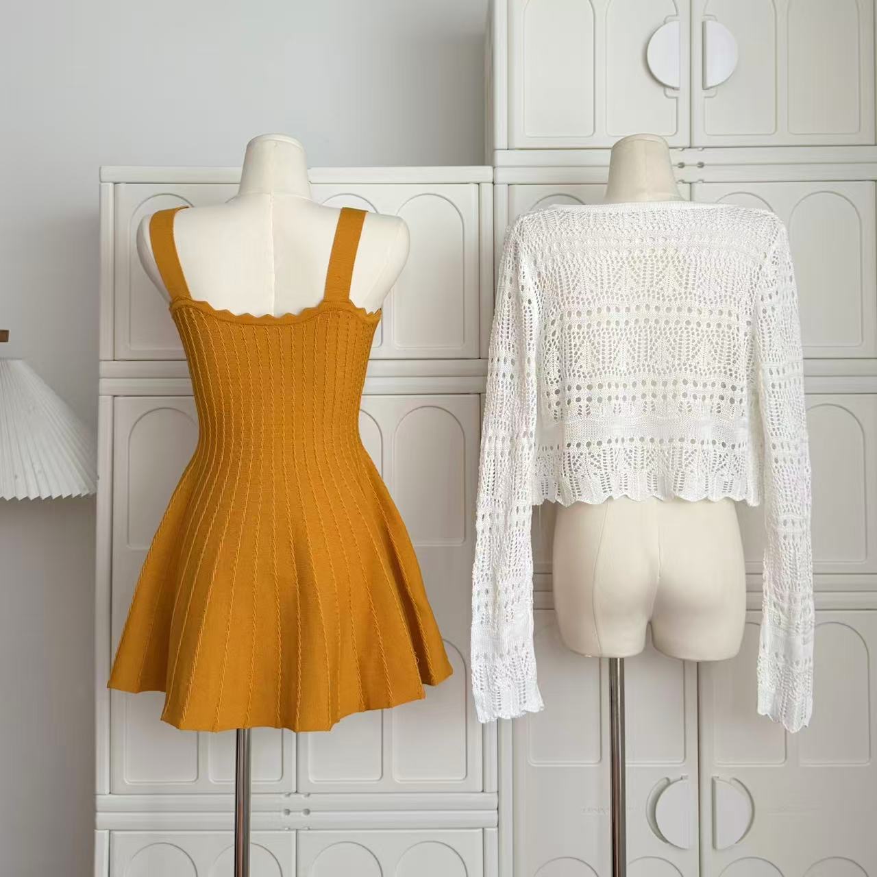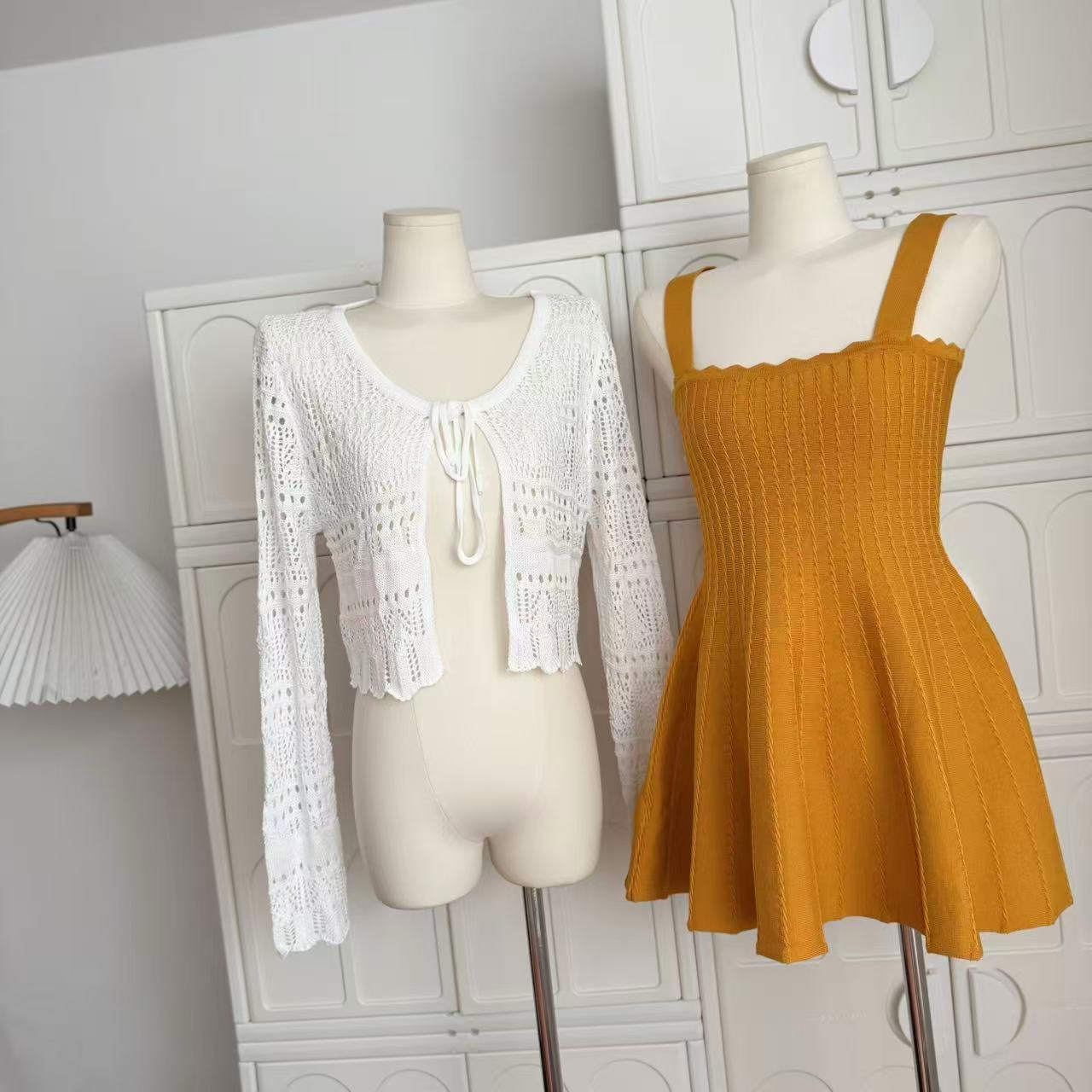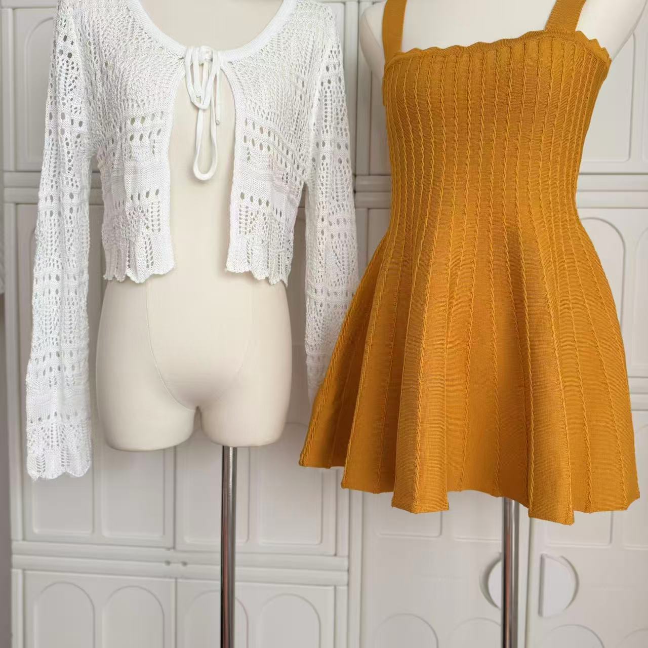 -1 orange dress, -2 white cardigans