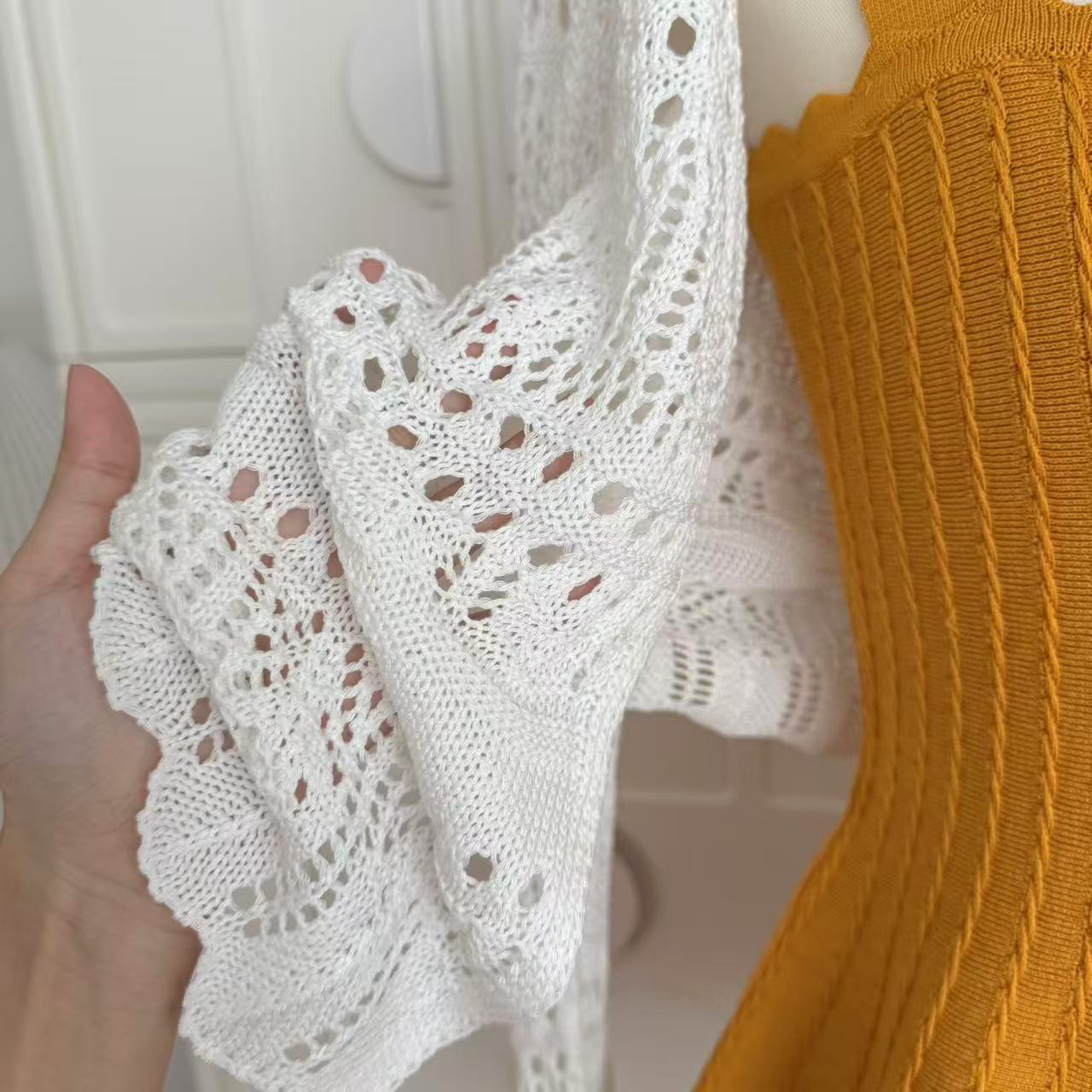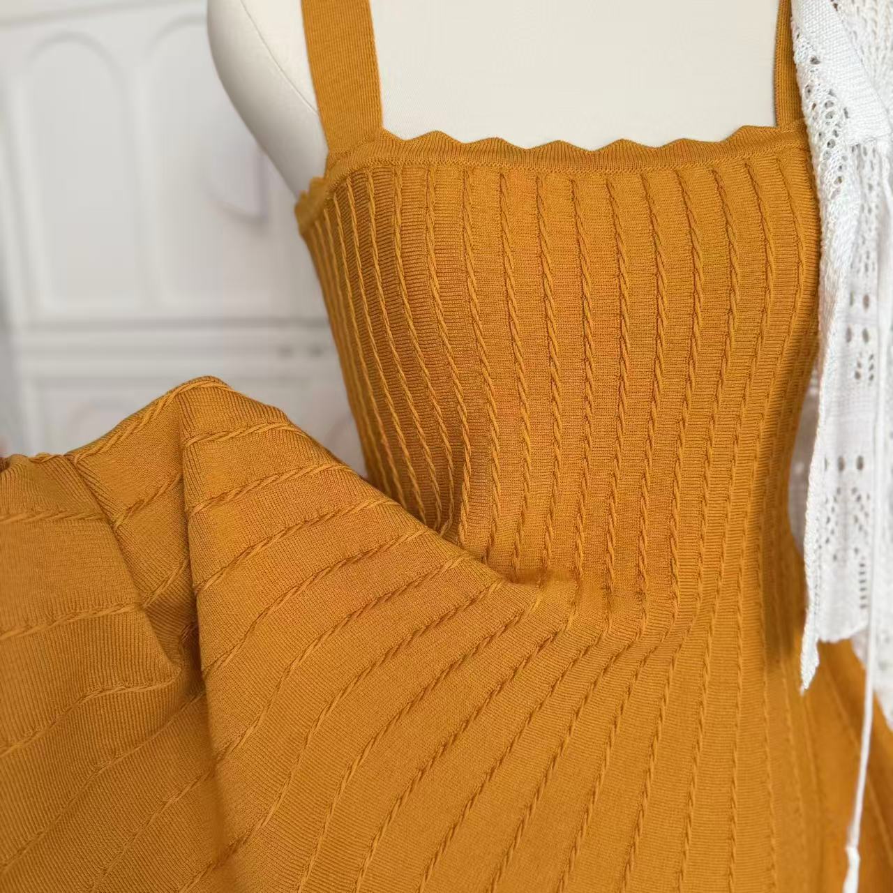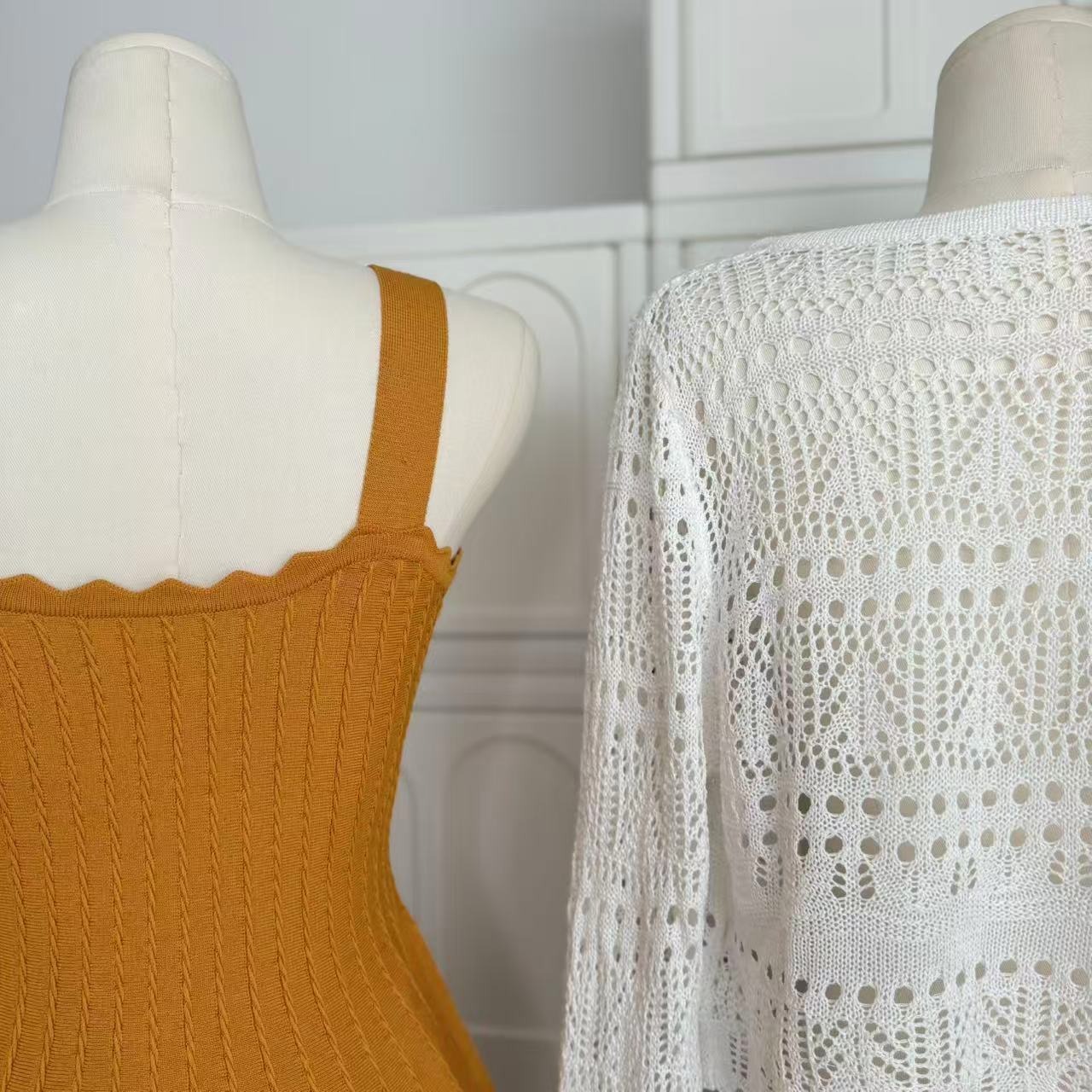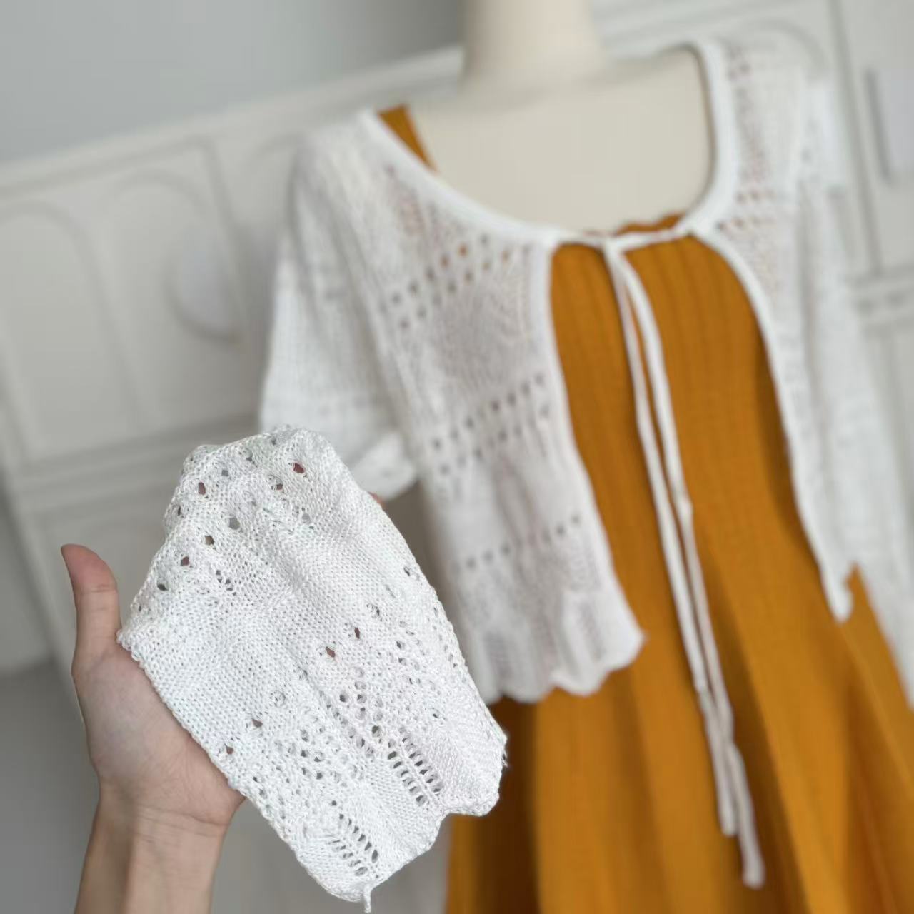 -1 orange dress, -2 white cardigans