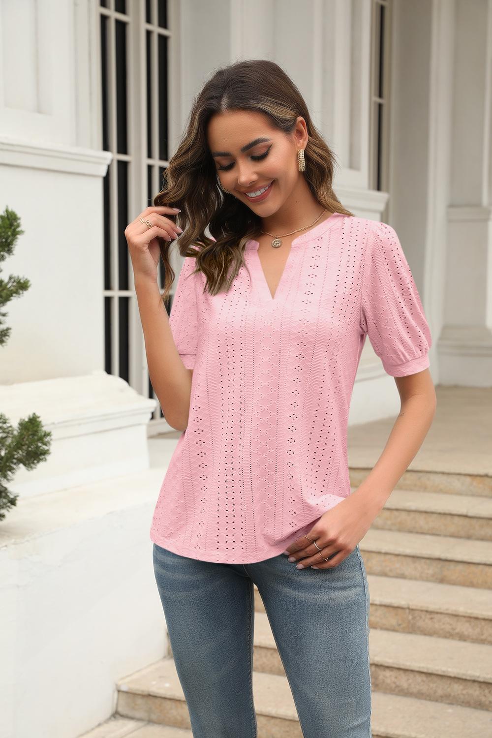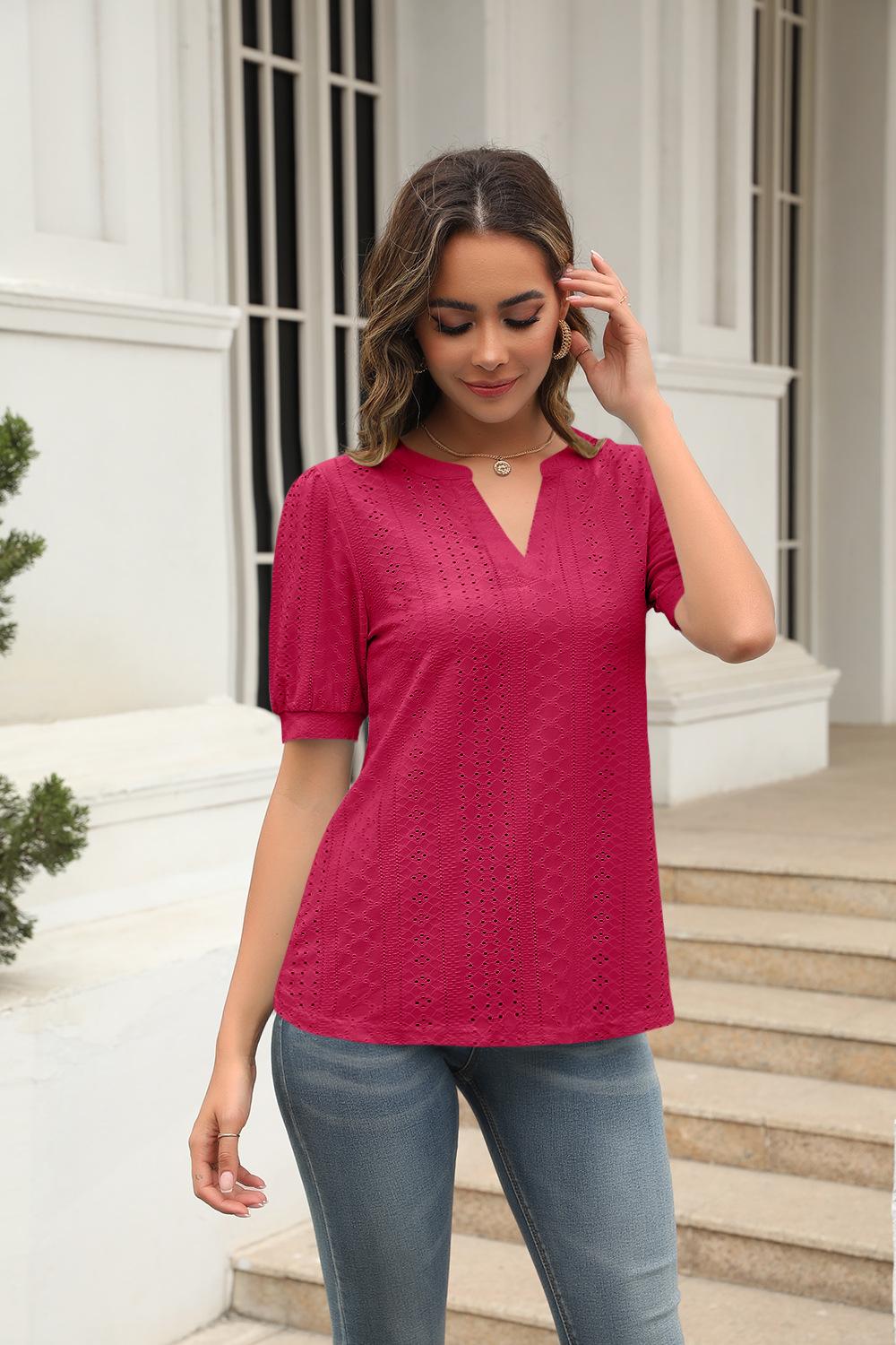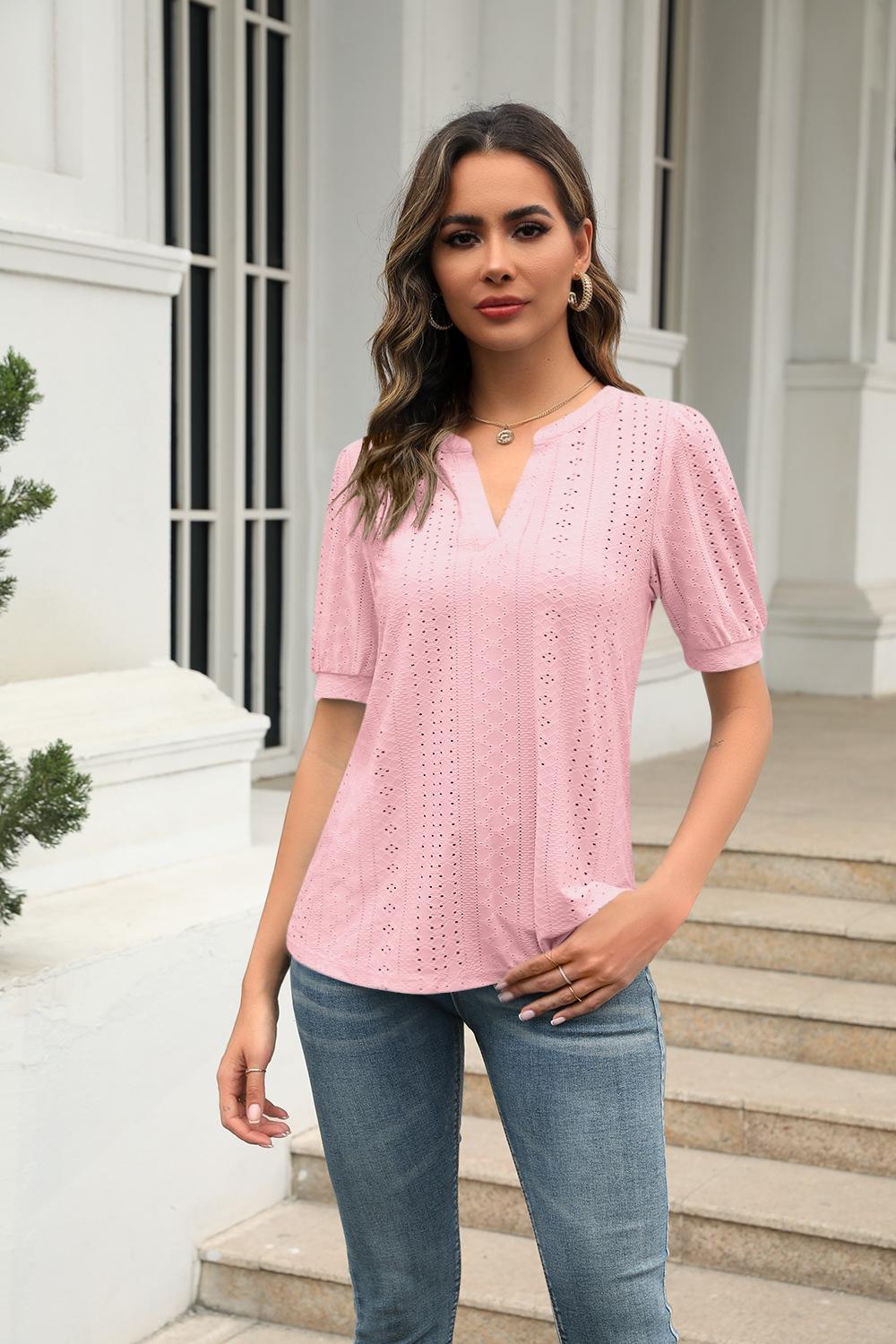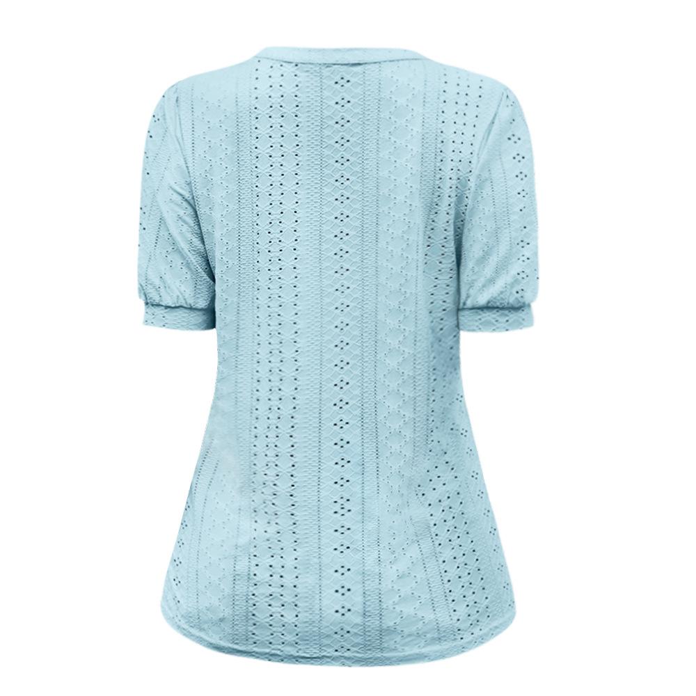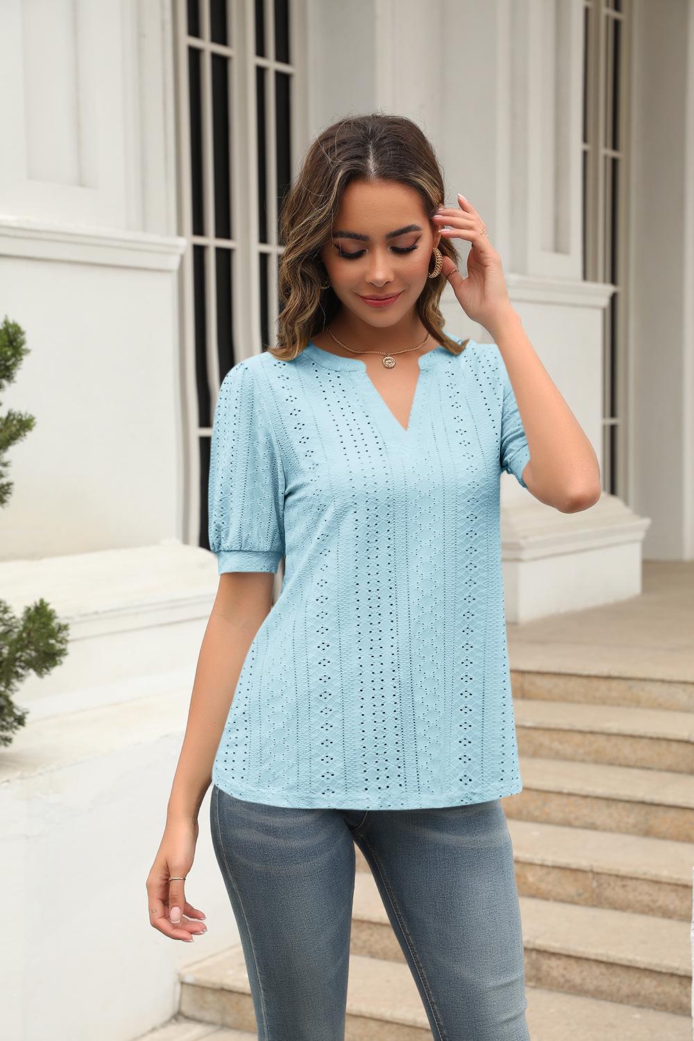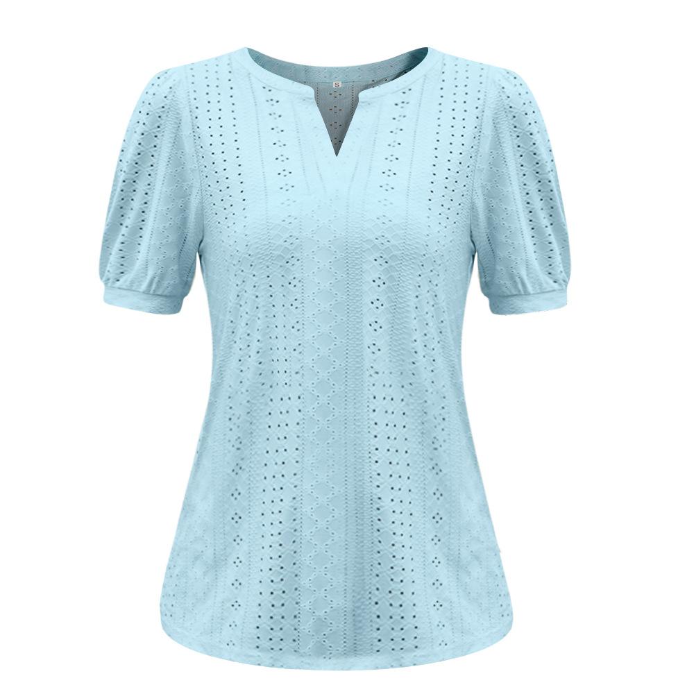 Camiseta Holgada de Verano Casual Europea y Americana 2023 con Cuello en V de Color Sólido Calada Manga Abullonada