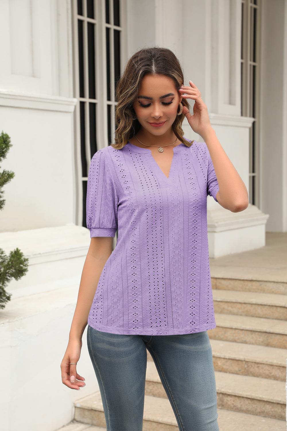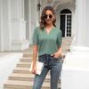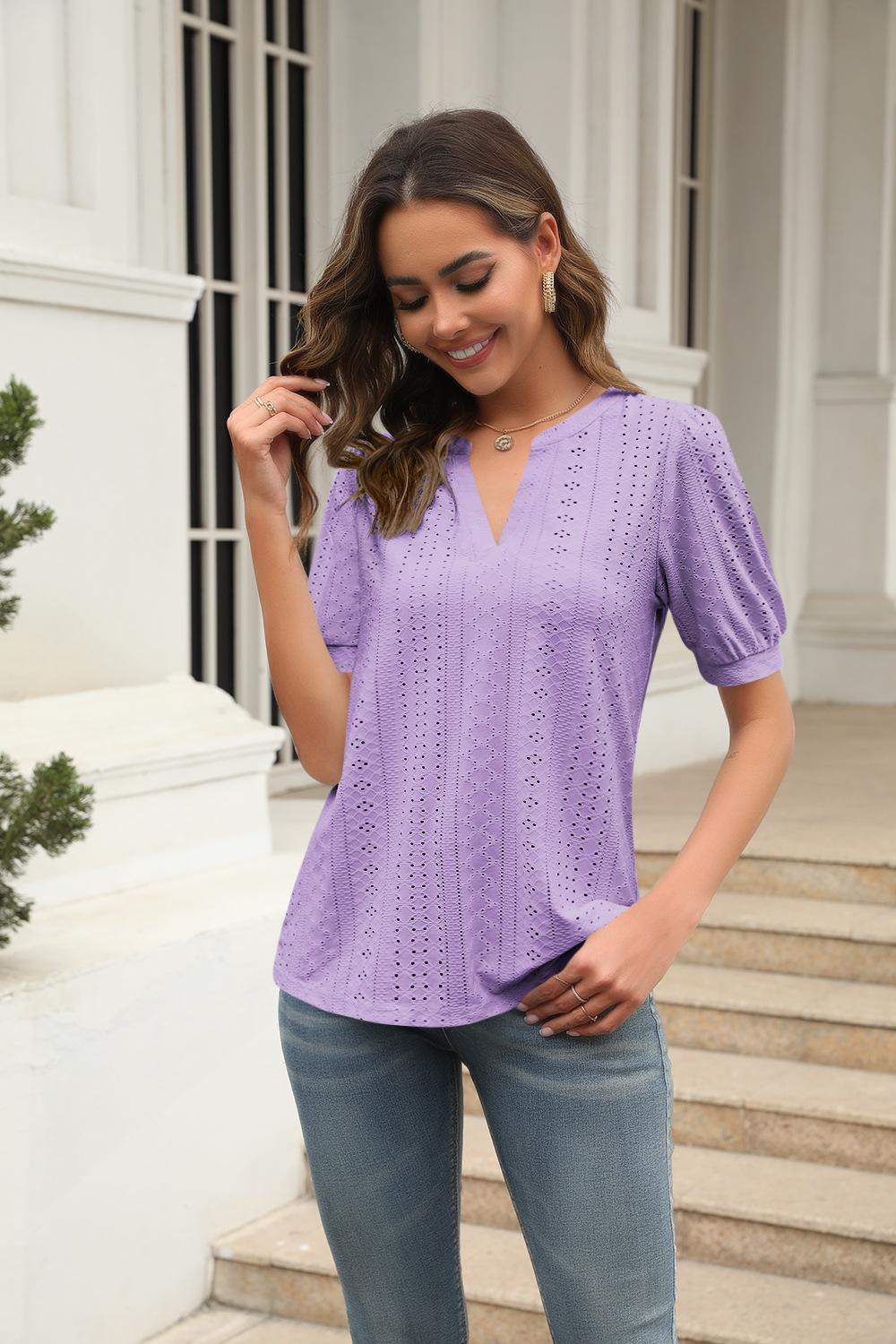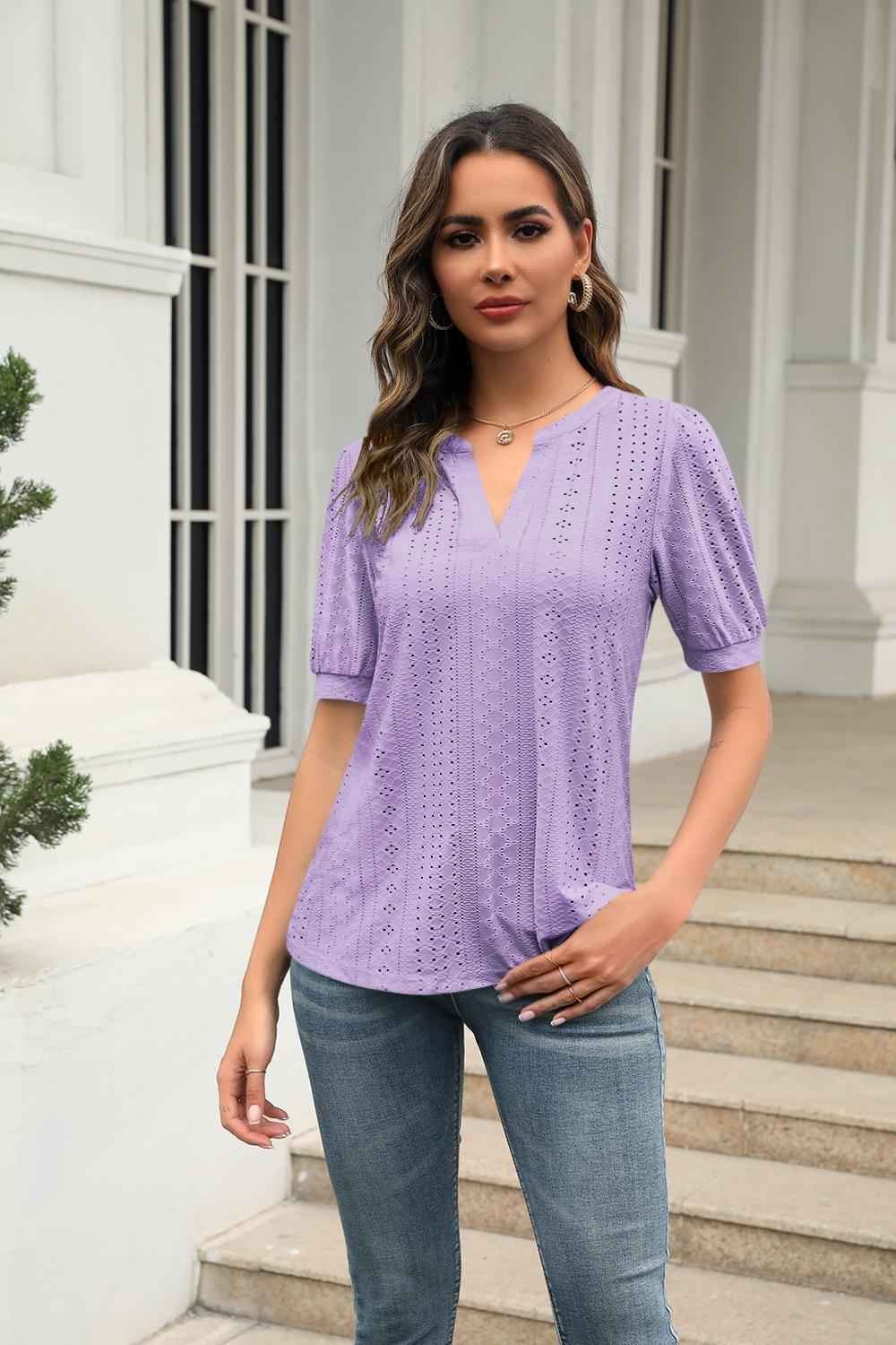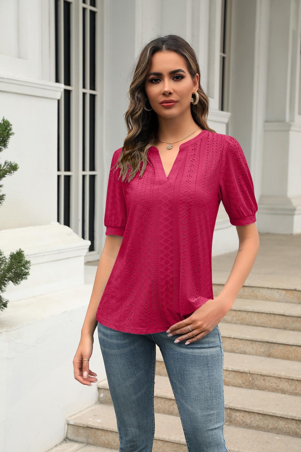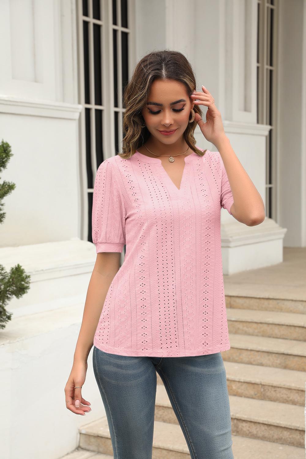 Camiseta Holgada de Verano Casual Europea y Americana 2023 con Cuello en V de Color Sólido Calada Manga Abullonada