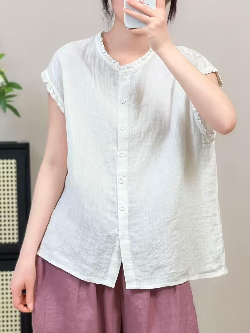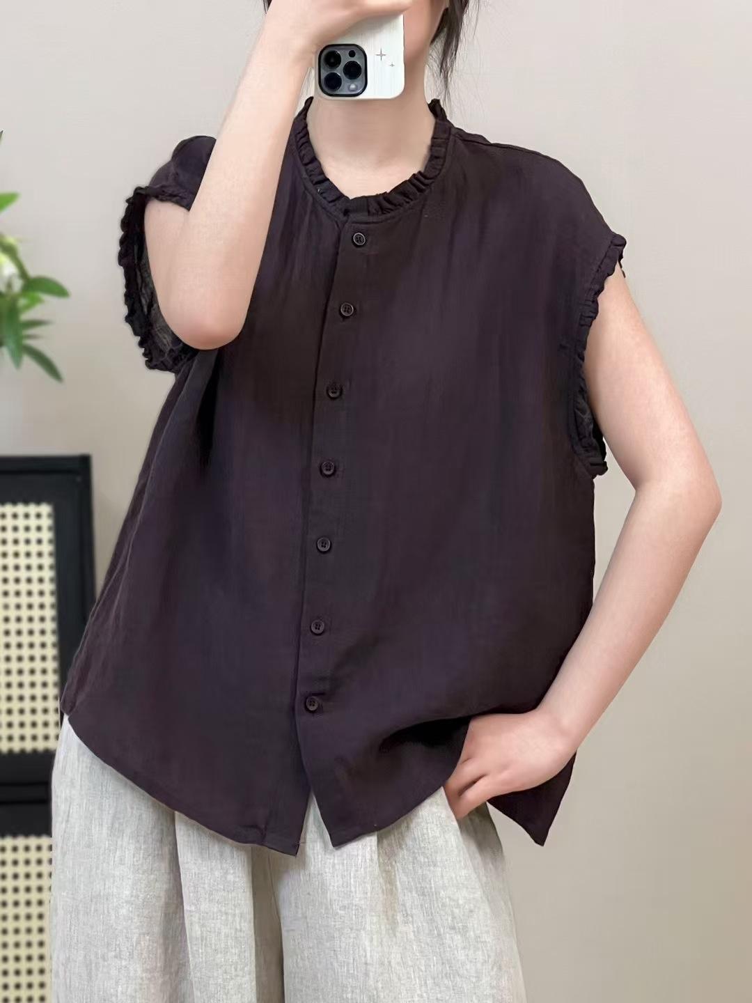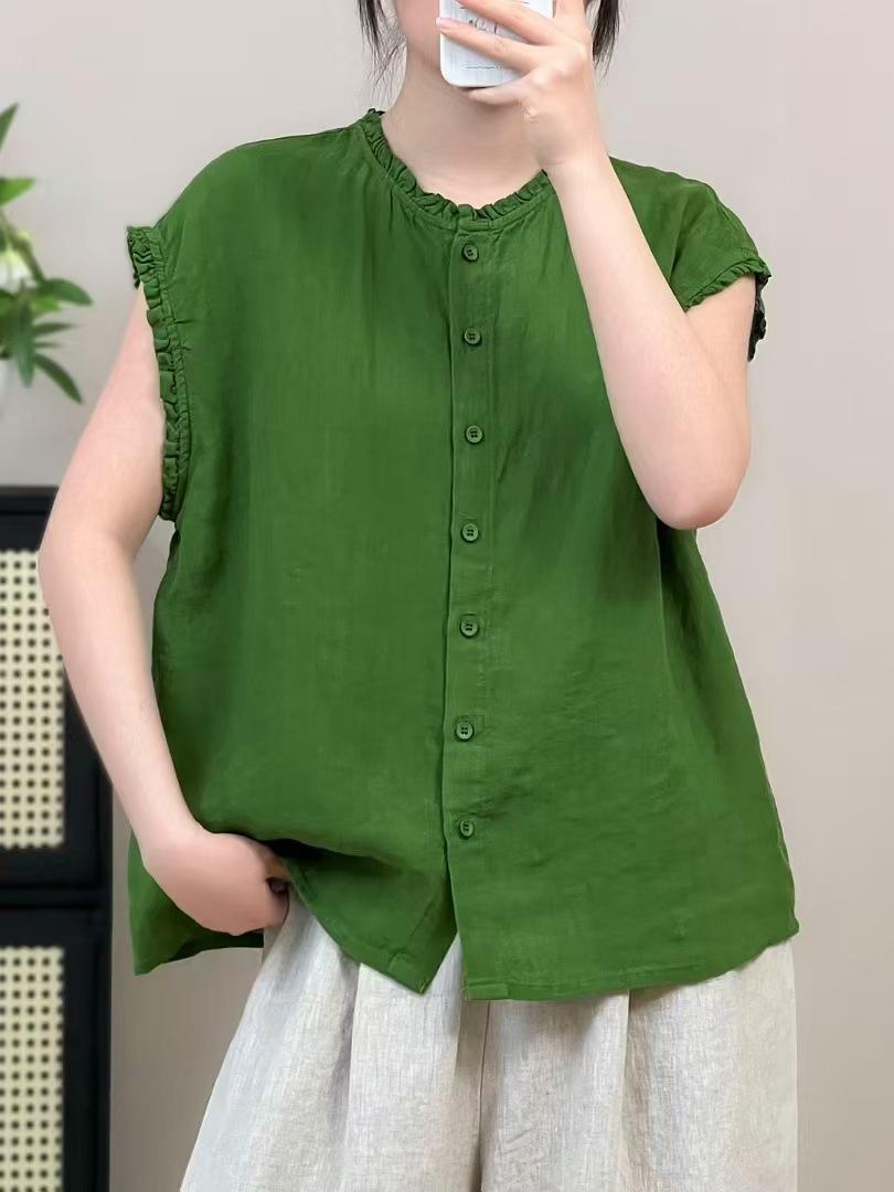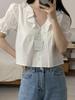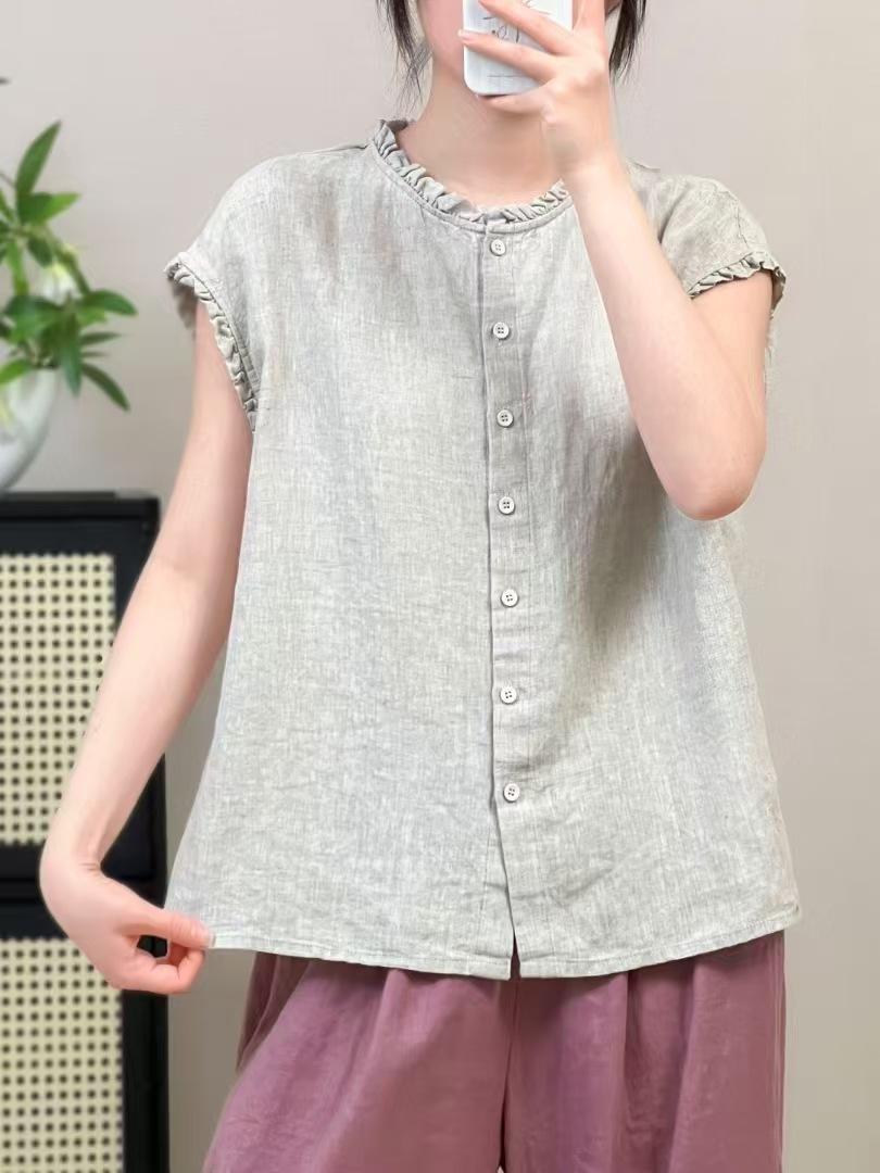 2025 Verano Nuevo Camisa Artística Vintage Casual Elegante Combinable Color Sólido Manga Corta Top de Mujer