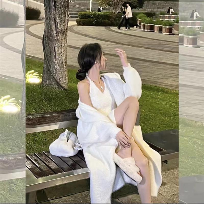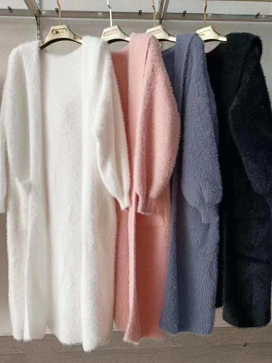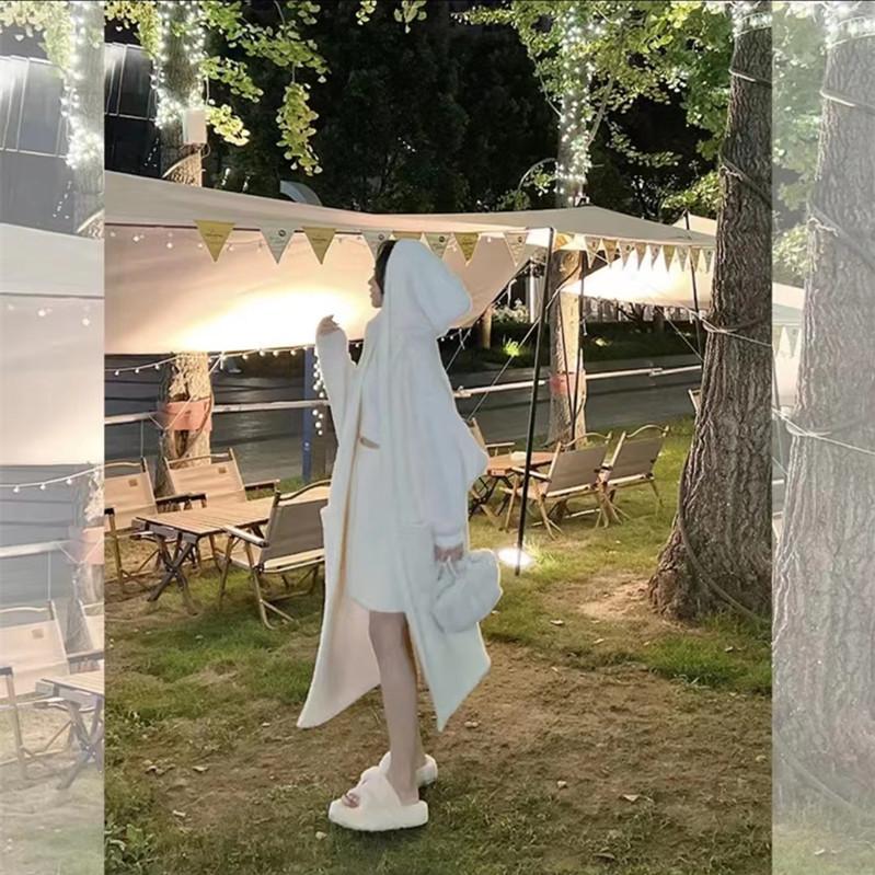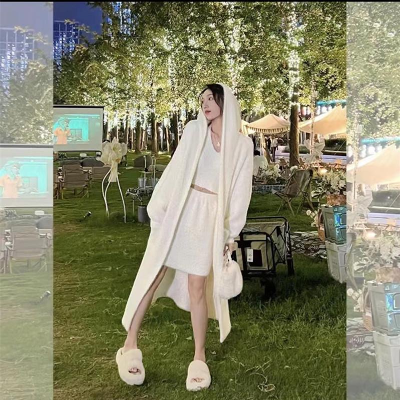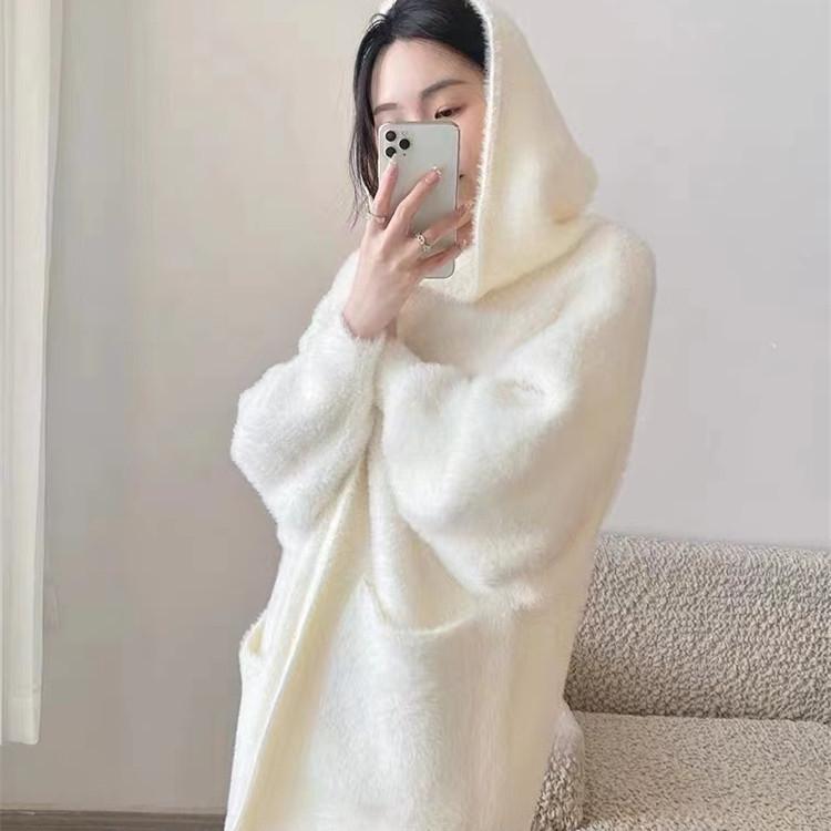 Otoño e invierno 2023 Nuevo cárdigan largo de punto de terciopelo visón sintético Estilo coreano estilo perezoso suéter holgado con capucha para mujer
