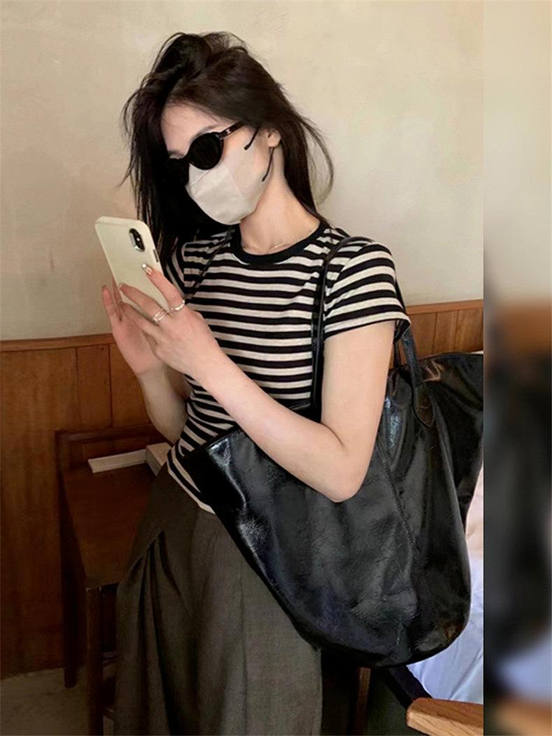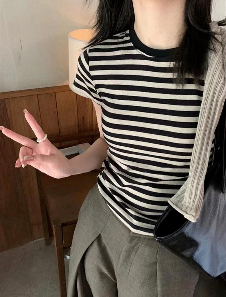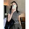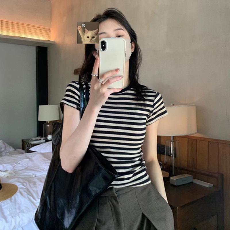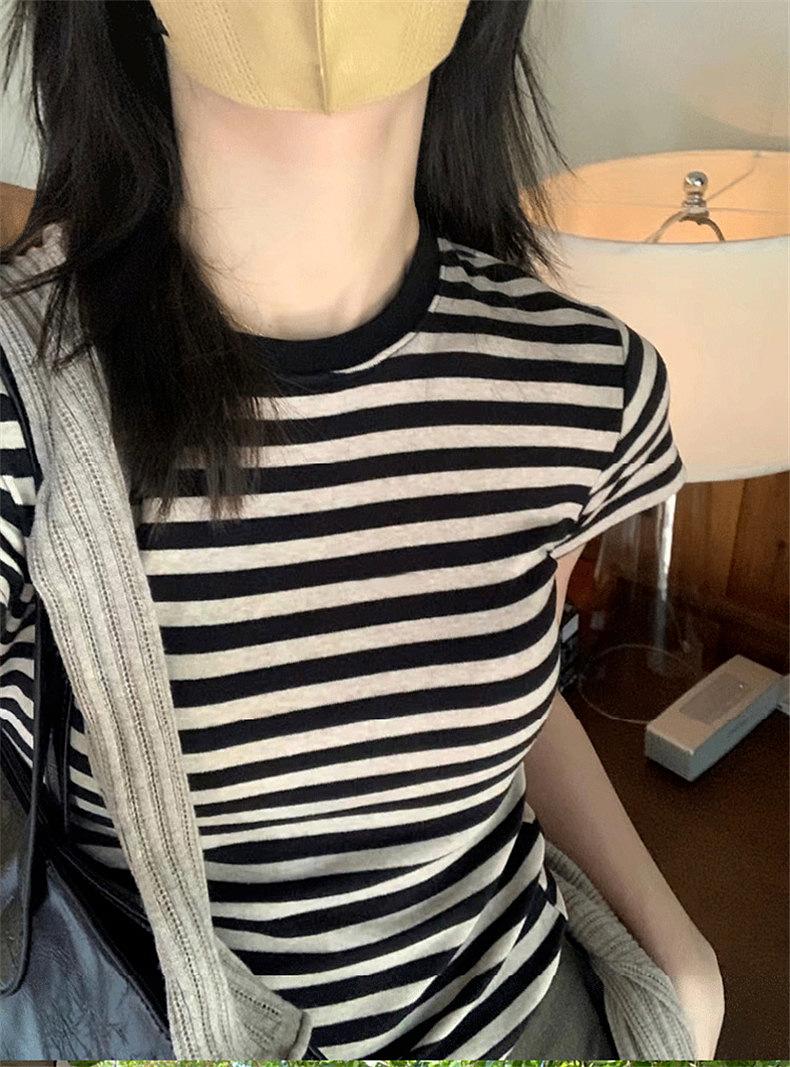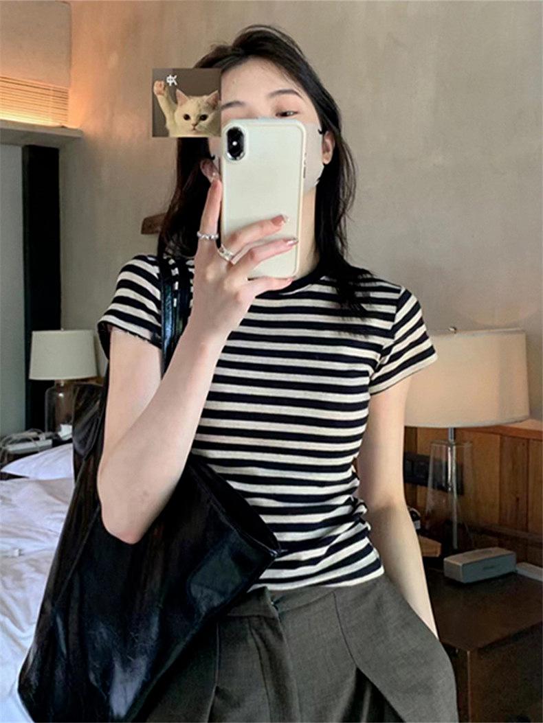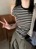 Playera de Rayas Estilo Francés Slim-Fit con Cintura Ceñida Verano 2024 Nuevo Top de Nicho Chic de Deseo Puro Chica Picante Ins