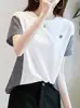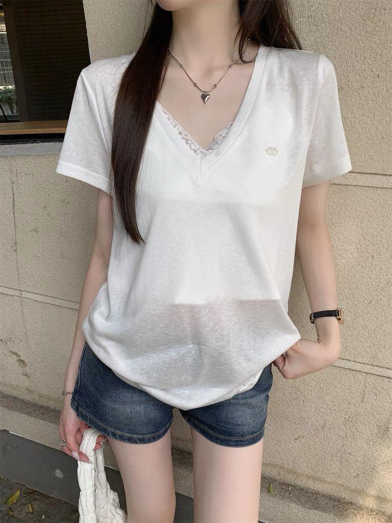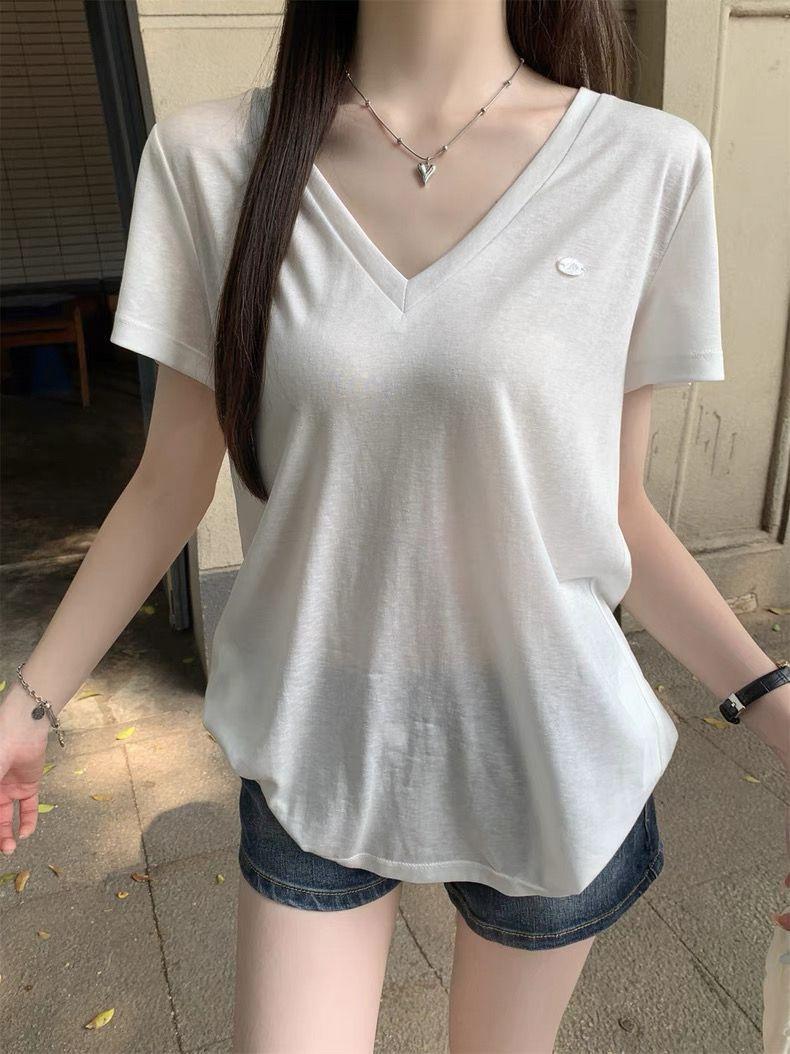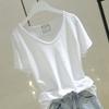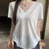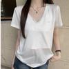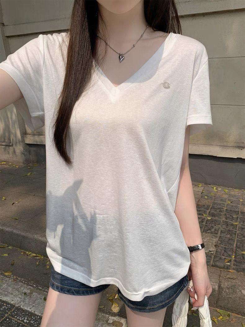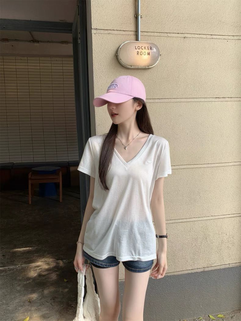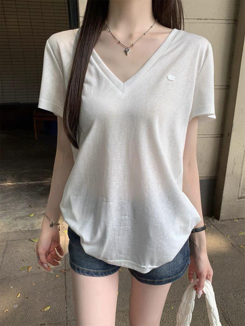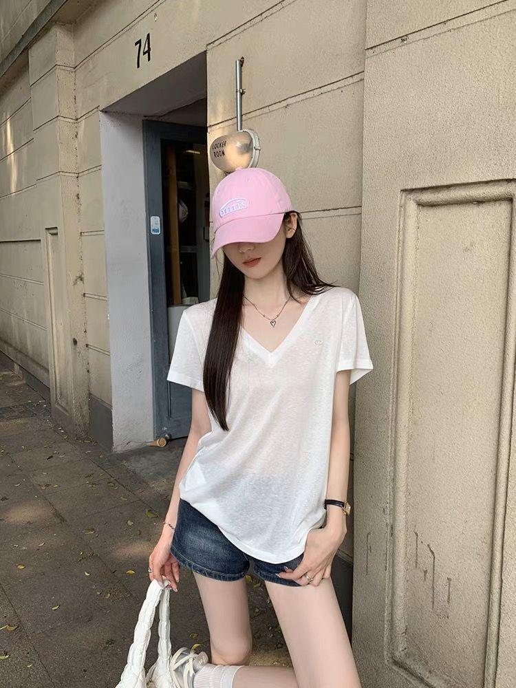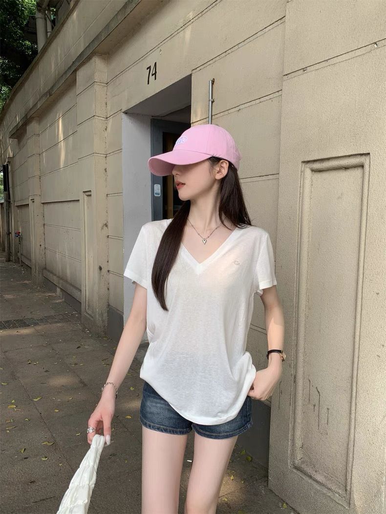 Playera Delgada de Manga Corta Estilo Coreano Relajada Cuello en V Verano 2025 Nuevo Top Chic Blanco Suelto Puro Deseo para Mujer