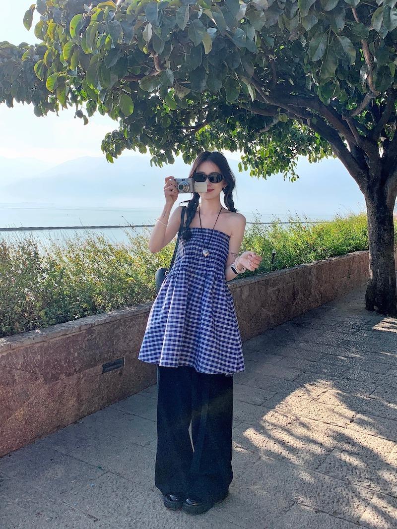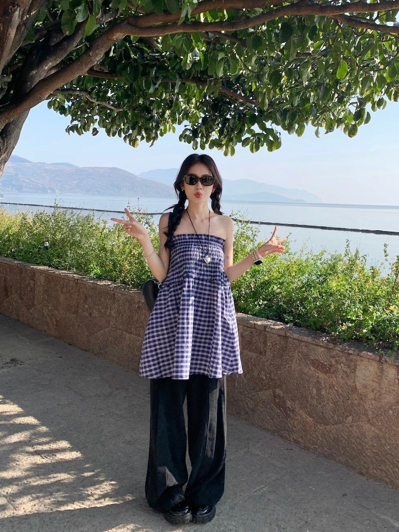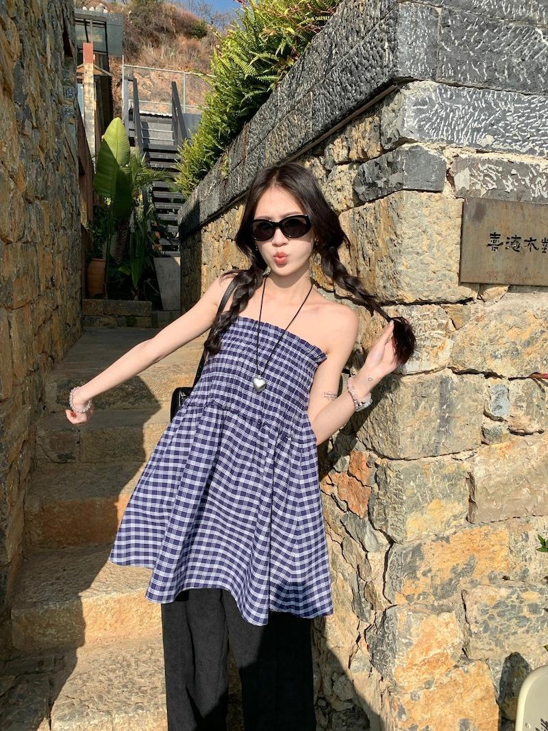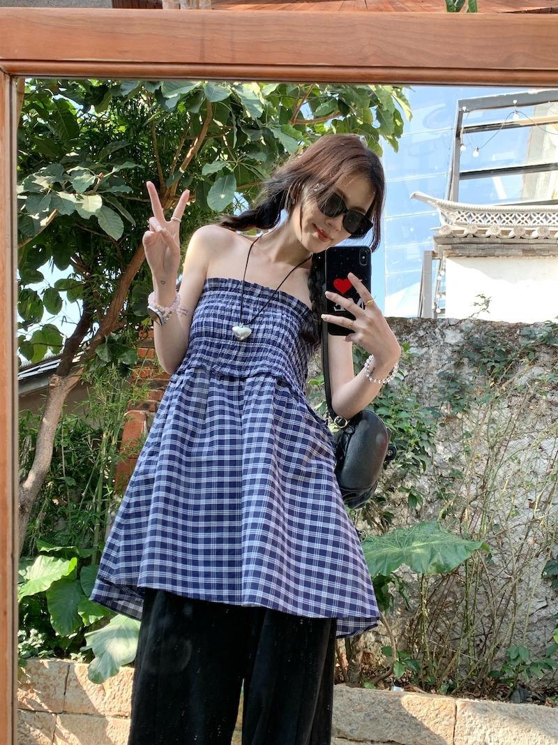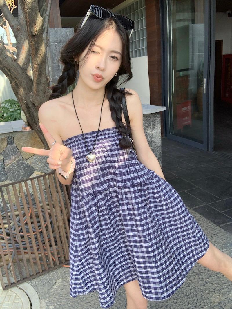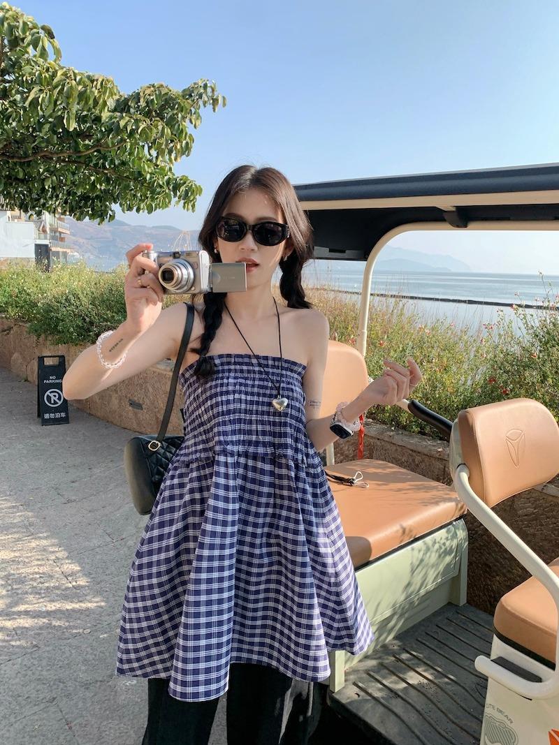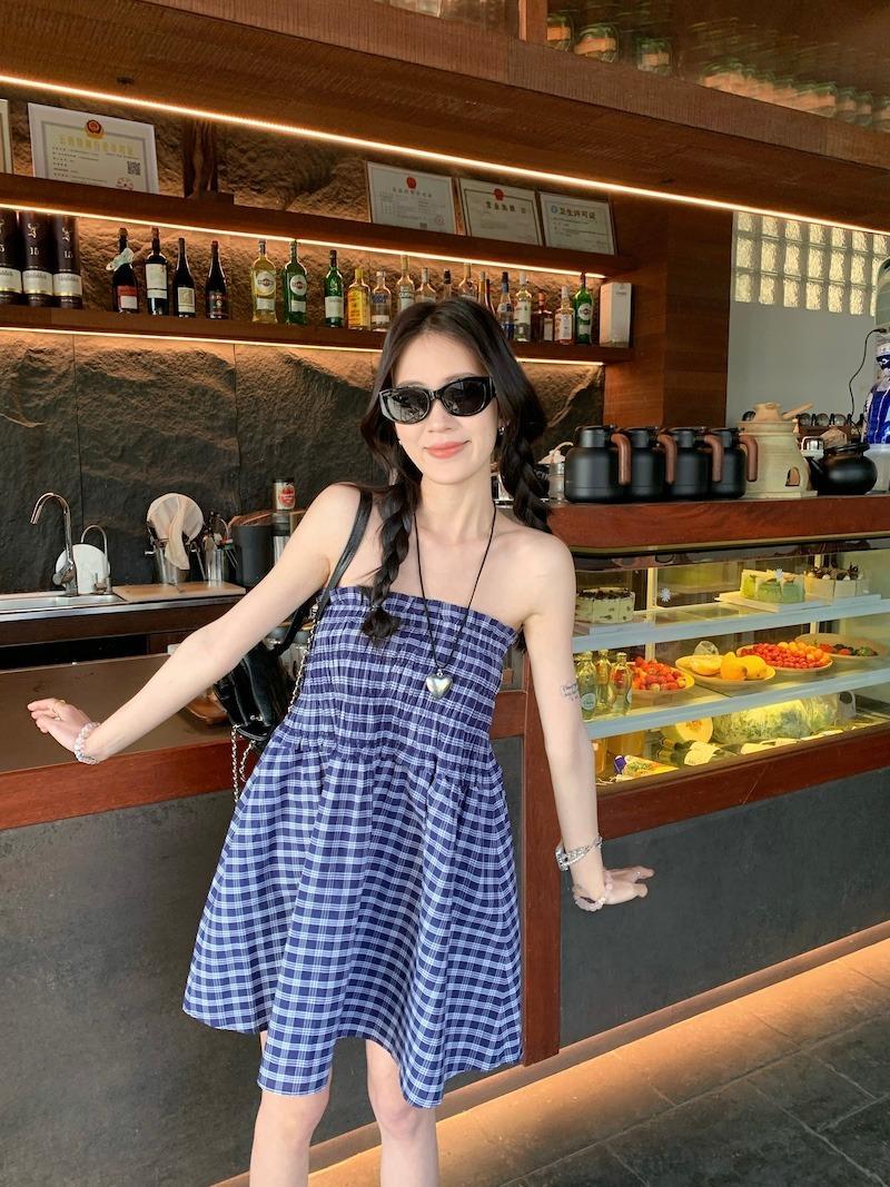 Verano Estilo Dulce Reductor de Edad Chic Diseño de Cuadros Azules Combinable Falda Dos Usos Elegante Top Tubo Chaleco Falda Mujer