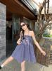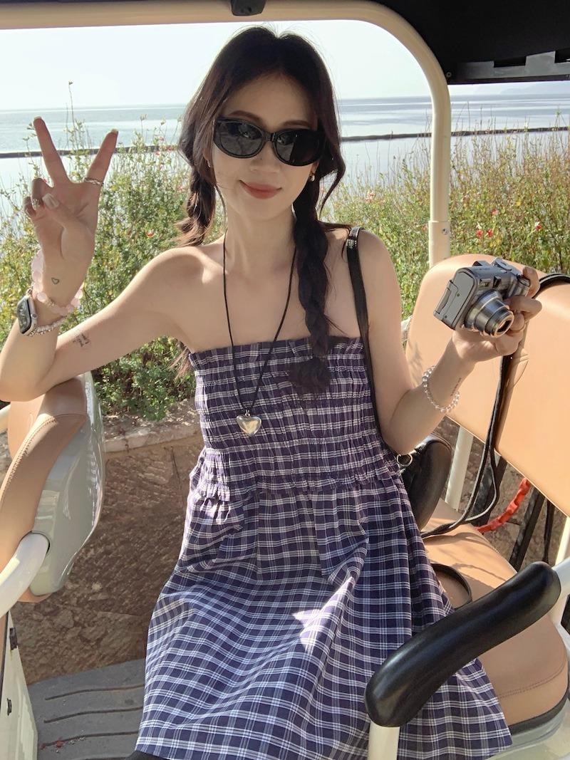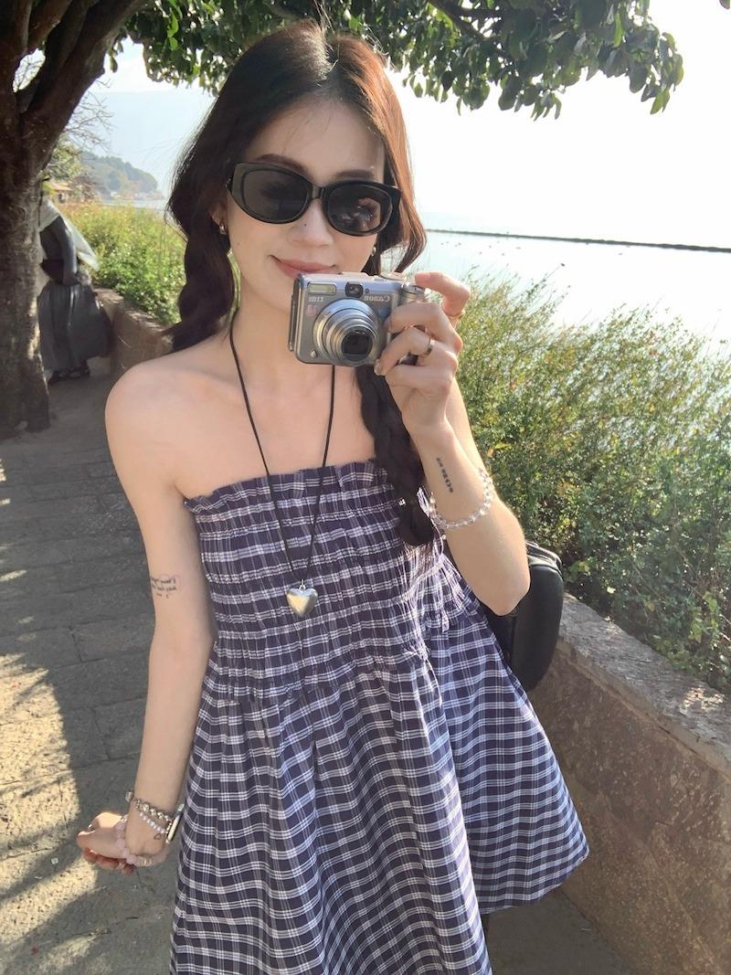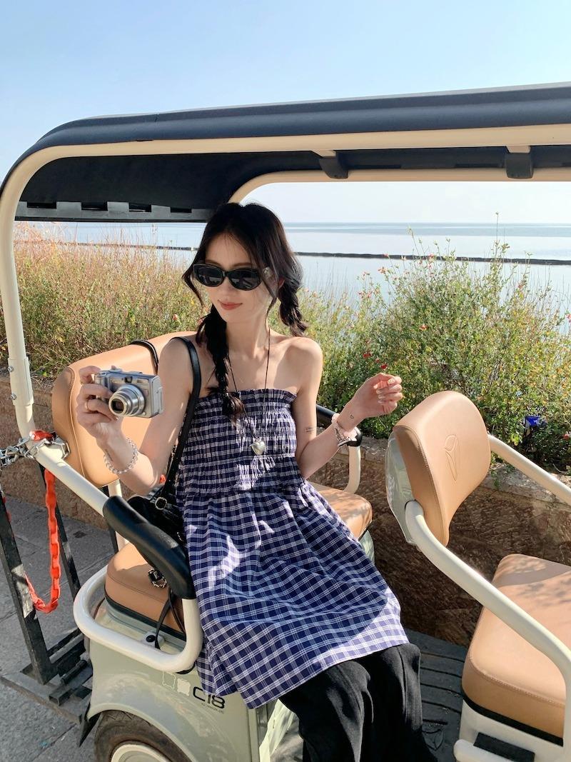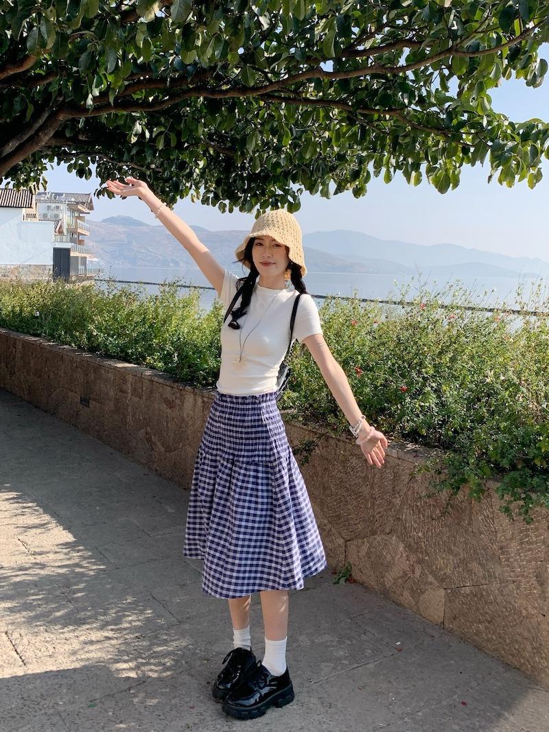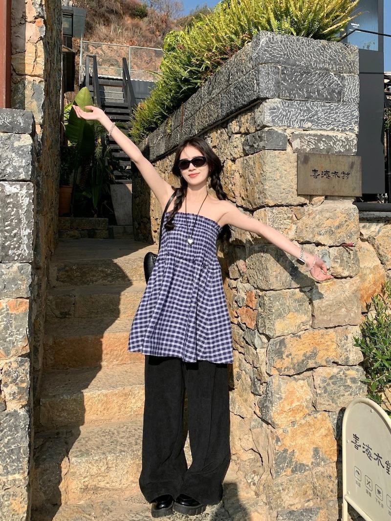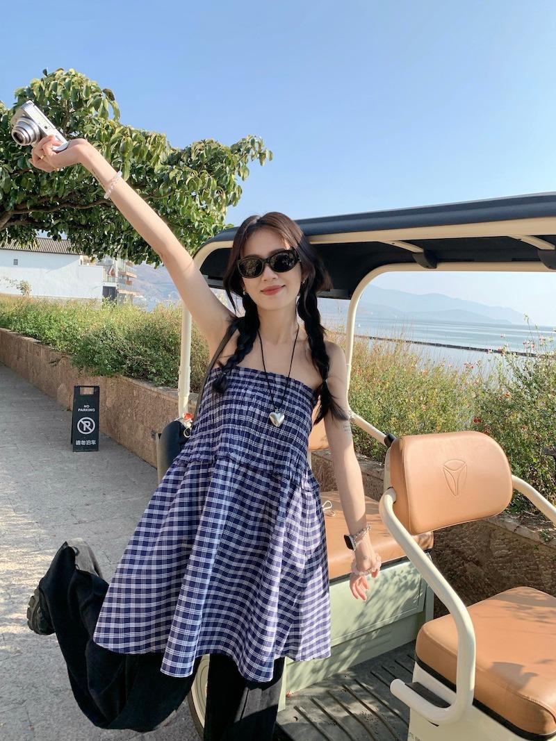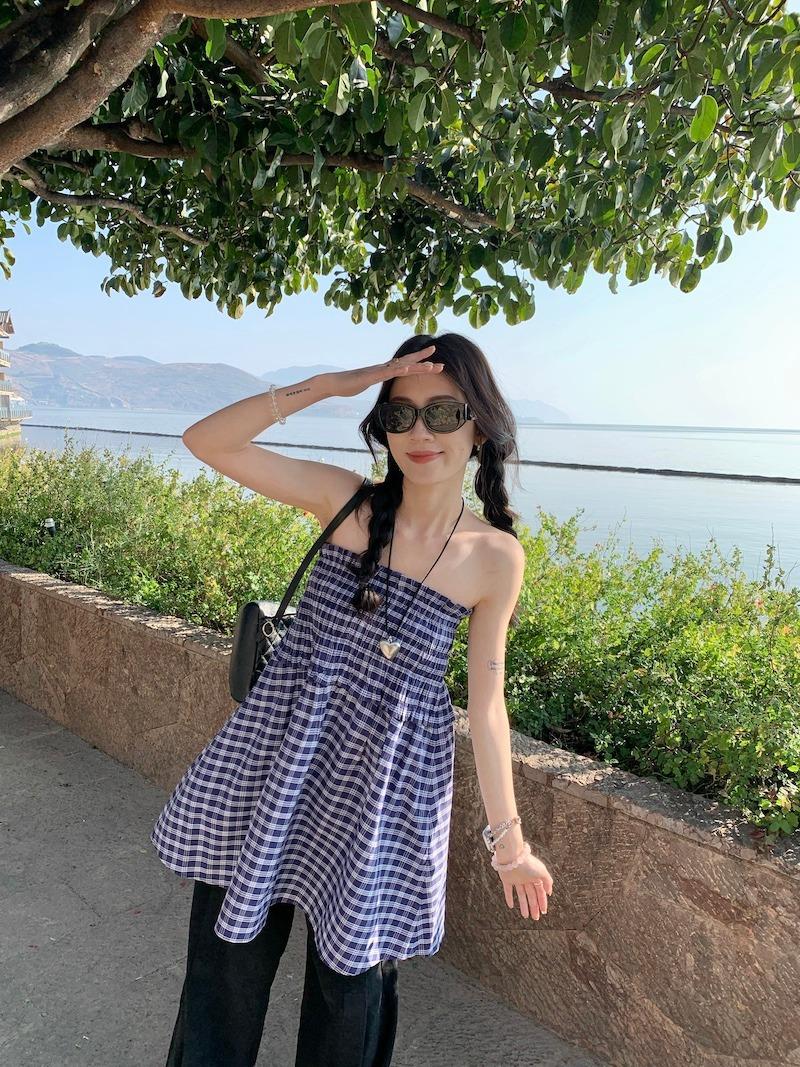 Verano Estilo Dulce Reductor de Edad Chic Diseño de Cuadros Azules Combinable Falda Dos Usos Elegante Top Tubo Chaleco Falda Mujer