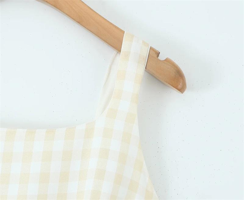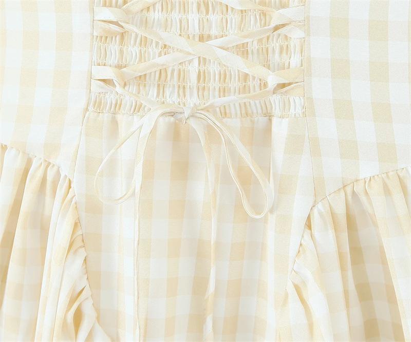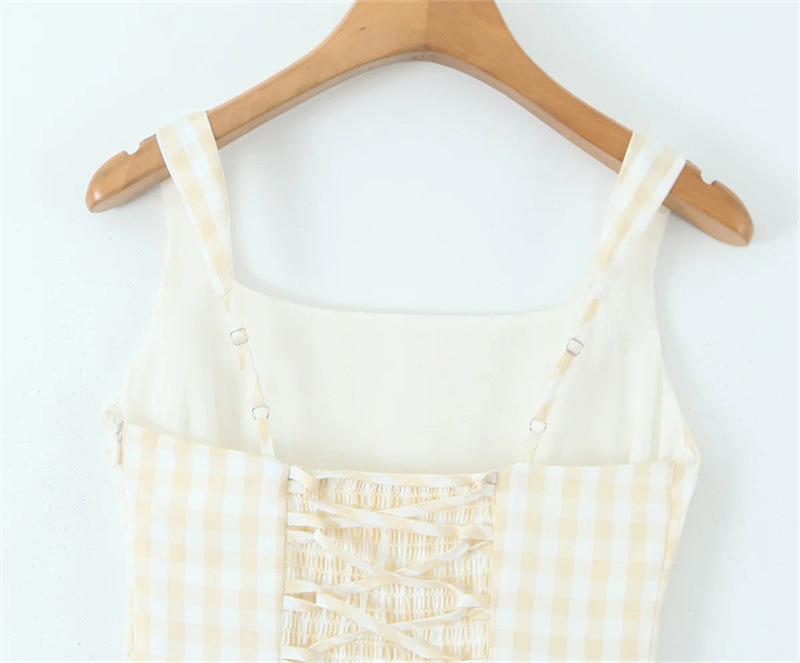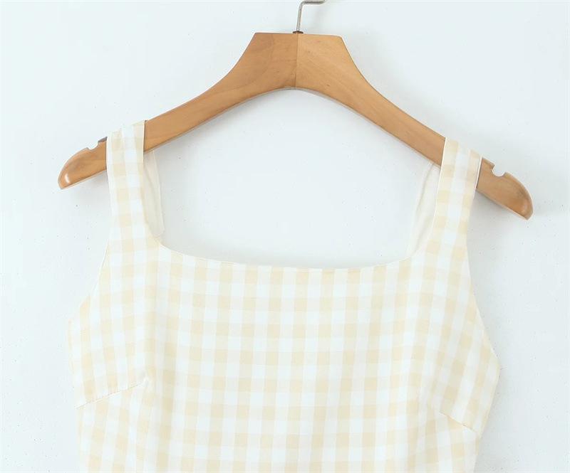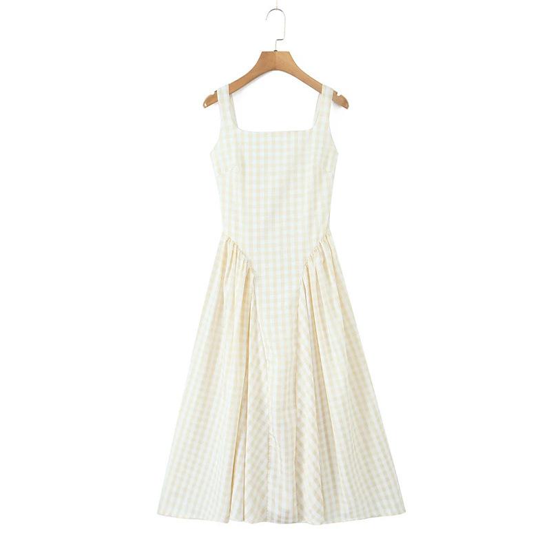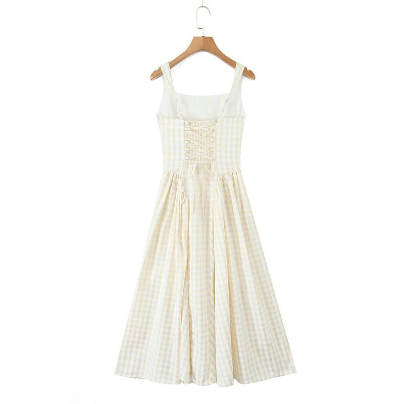 Vestido de Tirantes a Cuadros con Cuello Cuadrado Francés Diseño de Espalda con Tiras Cruzadas Ajustado a la Cintura con Pliegues Vestido Largo