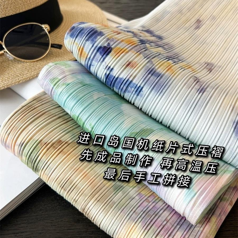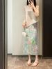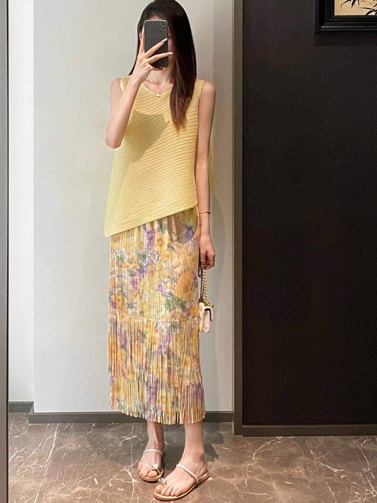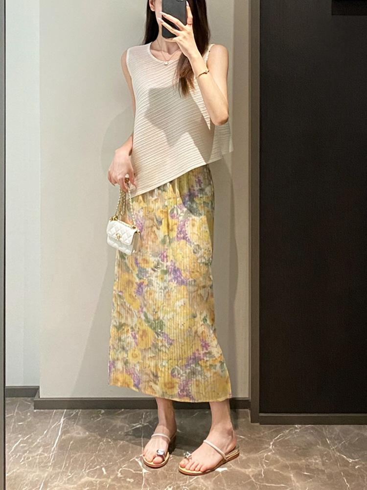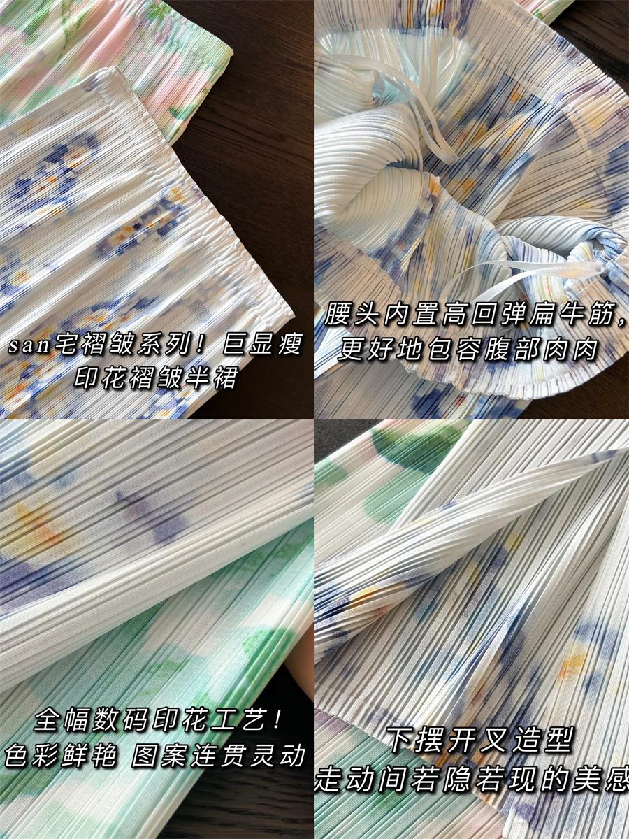 Falda Plisada de Tres Casas de Alta Gama de Lujo Ligero para Mujer, Estampada con Pintura al Óleo, Plisada con Caída, Abertura Recta a la Cadera