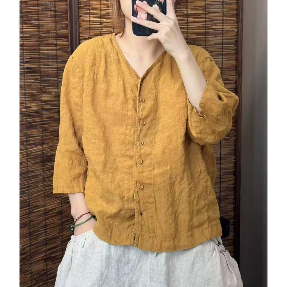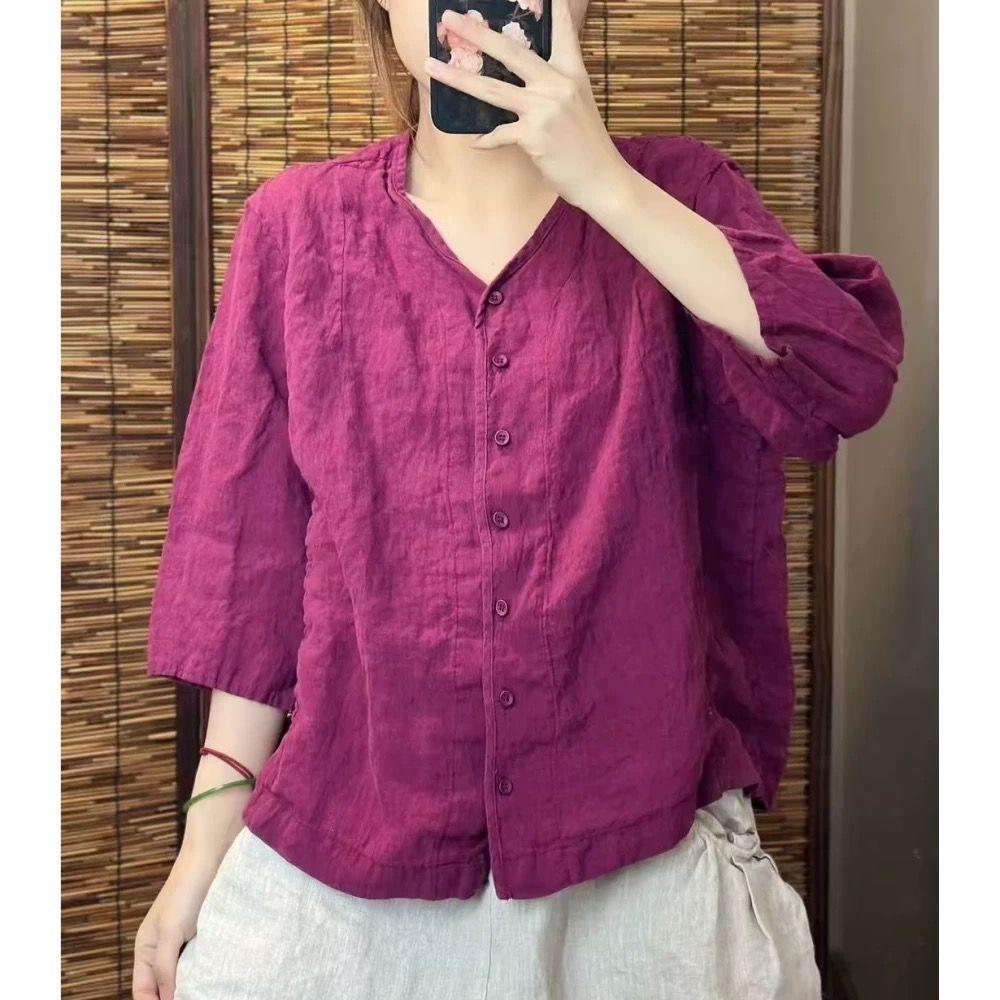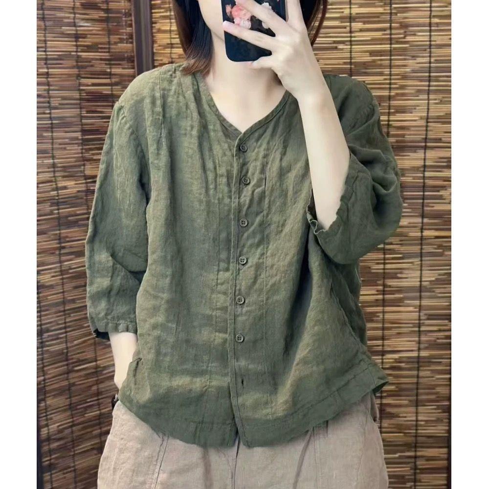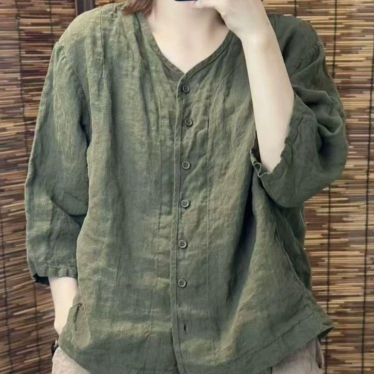 2025 Nuevo Color Sólido Algodón y Lino Tops Sueltos Temperamento Literario Casual Manga Tres Cuartos Cárdigan Camisa Tops Camiseta para Mujer