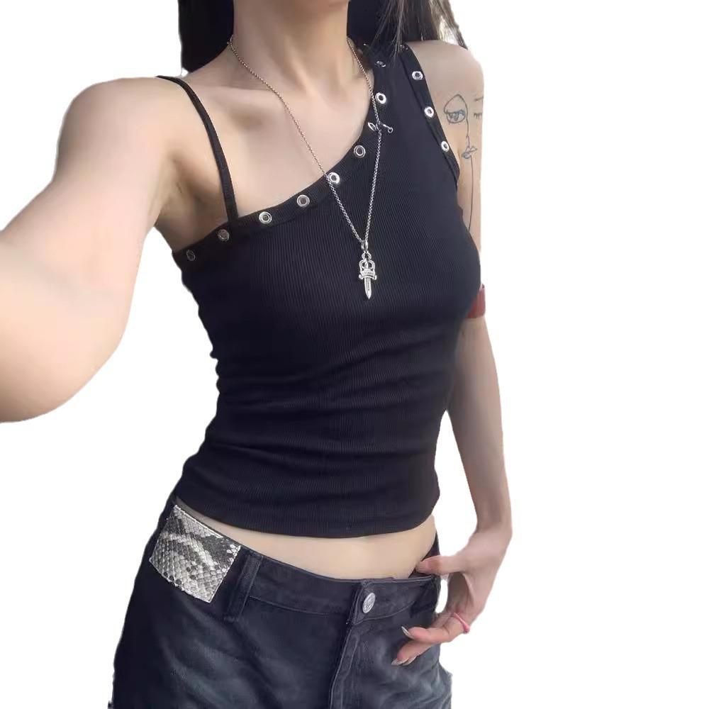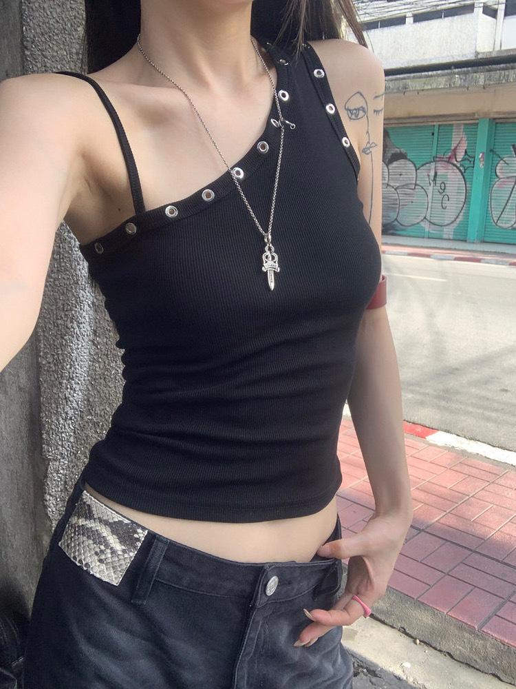 Camisola de Tirante de Hombro Inclinado Negro para Chica Americana Sexy Verano Diseño Nicho Slim Corta con Hombros Descubiertos para Uso Exterior