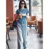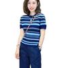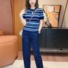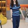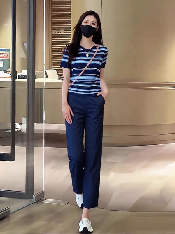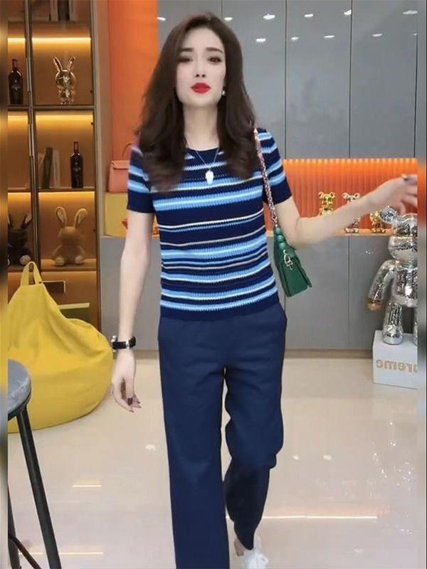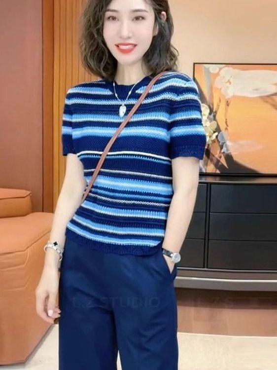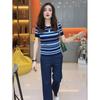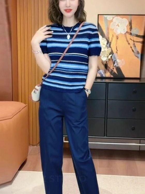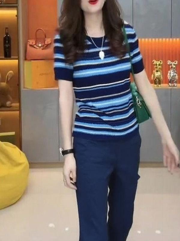 Traje Casual de Moda Verano 2025 para Mujer de Punto a Rayas de Cuello Redondo de Gama Alta Europeo de Manga Corta
