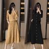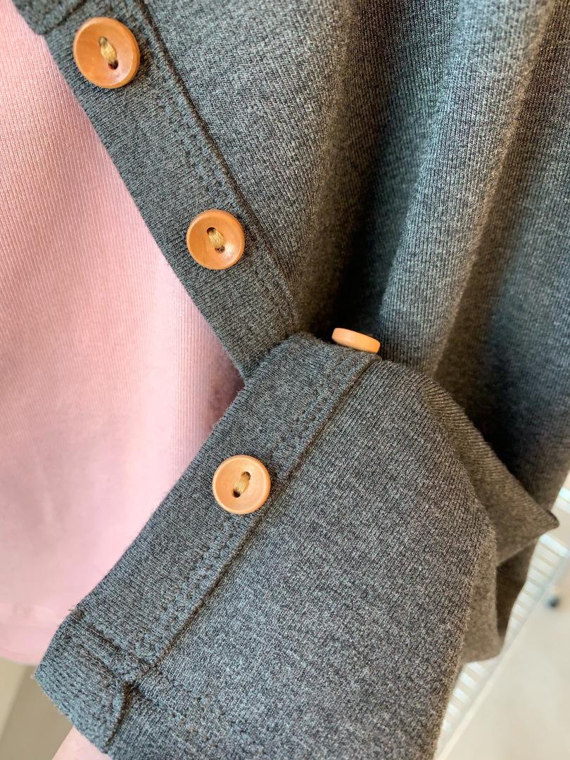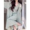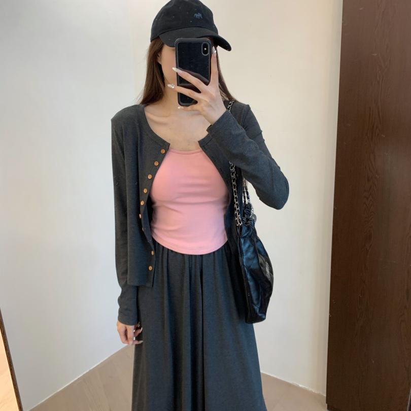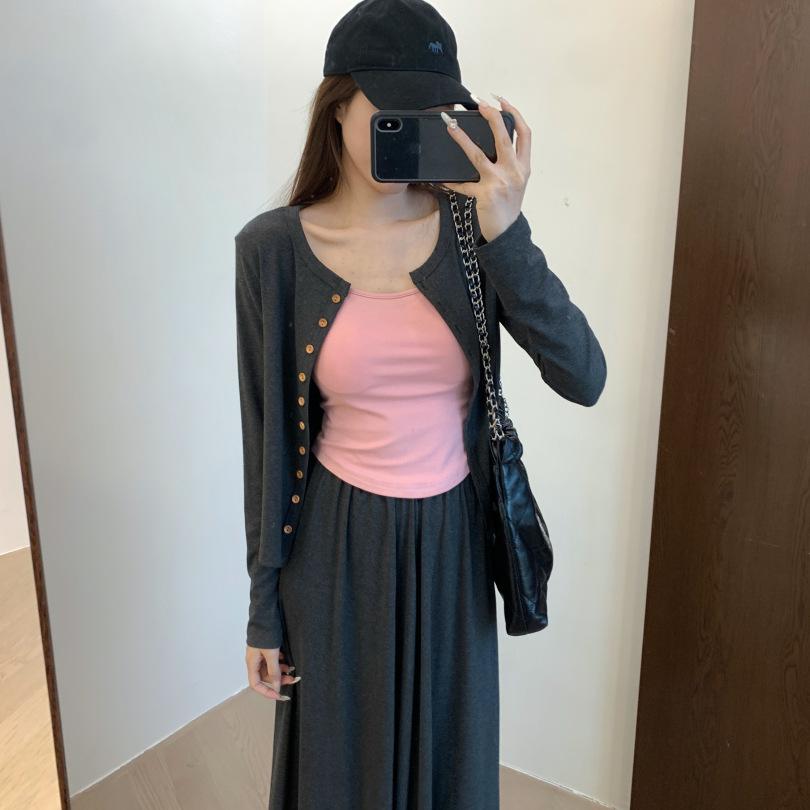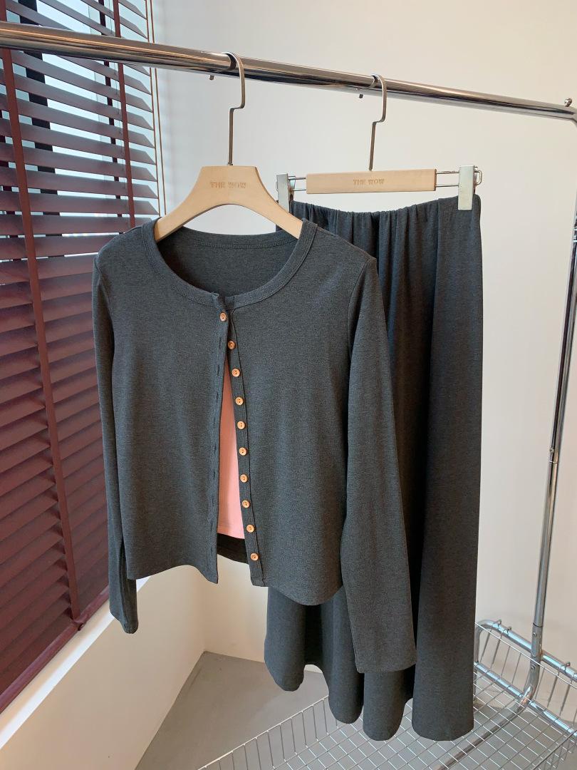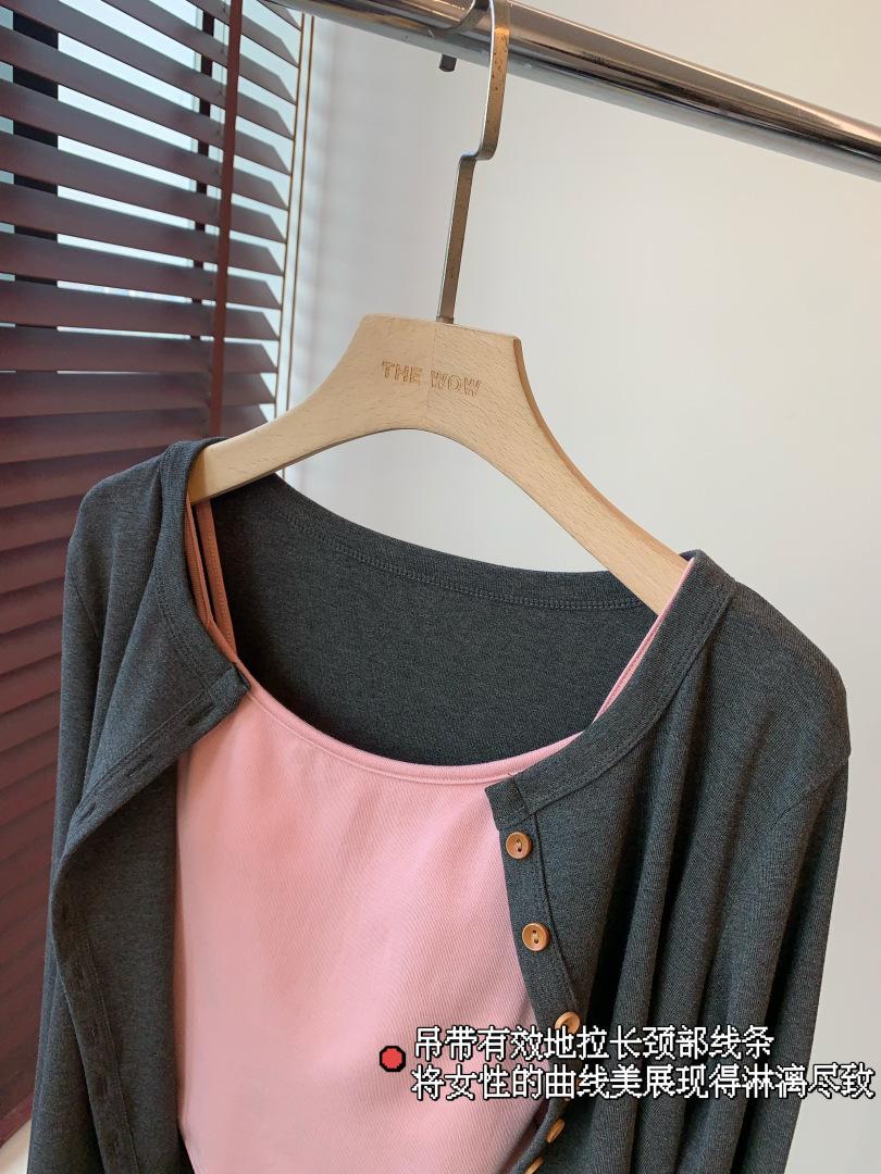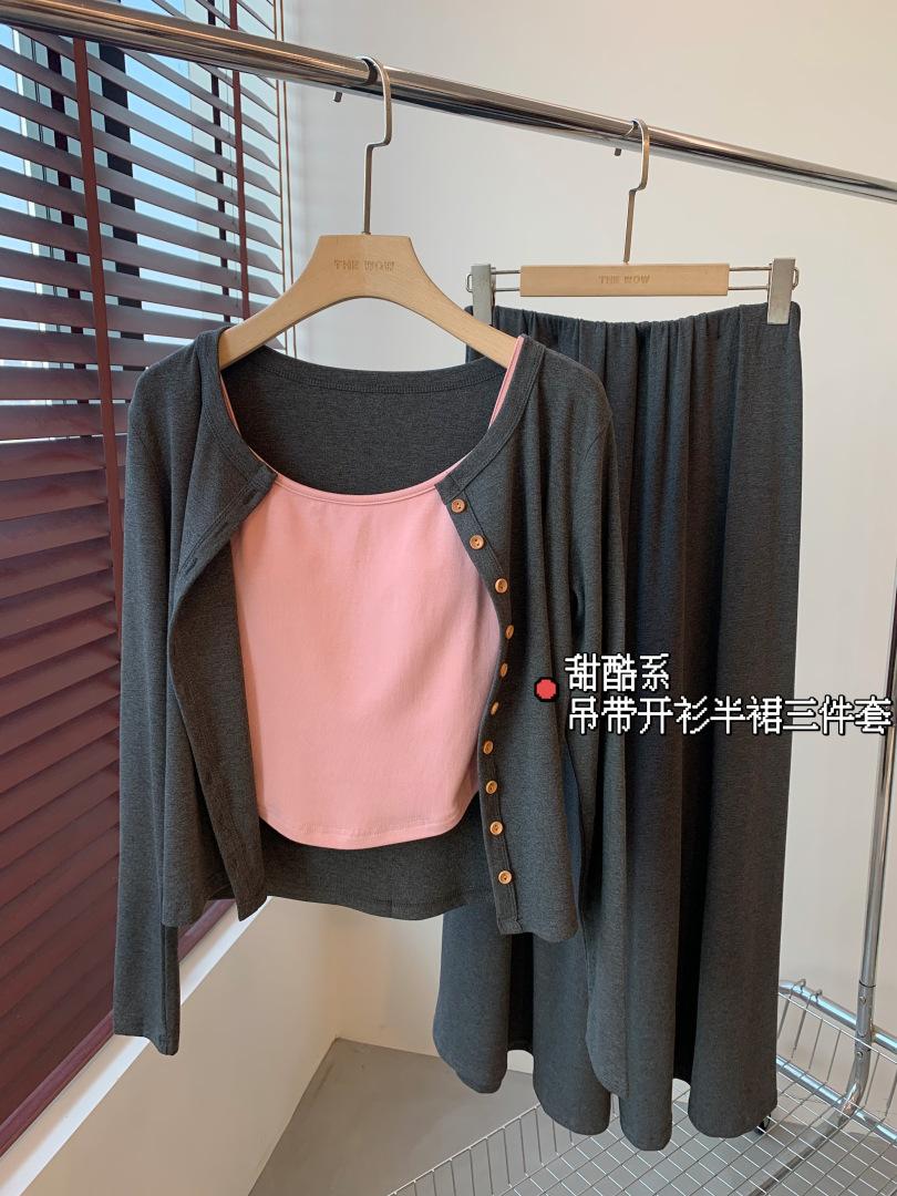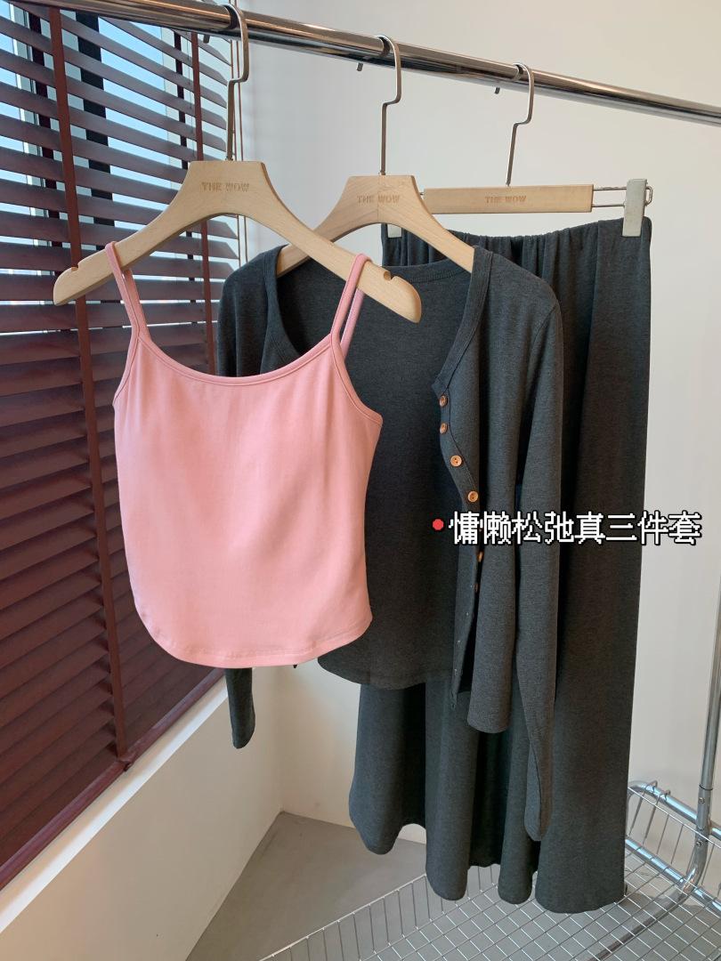 Un traje de tres piezas con un sentido único de relajación. Se siente suave y cómodo. La hermosa combinación de tirantes y cárdigan,