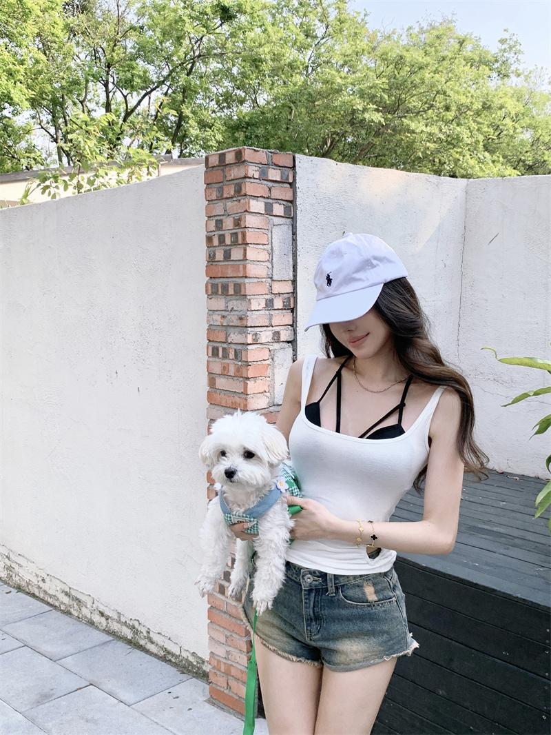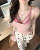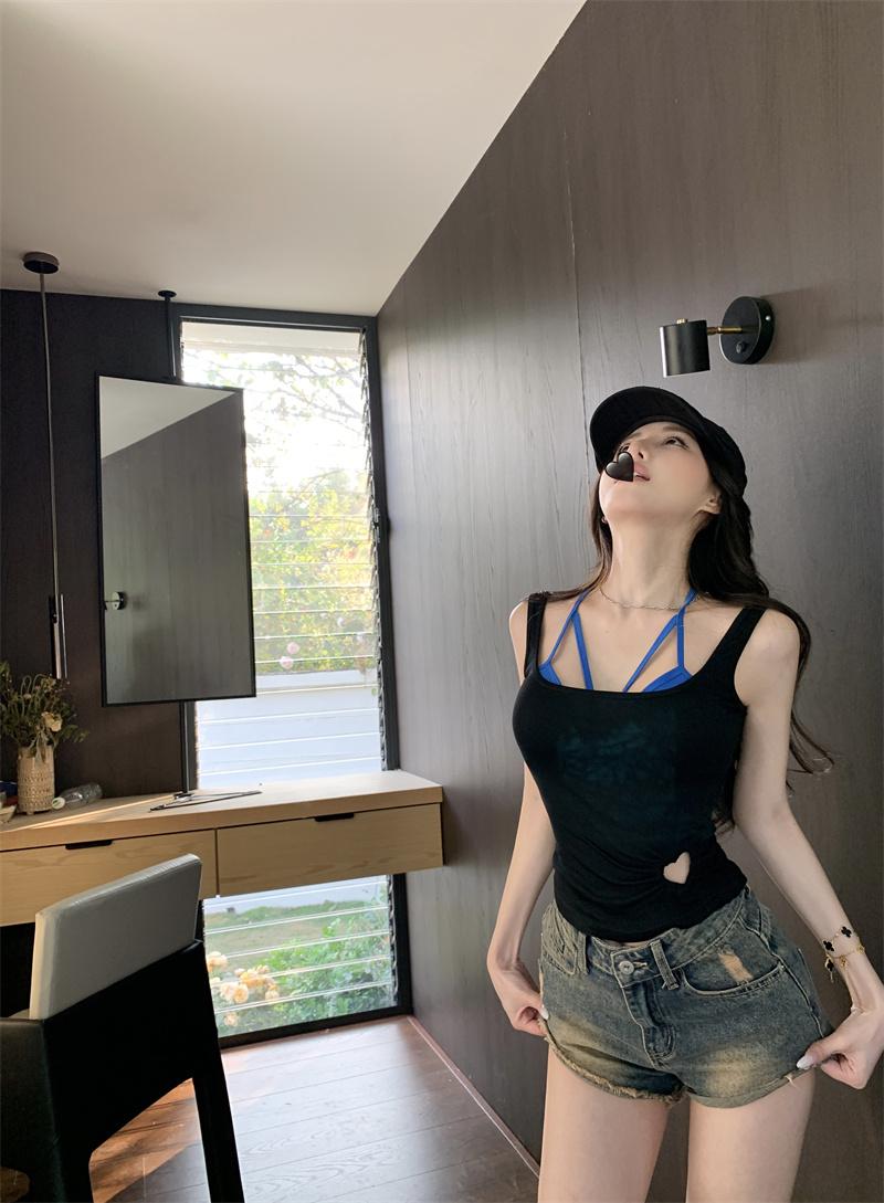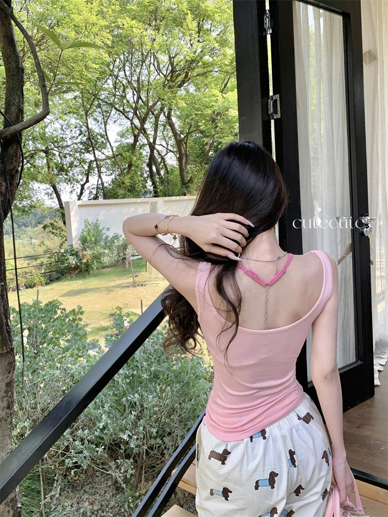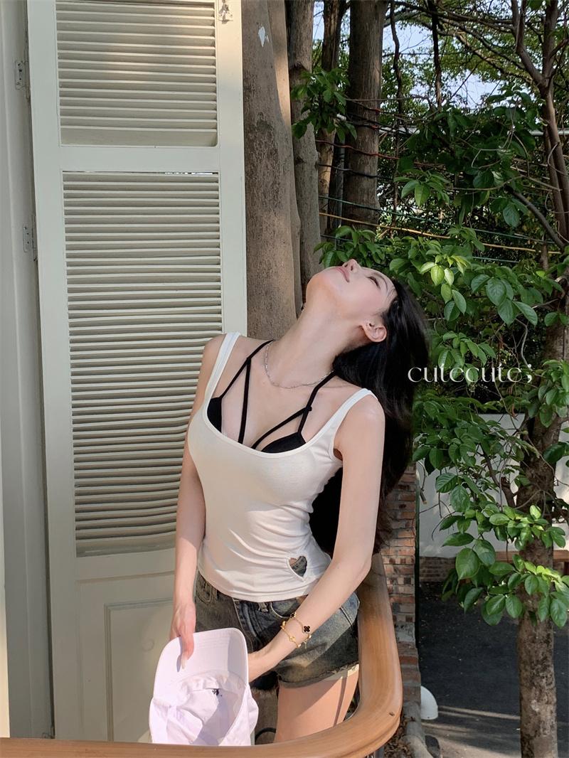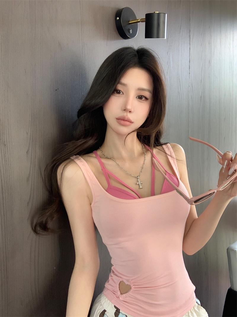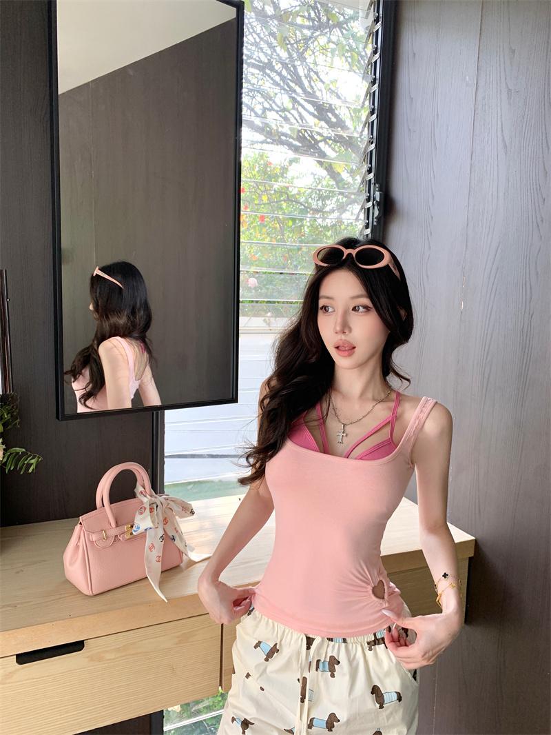 Camisola Corta Rosa de Chica Caliente Diseño de Verano Hueco Delgado para Exterior de Mujer con Top de Sujetador en Capas
