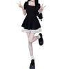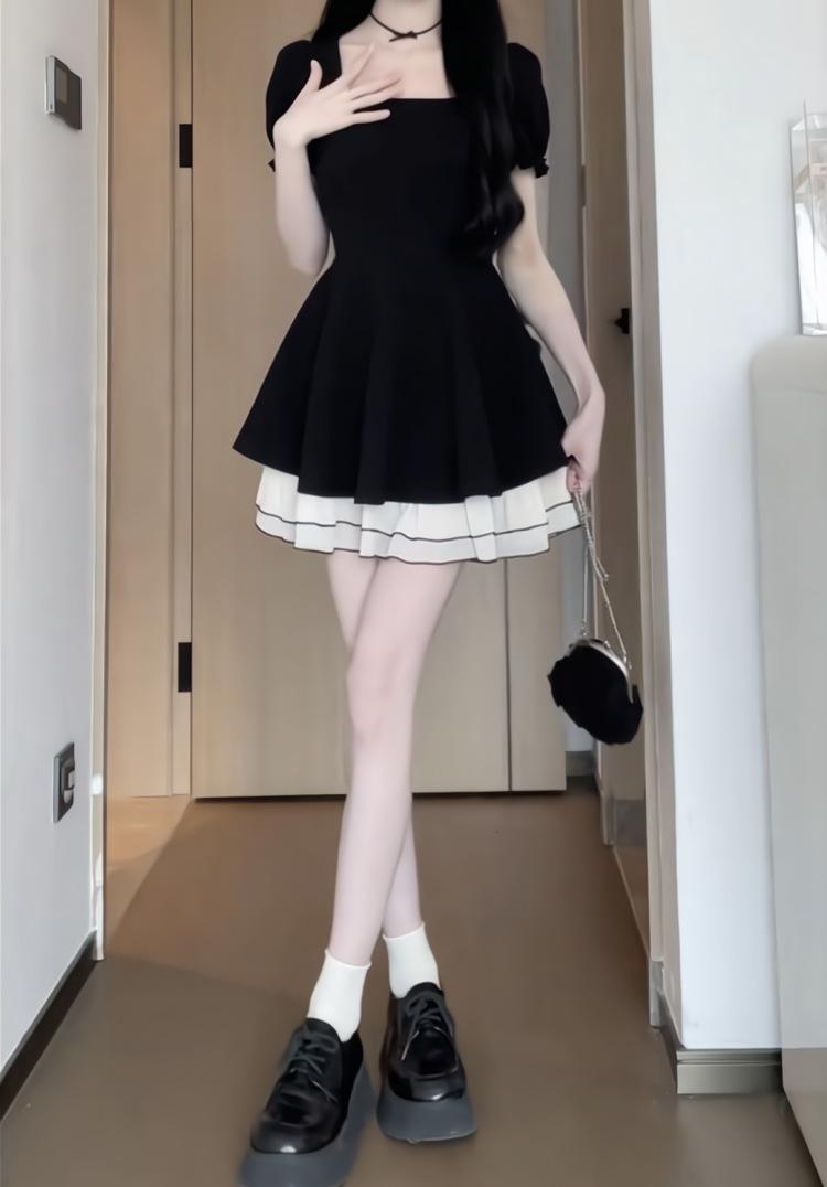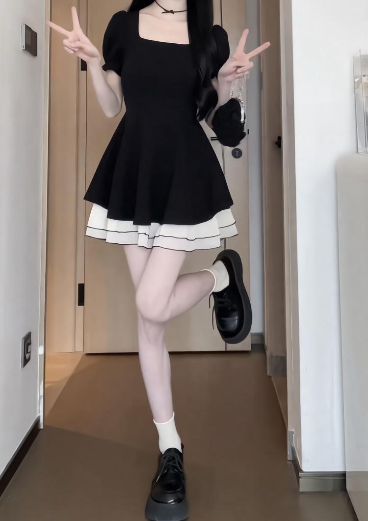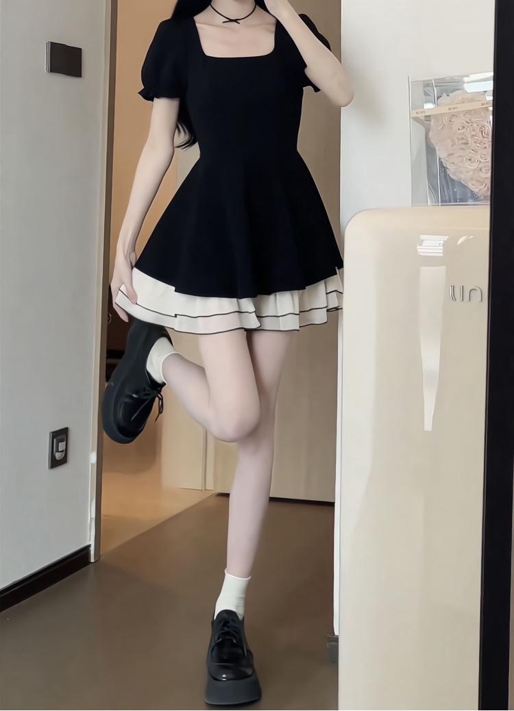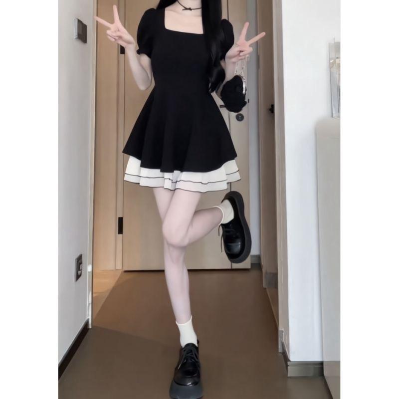 Vestido de Verano Estilo Hepburn Francés Nuevo Cisne Negro Costuras en Contraste Manga Corta Vestido Negro Pequeño Vestido Slim Línea A
