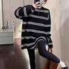 Otoño e Invierno Nuevo Estilo Coreano Moda Estilo Occidental Cuello Redondo Rayado Suave Ceroso Manga Larga Camiseta Base Top para Mujer