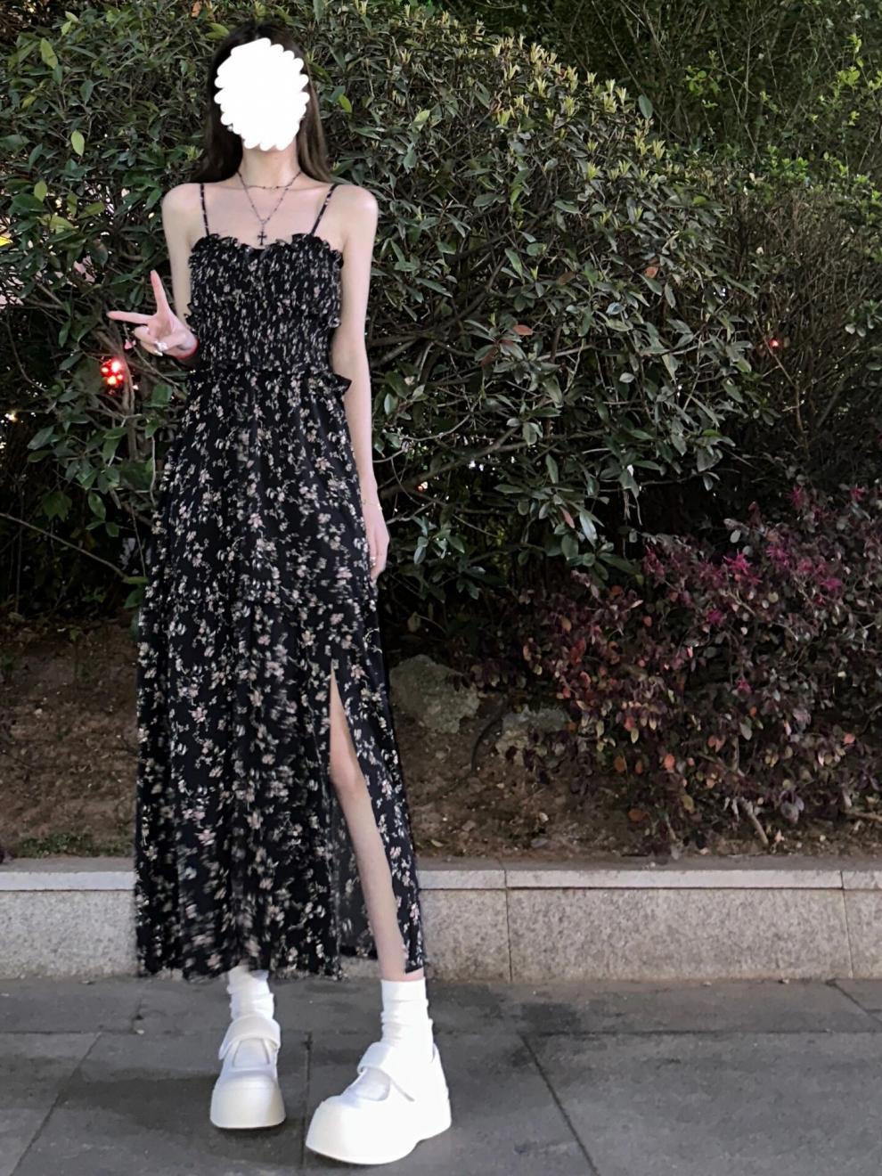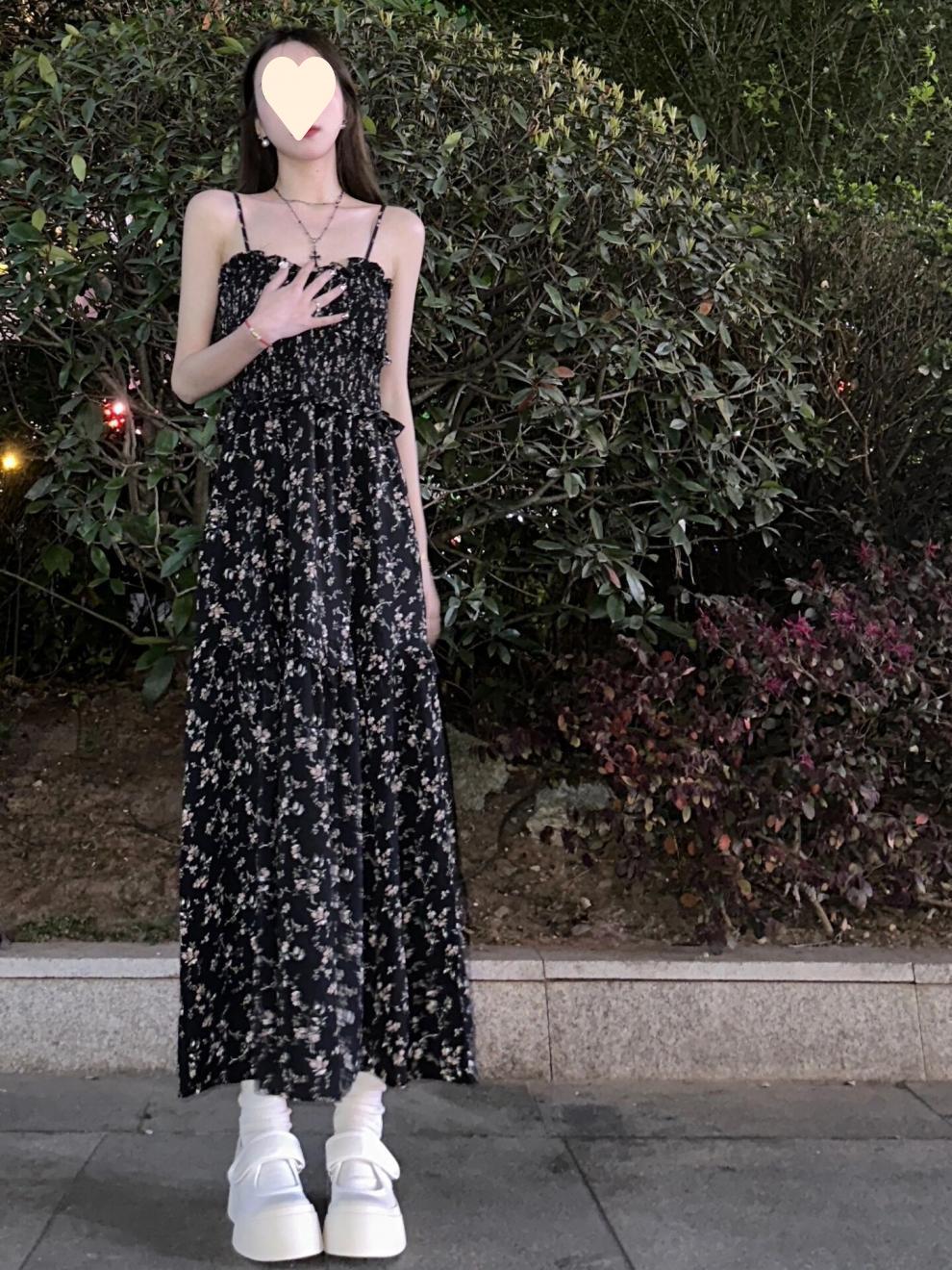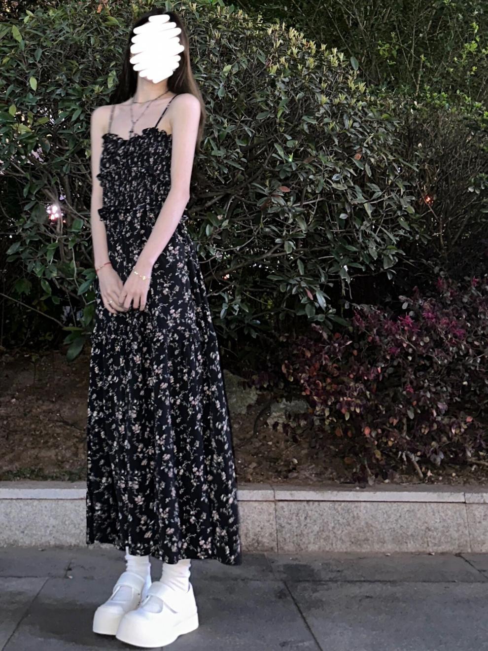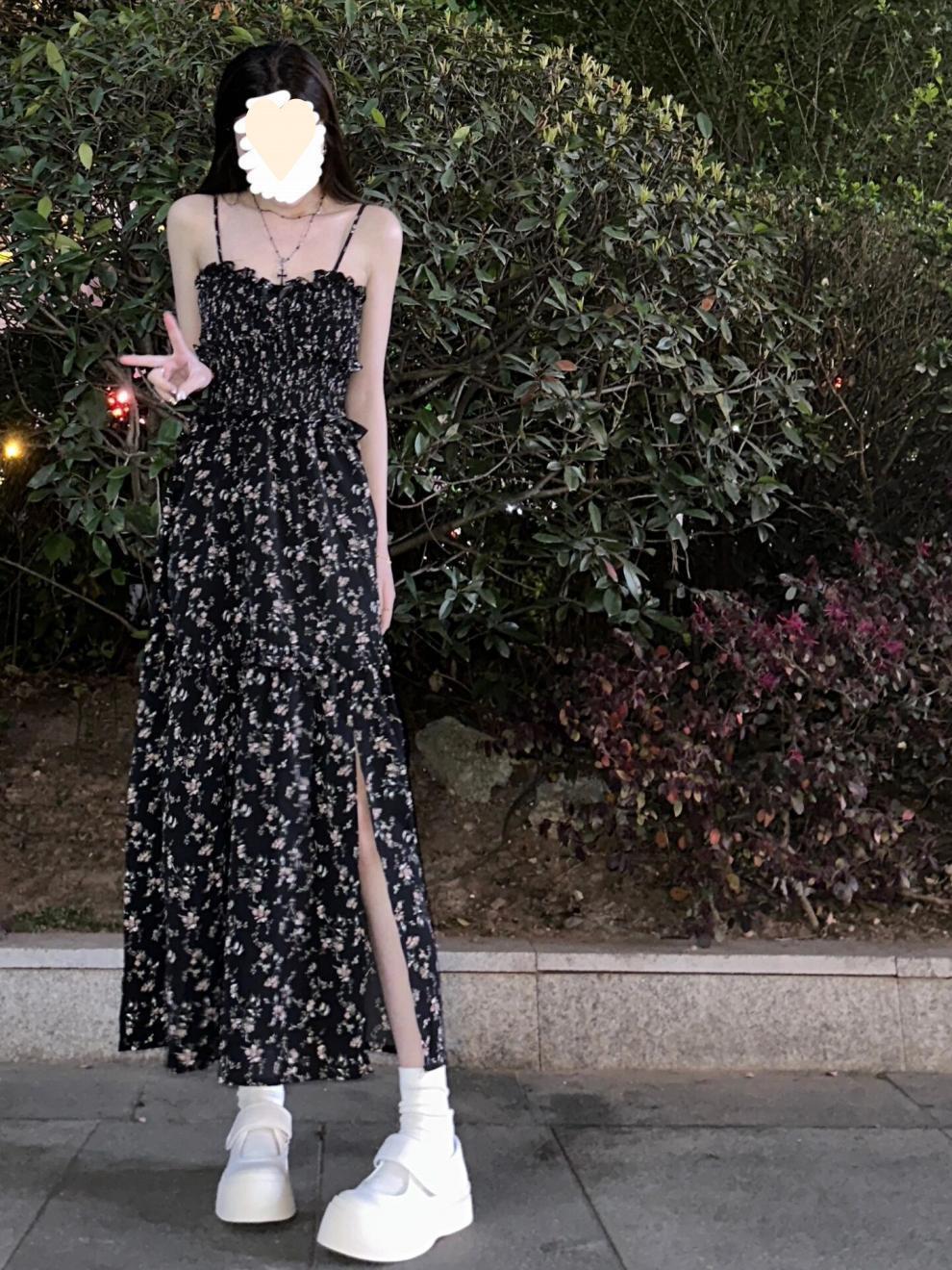 Vestido floral negro de alta gama francés, estilo real de hermana, corte alto, frío, corte de té, hermoso temperamento, vestido largo con tirantes para verano.