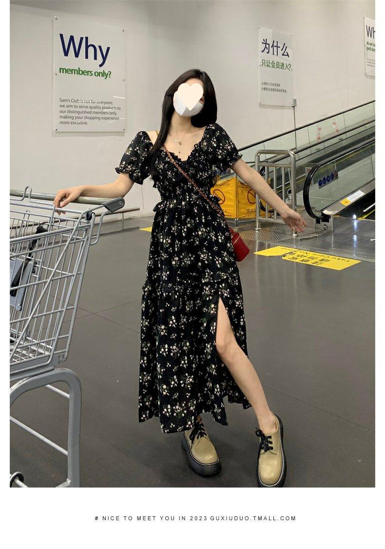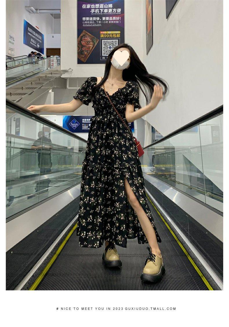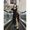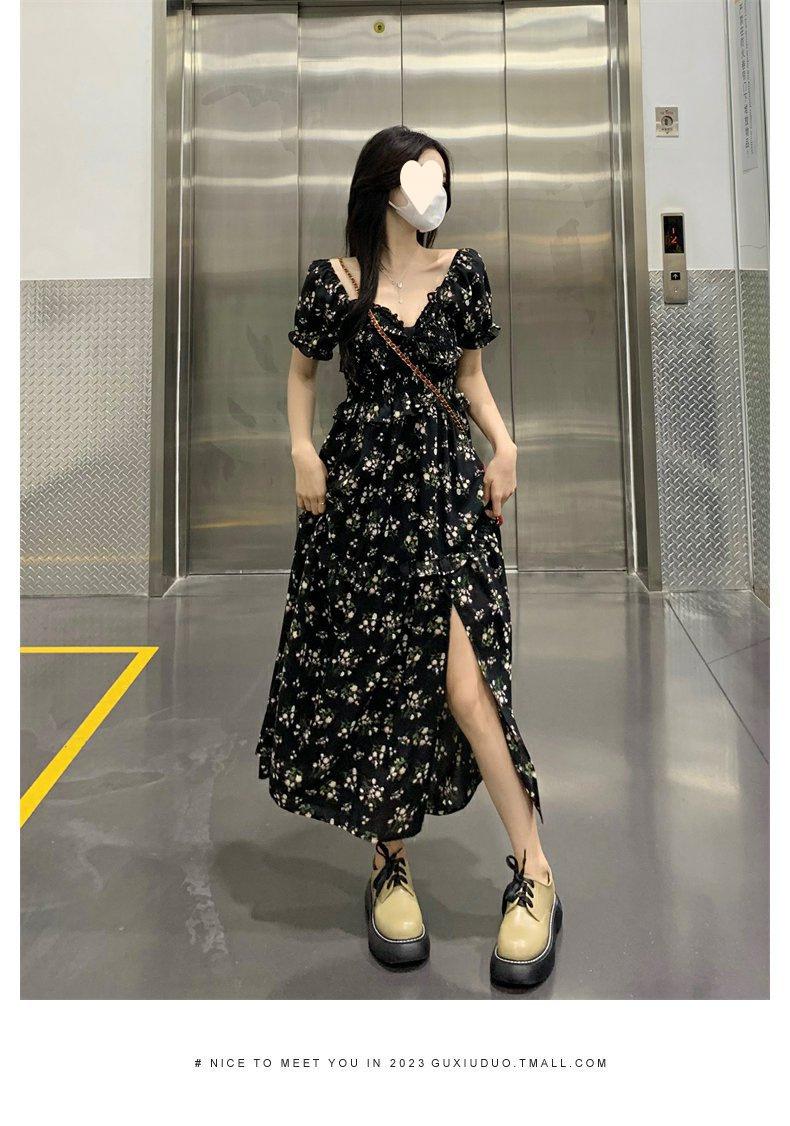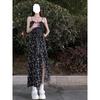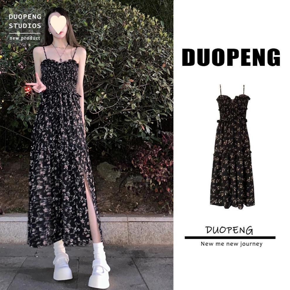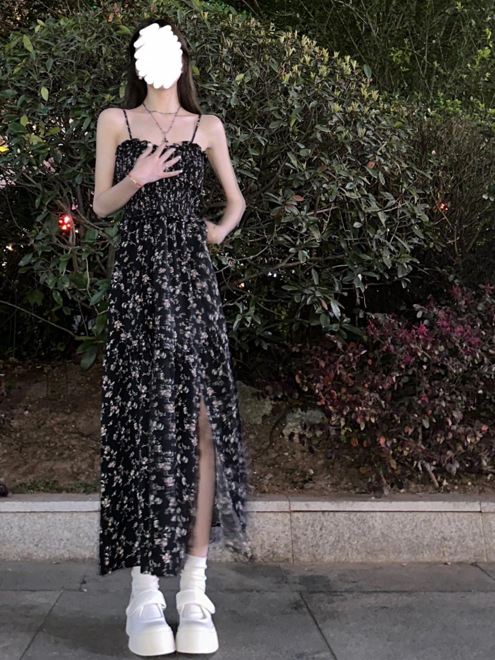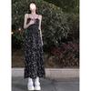Vestido floral negro de alta gama francés, estilo real de hermana, corte alto, frío, corte de té, hermoso temperamento, vestido largo con tirantes para verano.