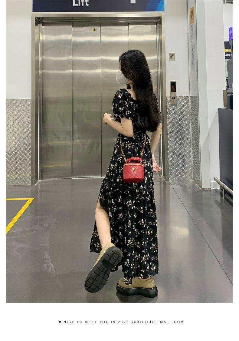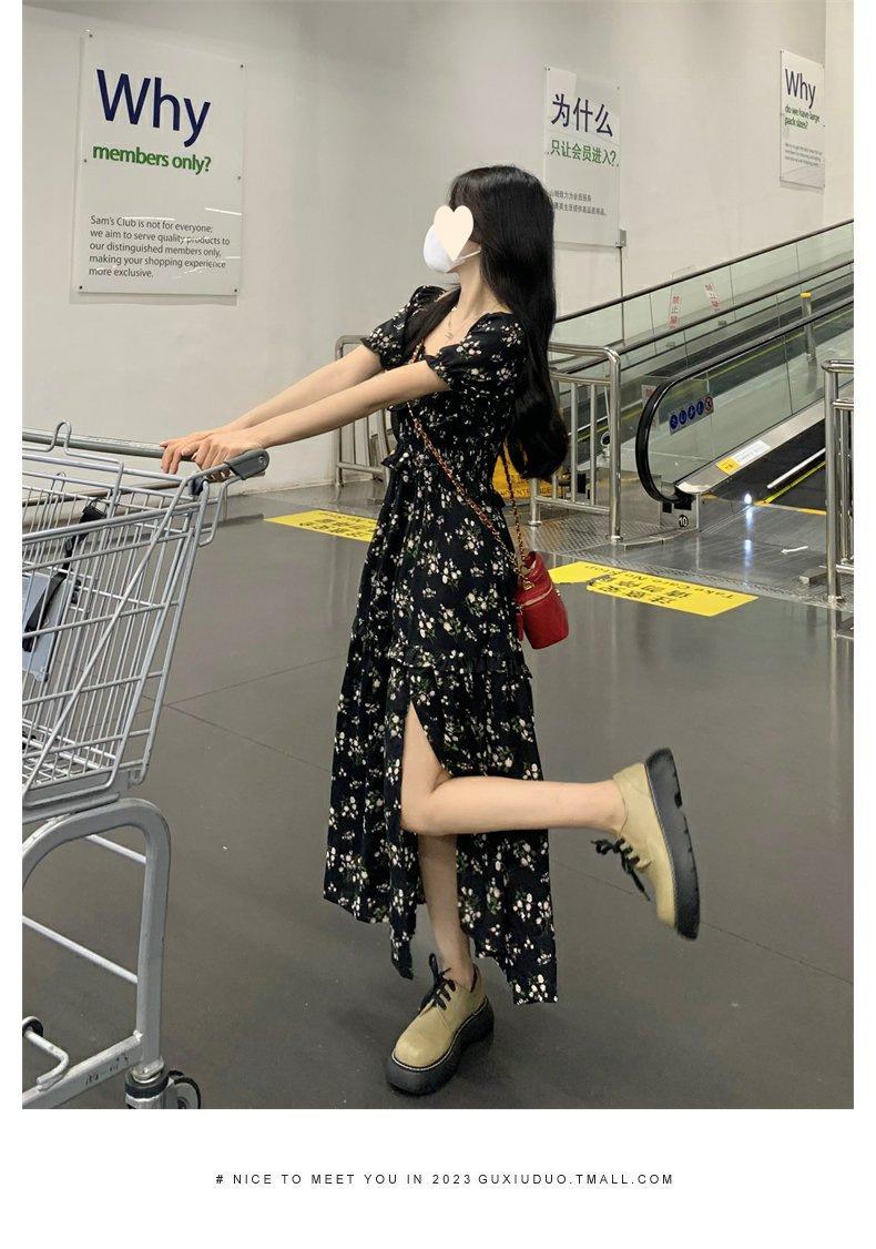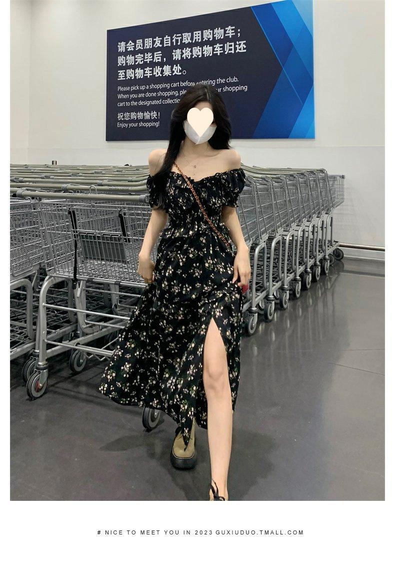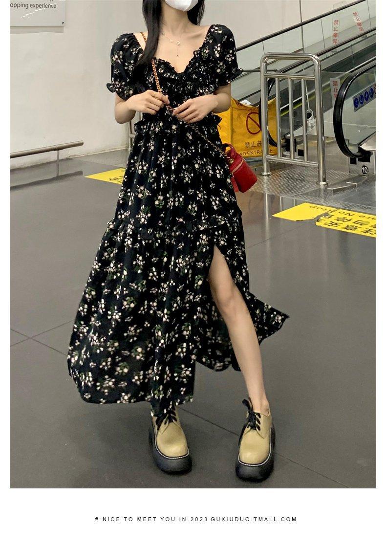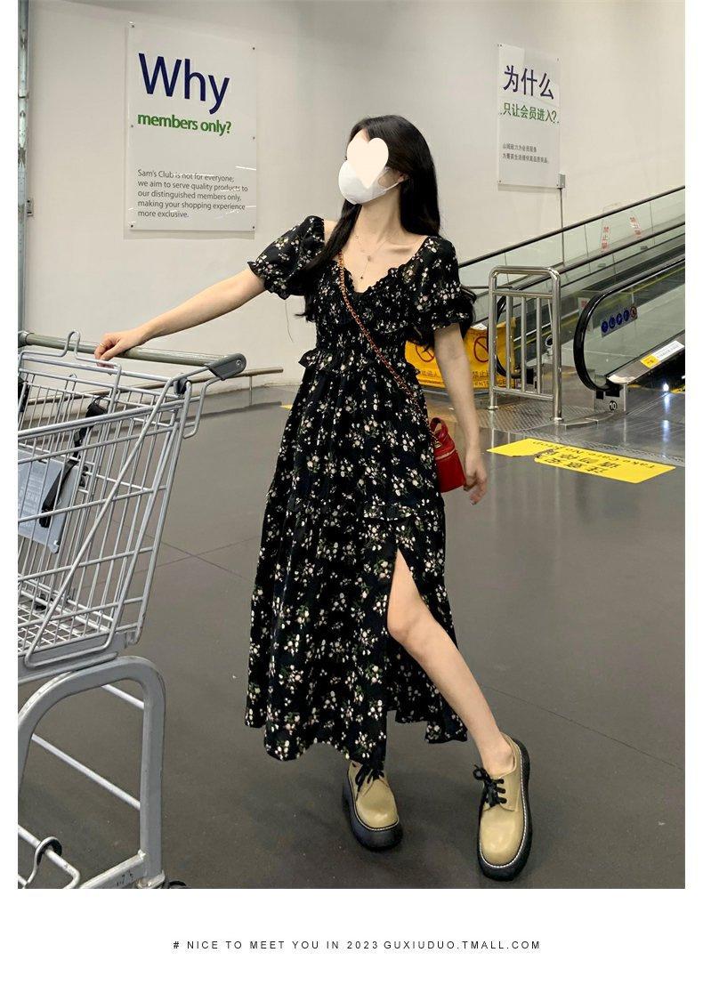 Vestido floral negro de alta gama francés, estilo real de hermana, corte alto, frío, corte de té, hermoso temperamento, vestido largo con tirantes para verano.
