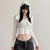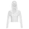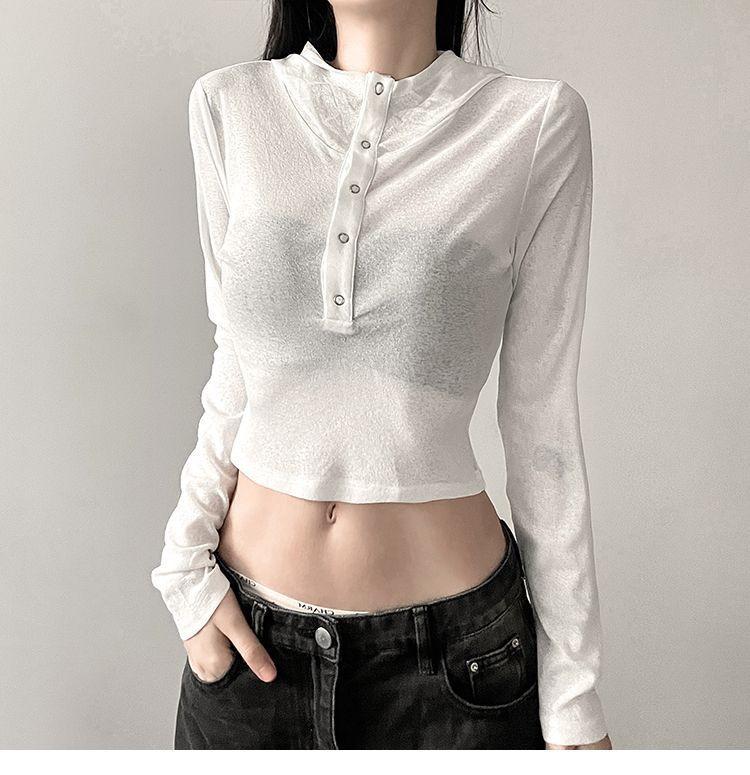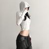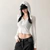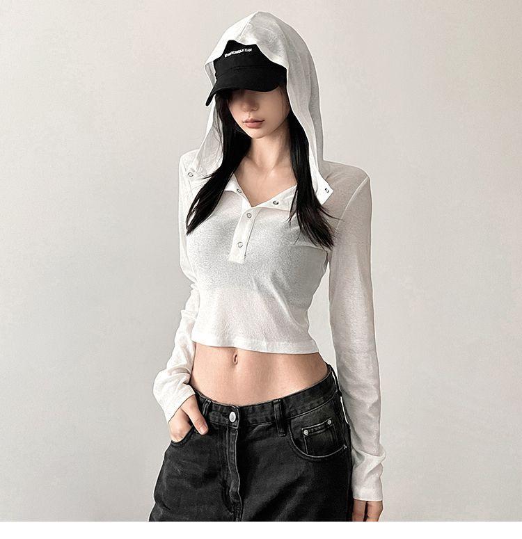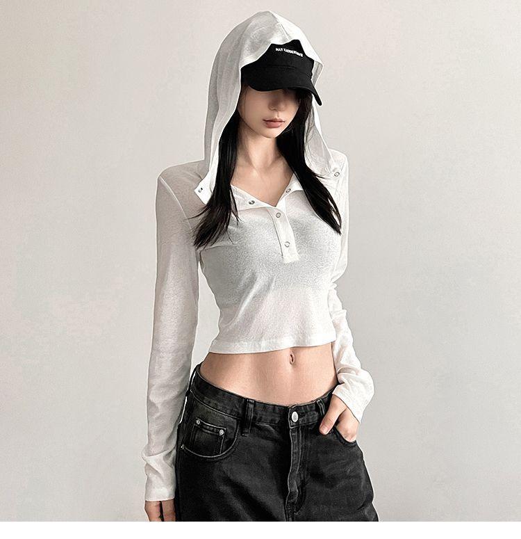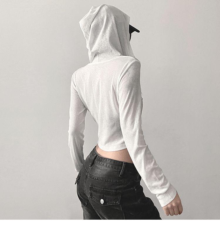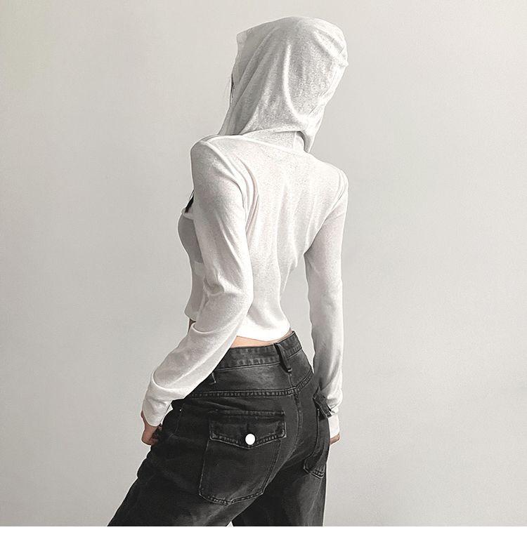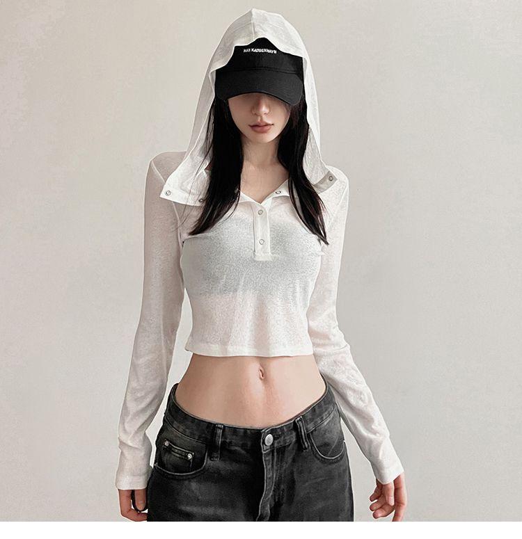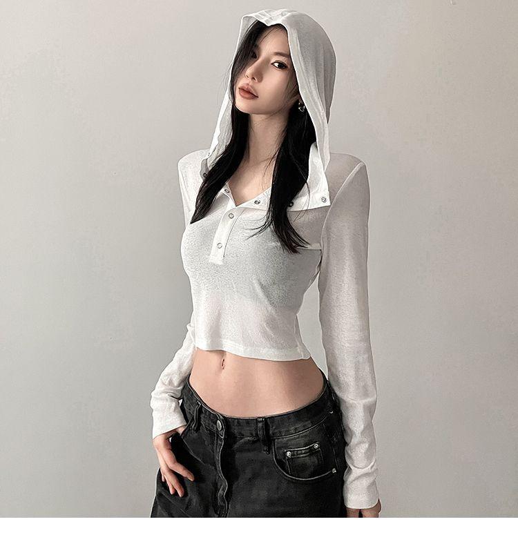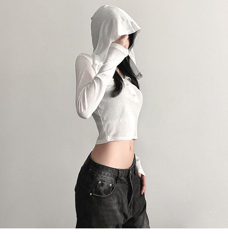 Camiseta Sexy Europea y Americana de Cintura Alta Estilo Spice Girl de Manga Larga con Capucha para Mujer Nuevo Diseño Ajustado que Combina con Todo Top Corto