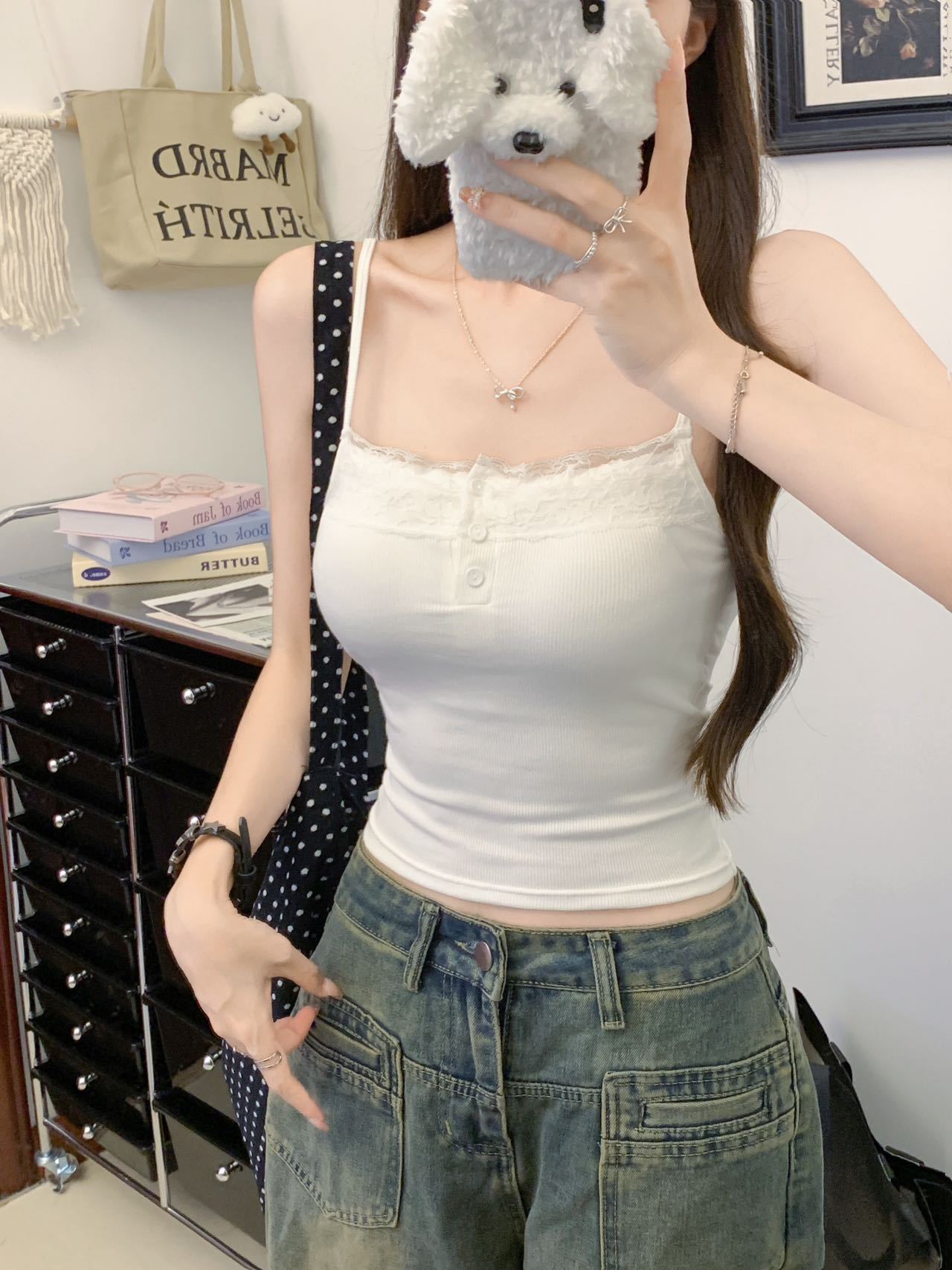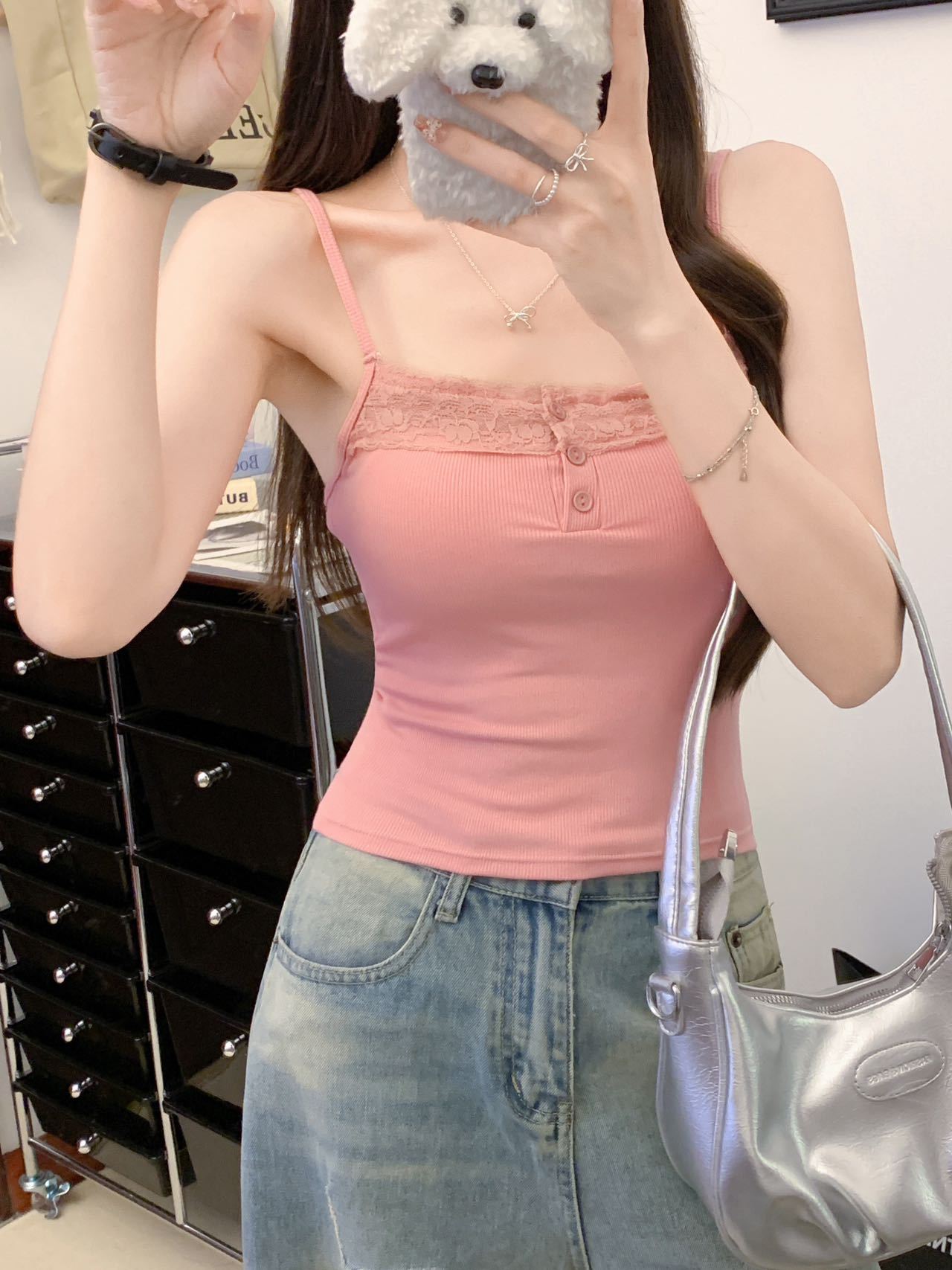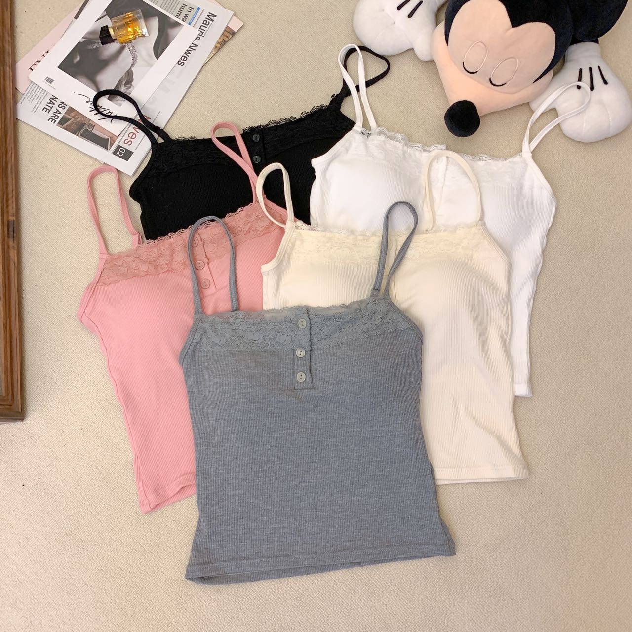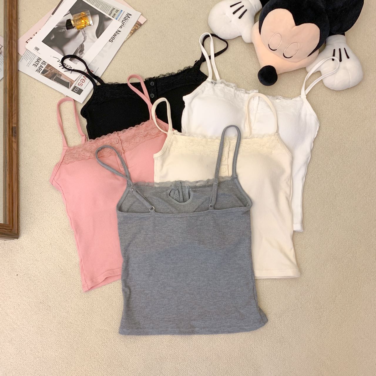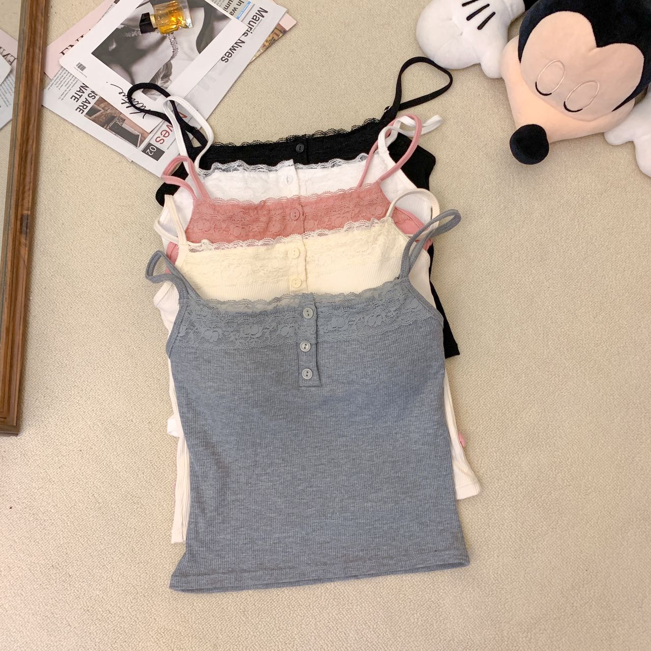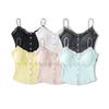 Estilo Lujuria Pura Sexy Encaje Empalmado Camisola con Botones para Mujer Ajustada Top de Chica Caliente con Almohadillas para el Busto Dentro Verano