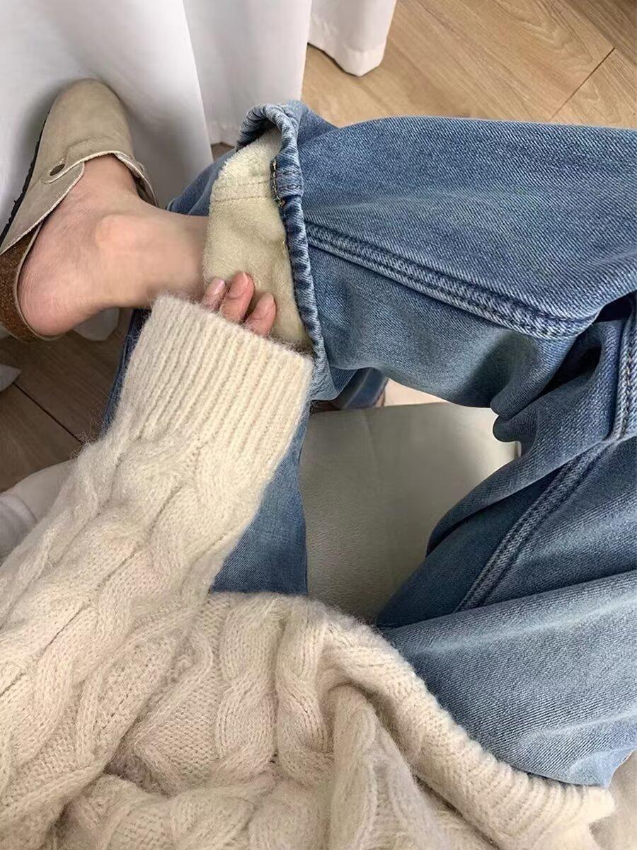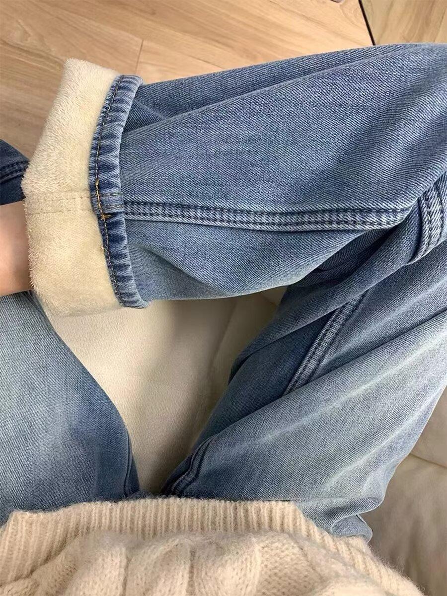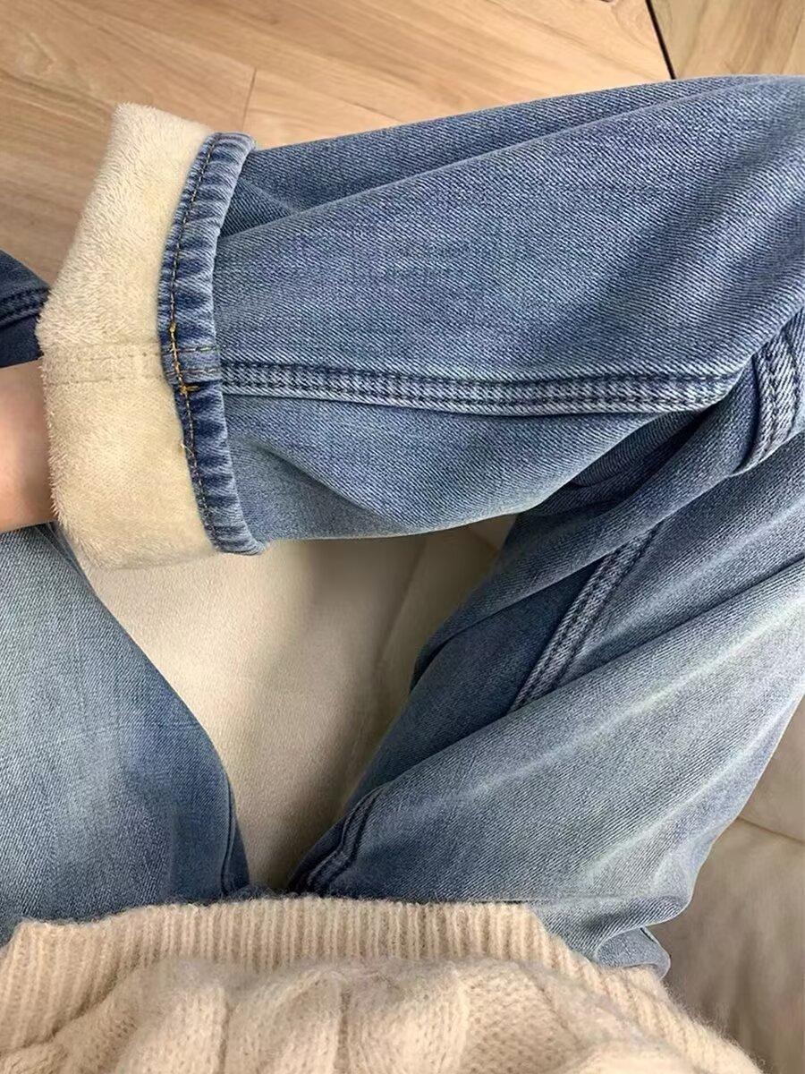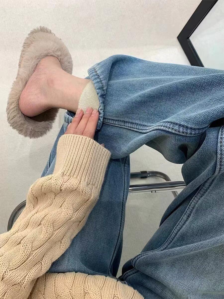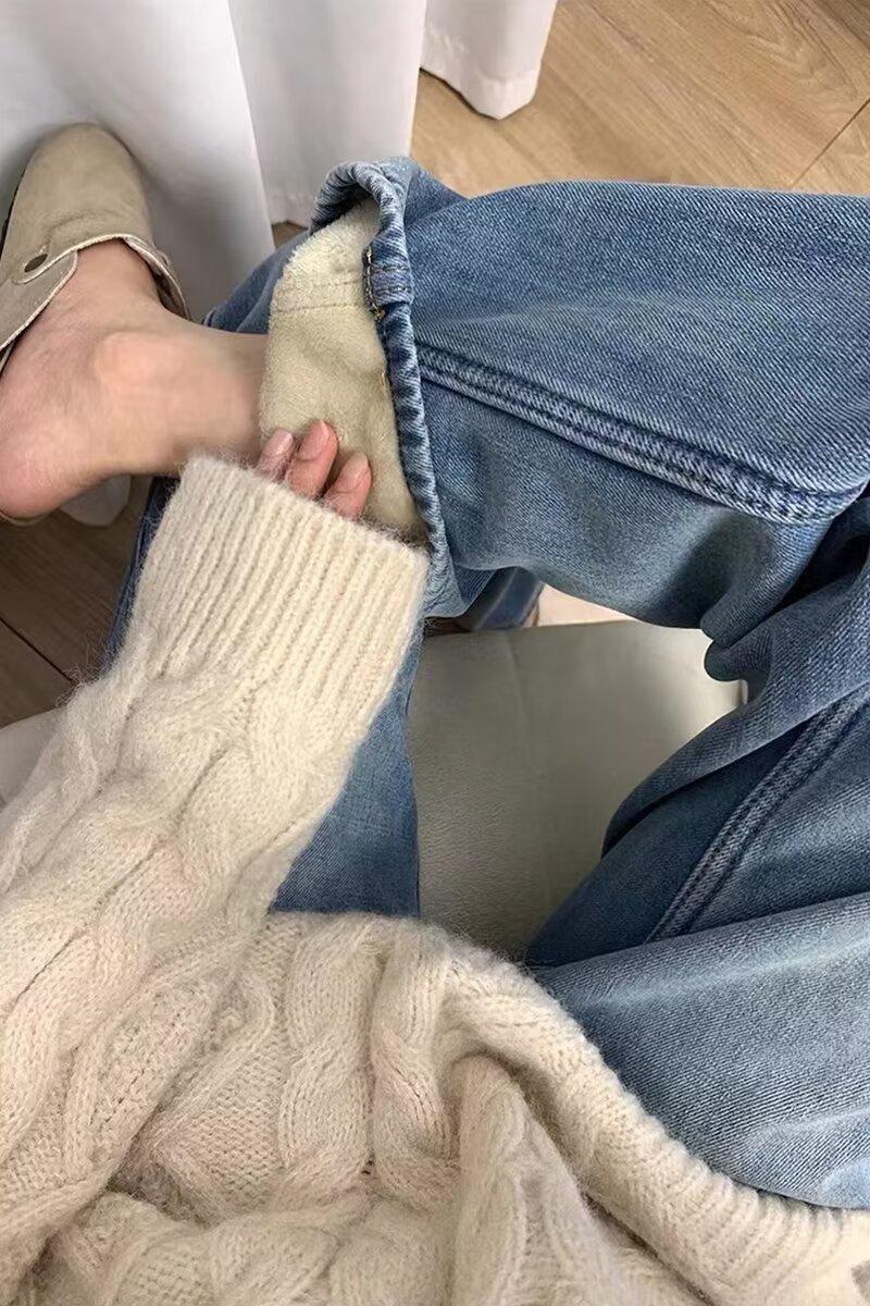 Pantalones vaqueros de cintura alta para mujer, de invierno, con forro polar, gruesos, de talla grande, para chica gordita, holgados, adelgazantes, estrechos, con forma de pera y pierna ancha.