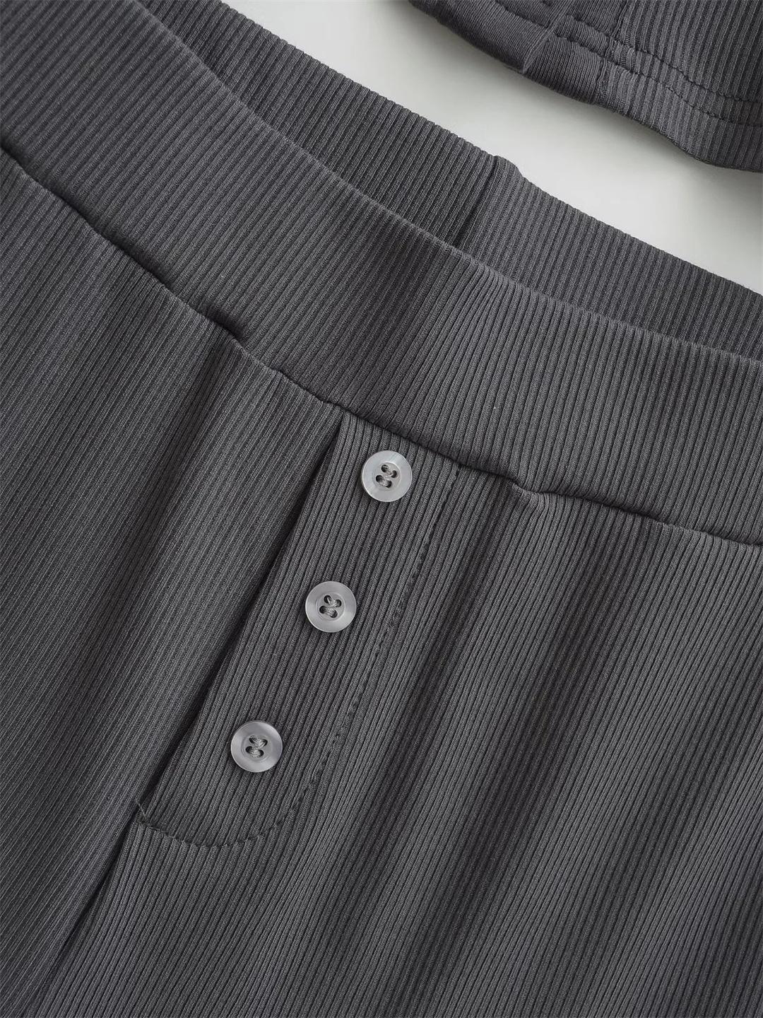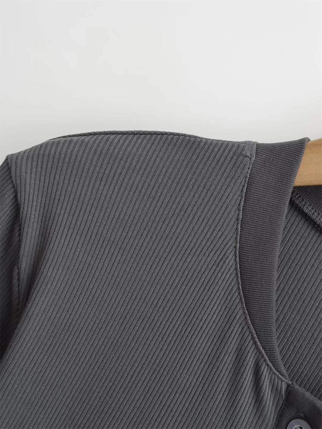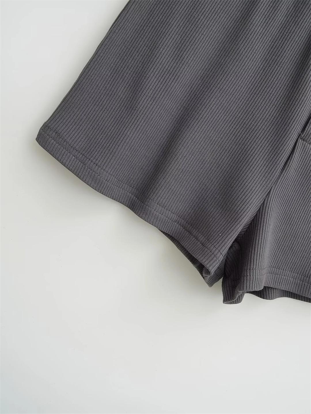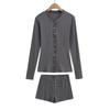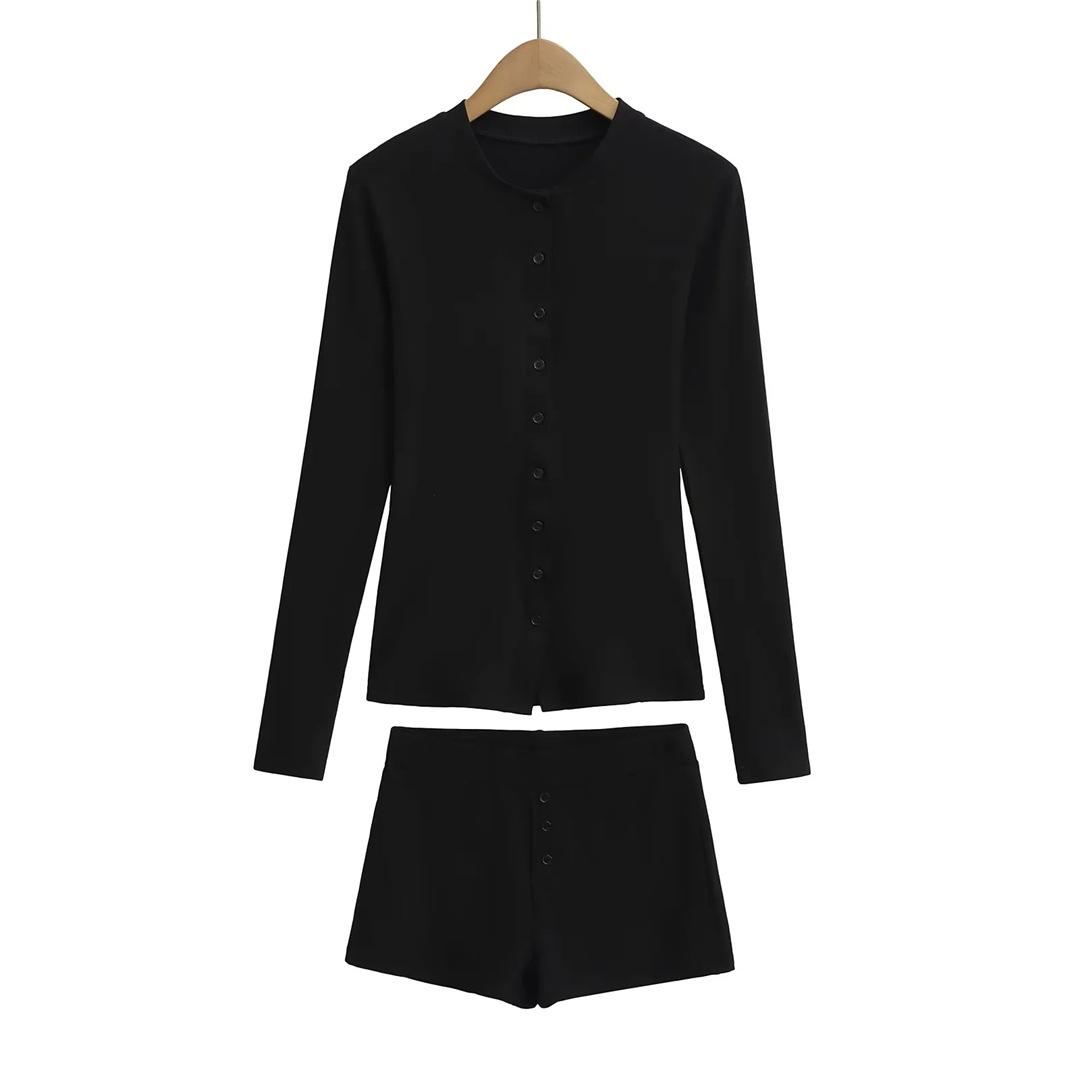 Top Camiseta Cárdigan Slim de Punto con Cuello Redondo y Abotonadura Sencilla con Bloques de Color Personalizado, Pantalones Cortos Tipo Traje con Cintura Elástica y Botones que Cubren la Cadera