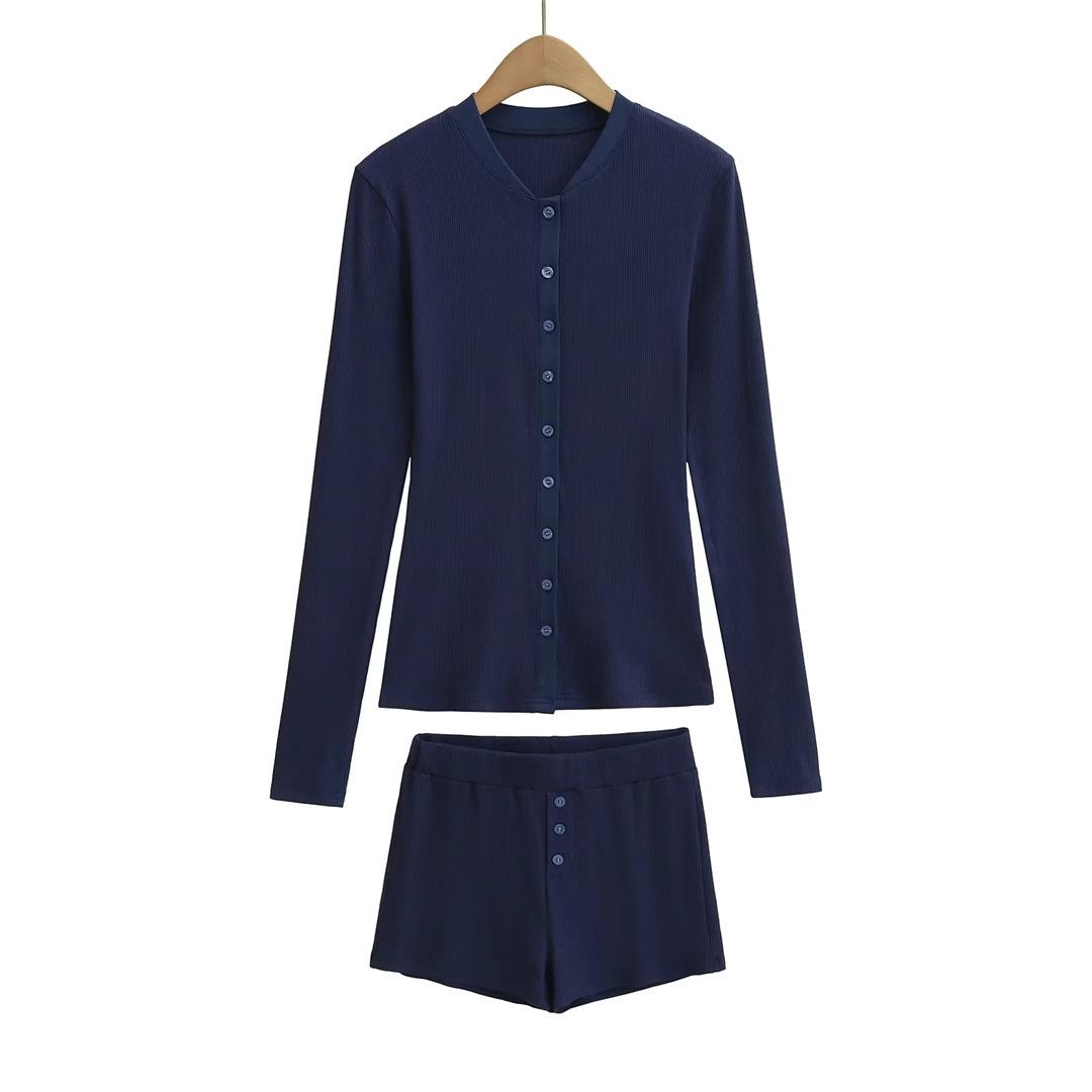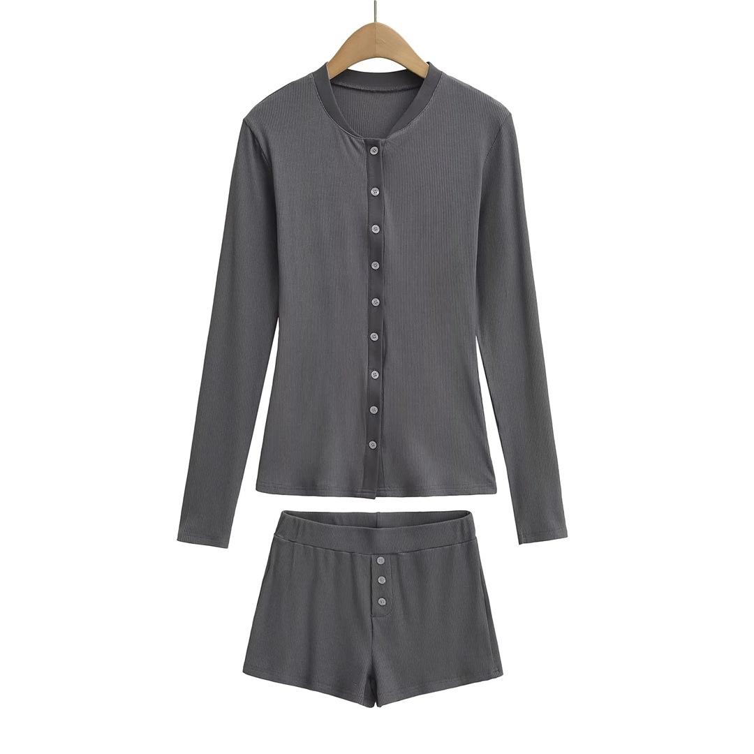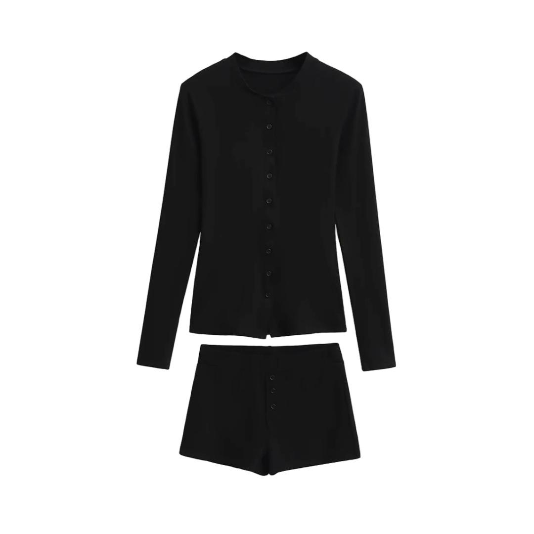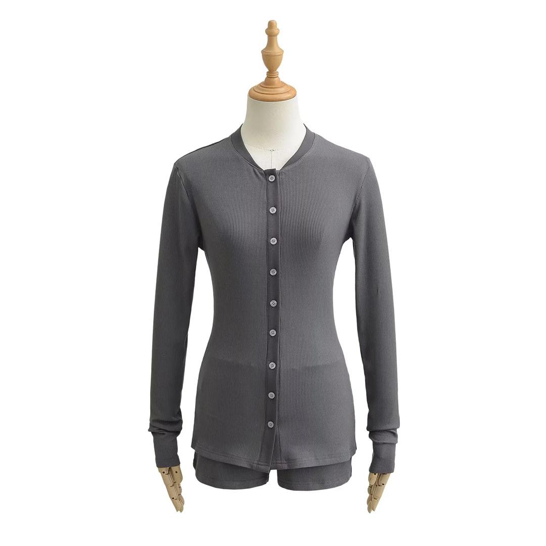 Top Camiseta Cárdigan Slim de Punto con Cuello Redondo y Abotonadura Sencilla con Bloques de Color Personalizado, Pantalones Cortos Tipo Traje con Cintura Elástica y Botones que Cubren la Cadera