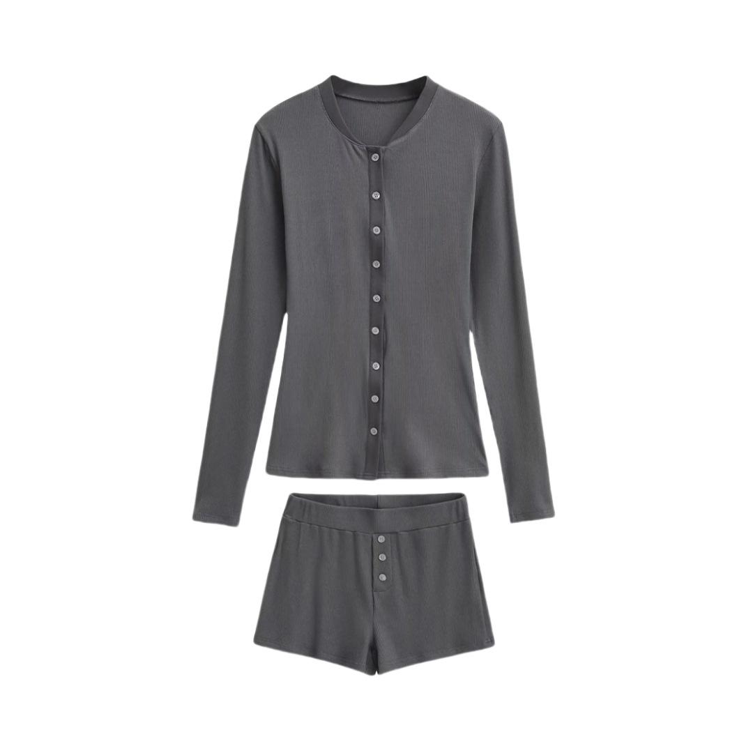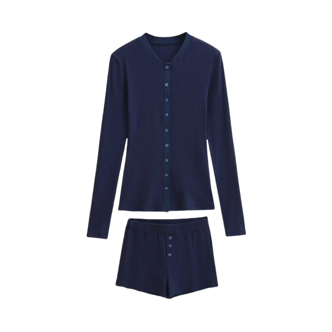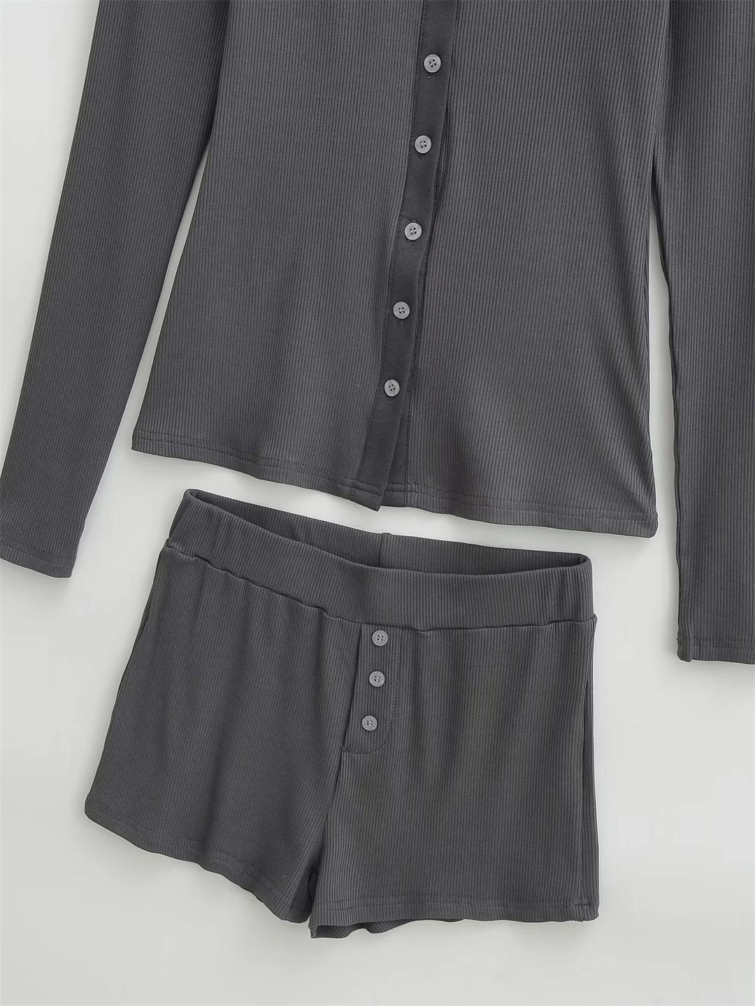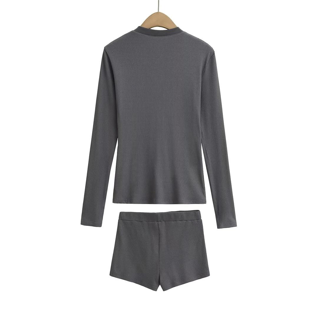 Top Camiseta Cárdigan Slim de Punto con Cuello Redondo y Abotonadura Sencilla con Bloques de Color Personalizado, Pantalones Cortos Tipo Traje con Cintura Elástica y Botones que Cubren la Cadera