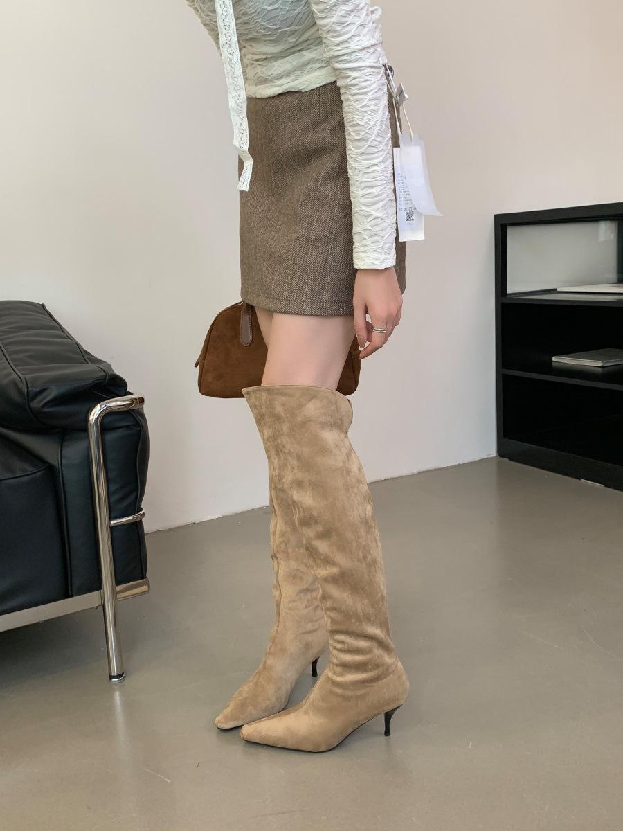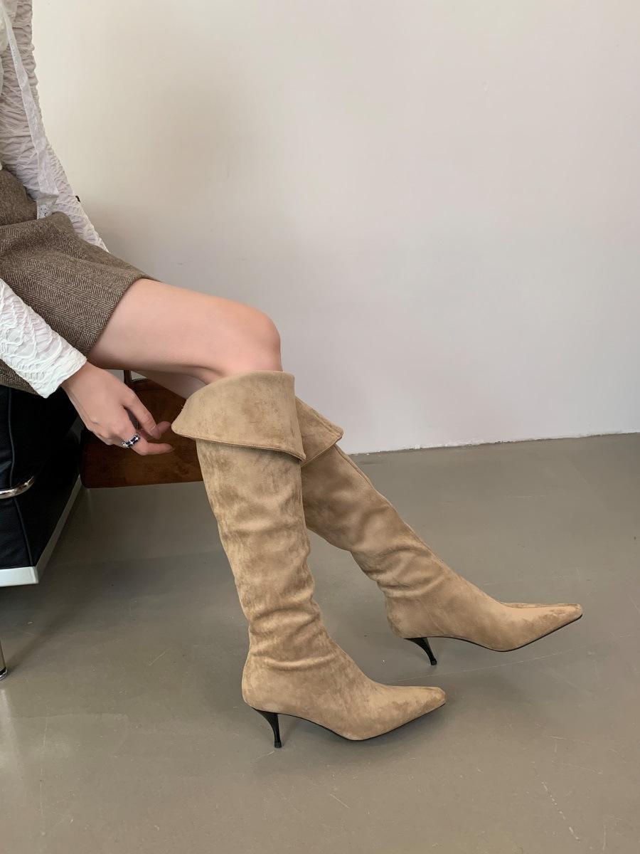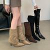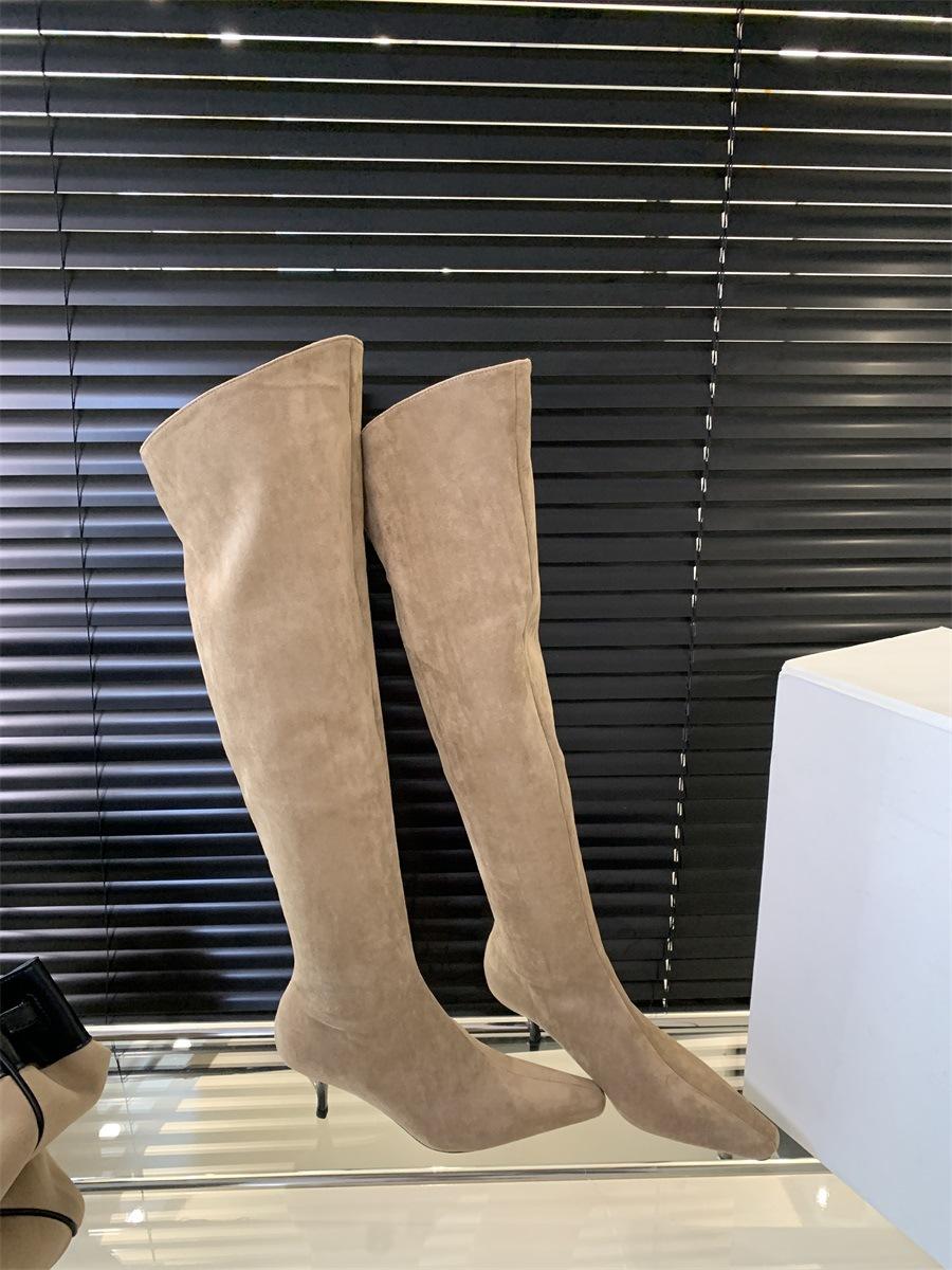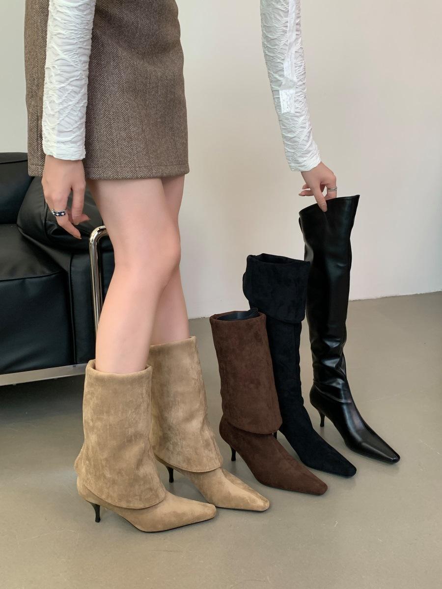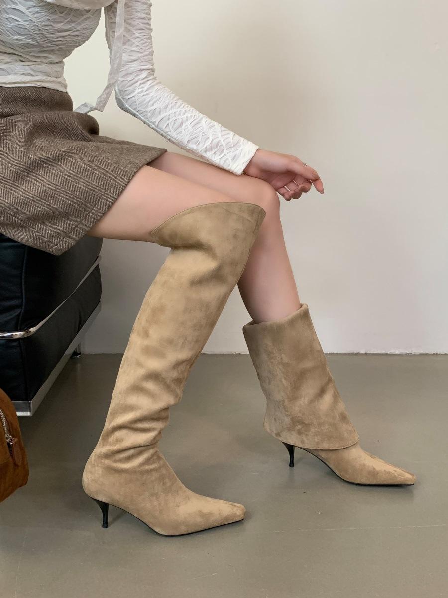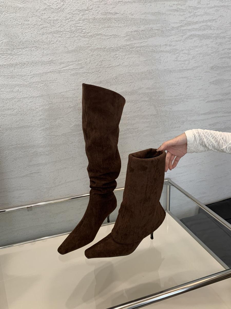 2024 Nuevas Botas Spice Girl Europeas y Americanas Boca en V Gamuza Tacón Fino Puntiagudas Tacón Alto Botas Dos Usos Botas Altas
