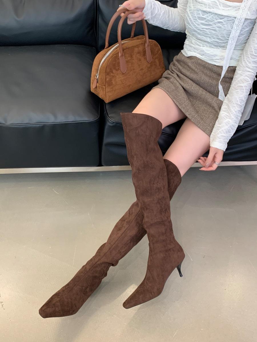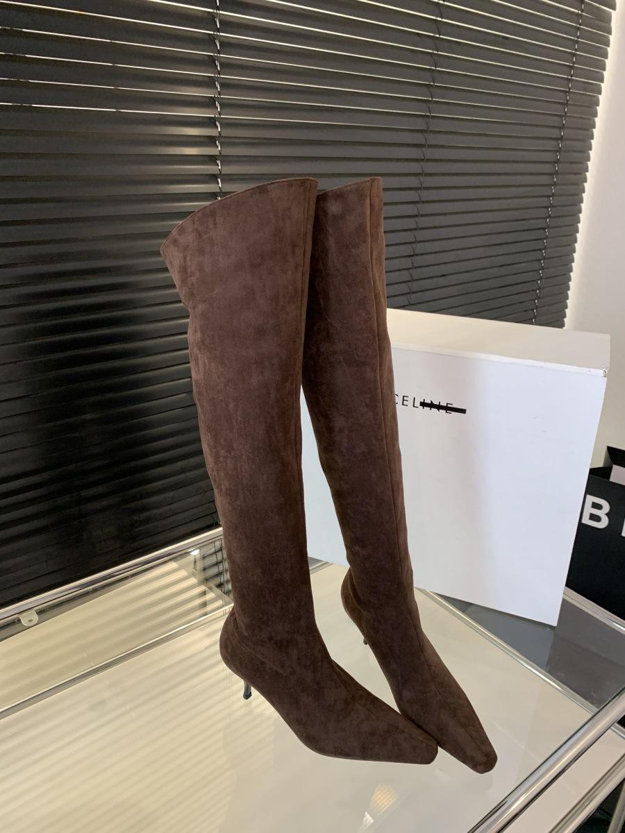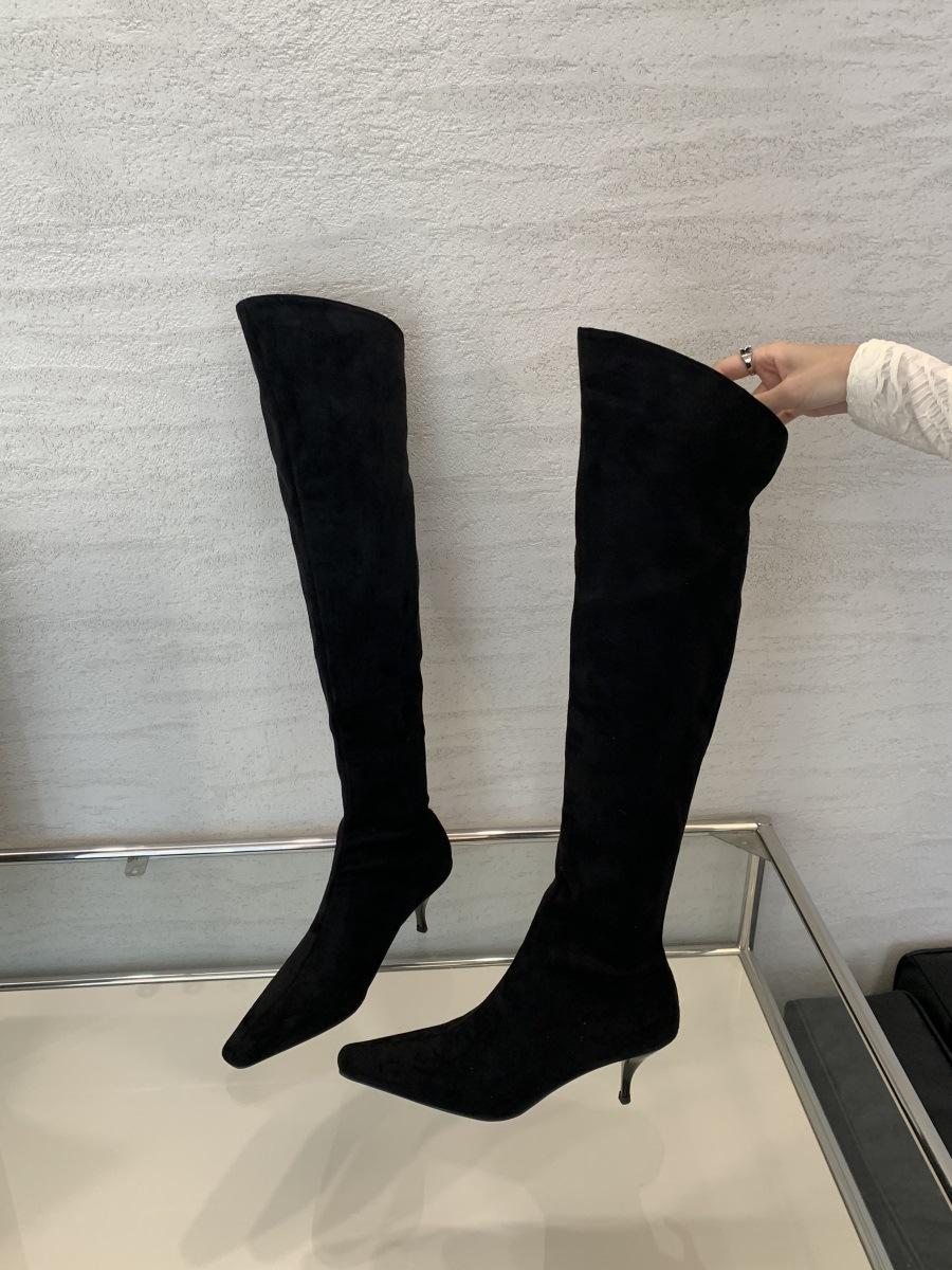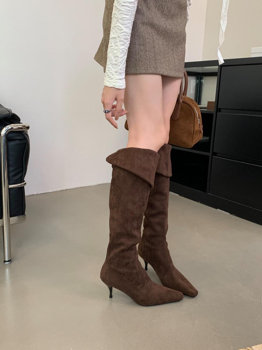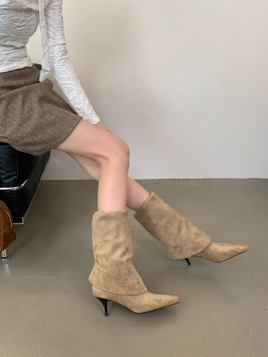 2024 Nuevas Botas Spice Girl Europeas y Americanas Boca en V Gamuza Tacón Fino Puntiagudas Tacón Alto Botas Dos Usos Botas Altas