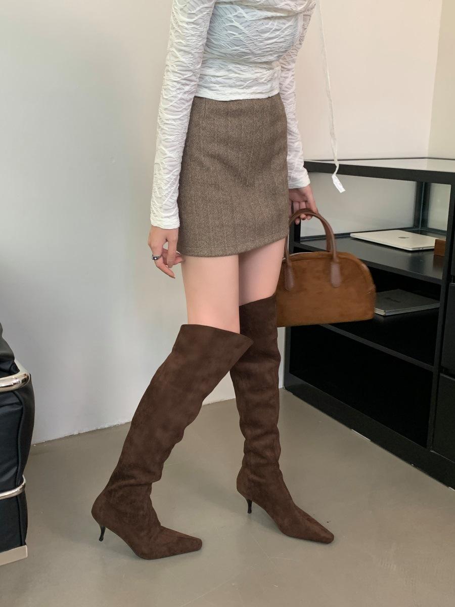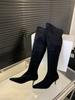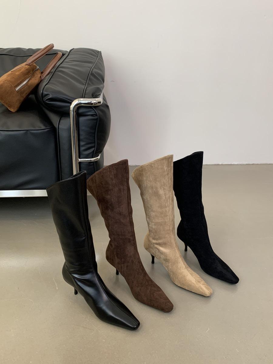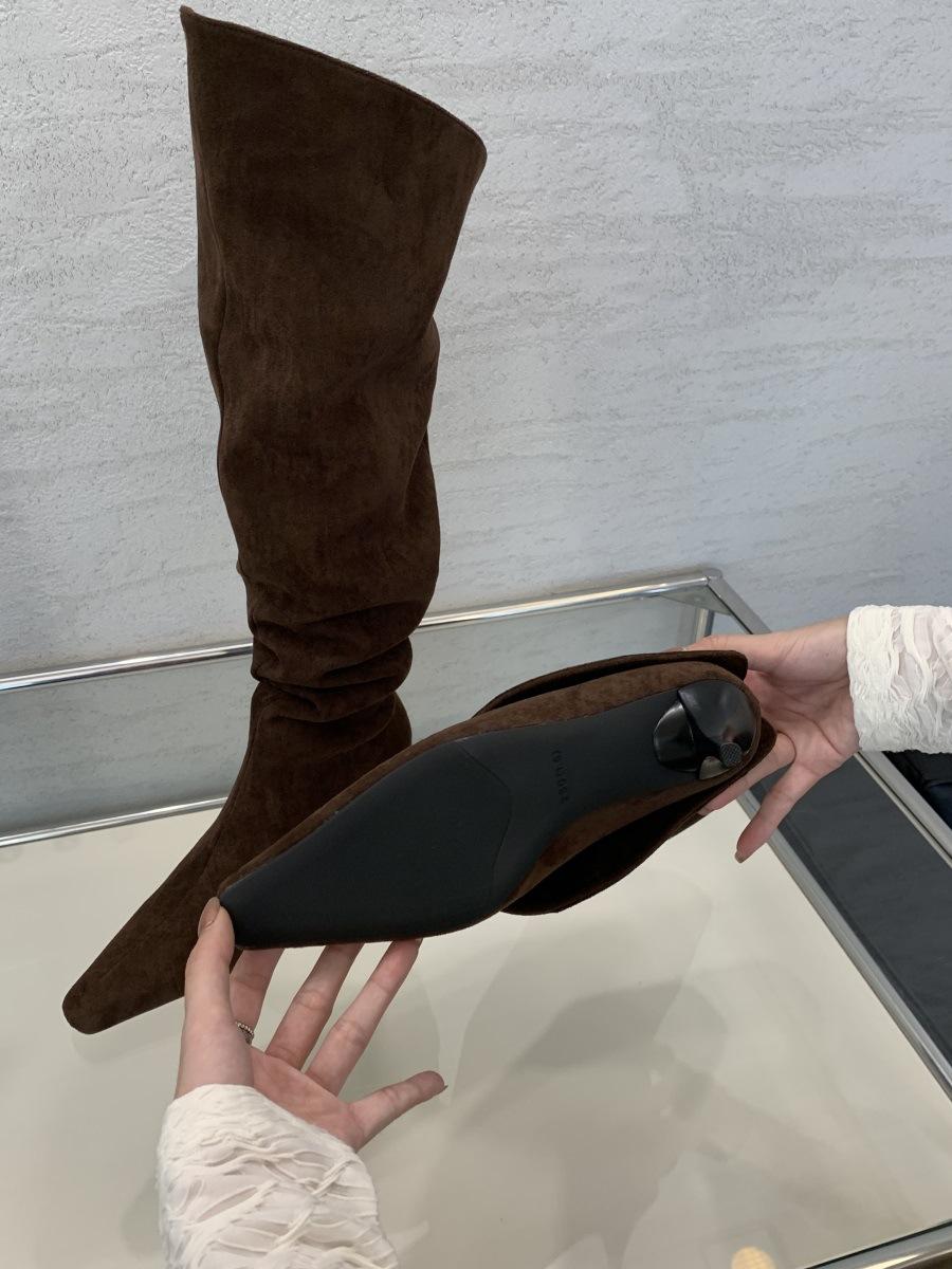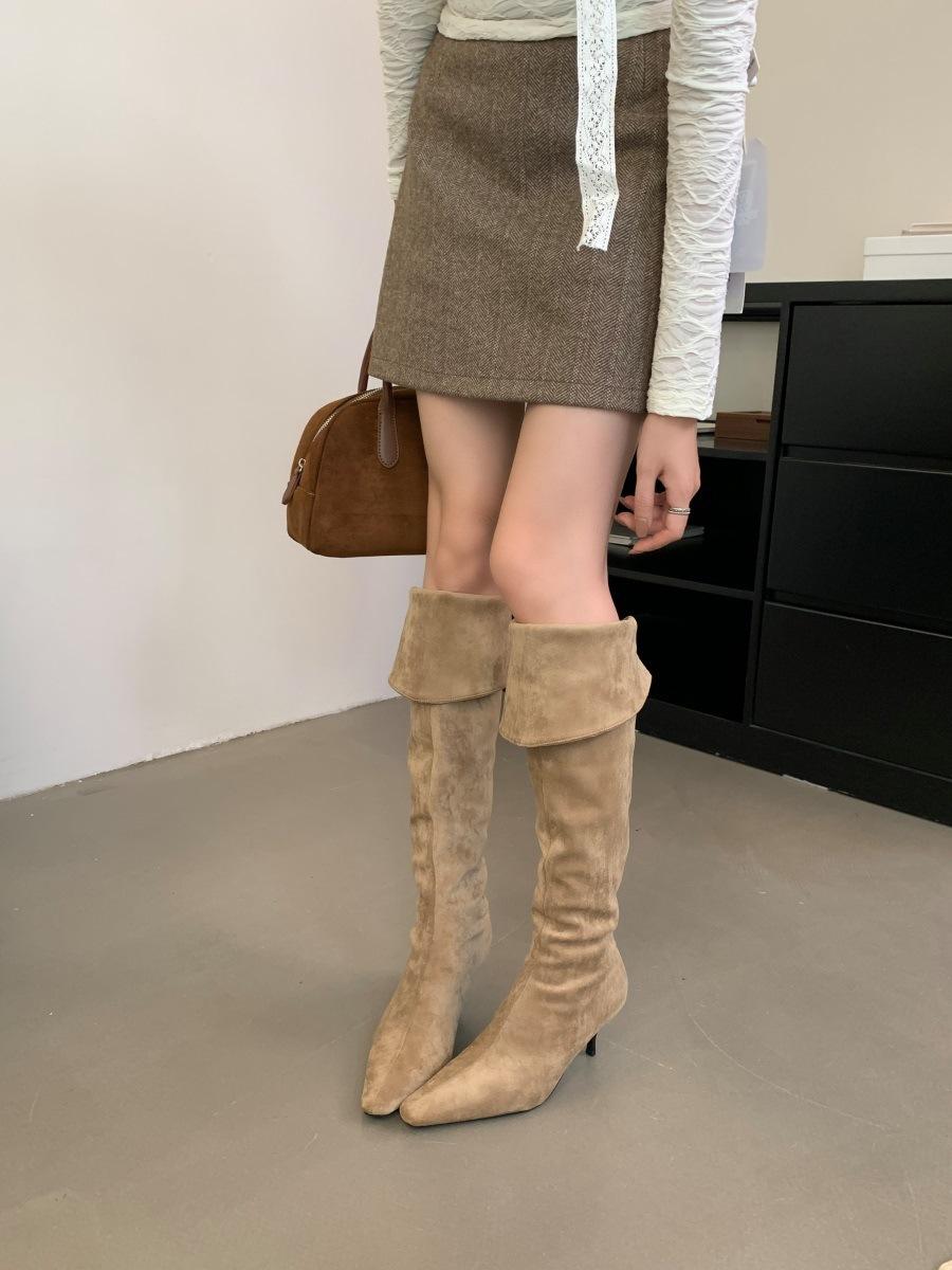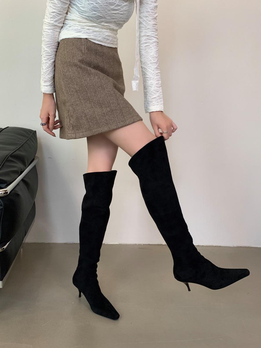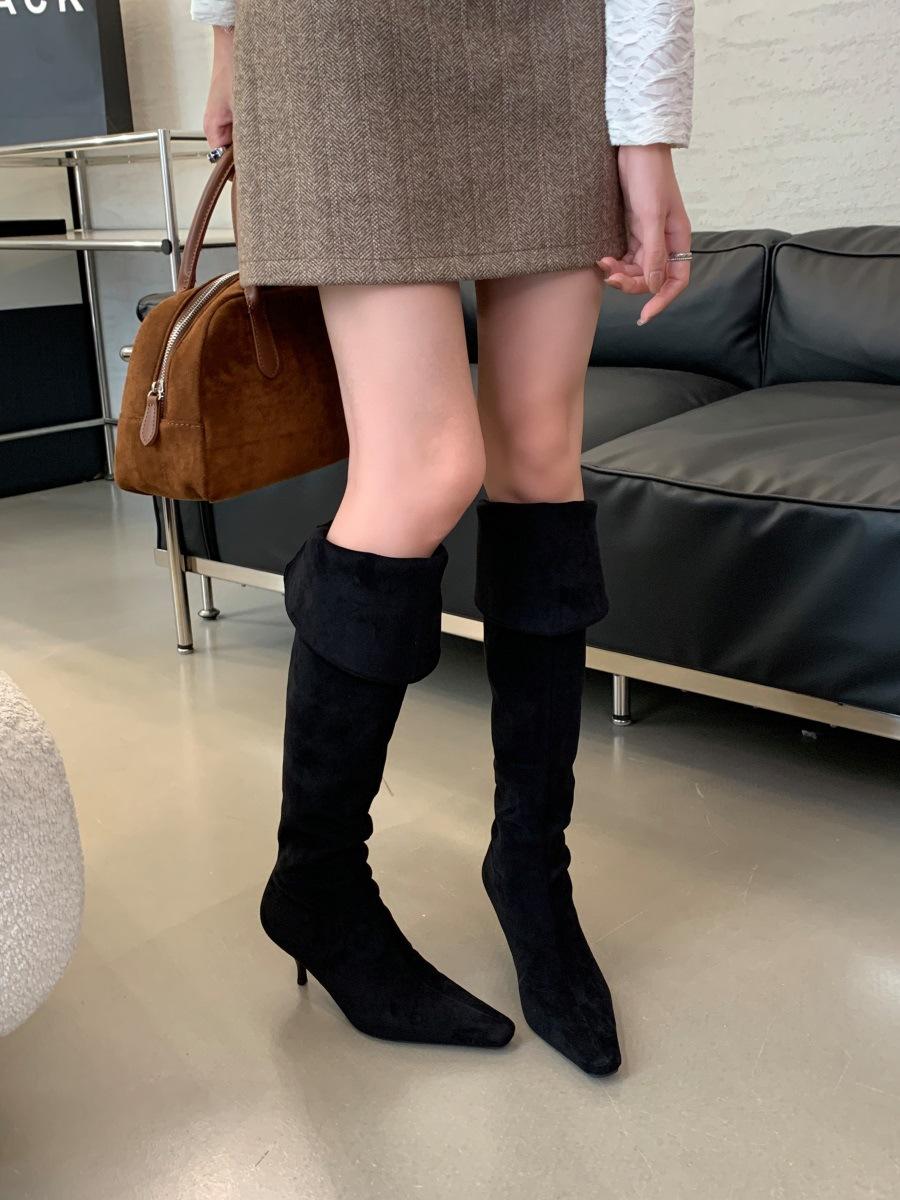 2024 Nuevas Botas Spice Girl Europeas y Americanas Boca en V Gamuza Tacón Fino Puntiagudas Tacón Alto Botas Dos Usos Botas Altas