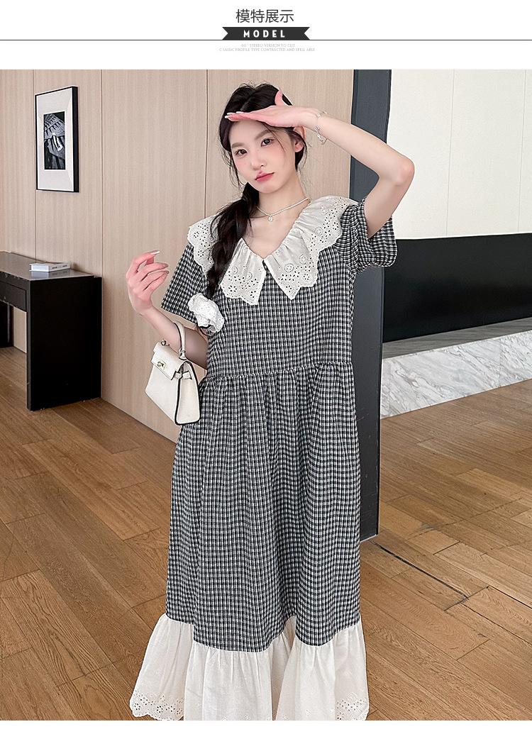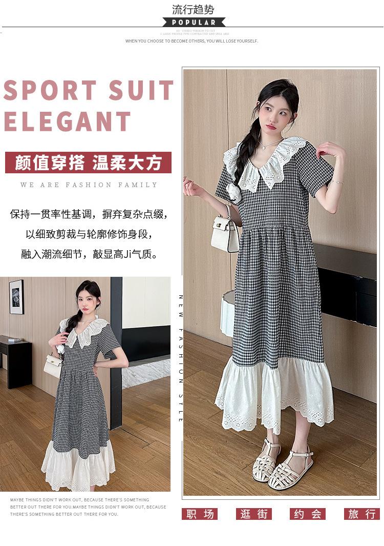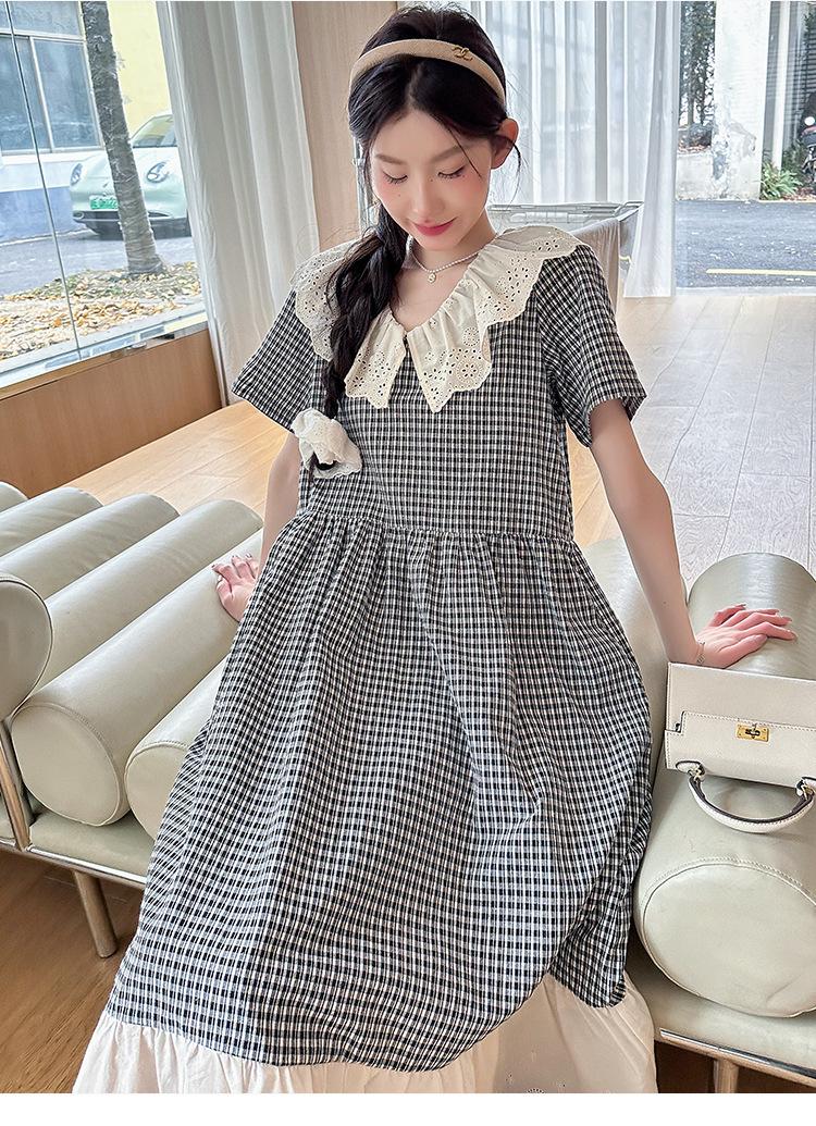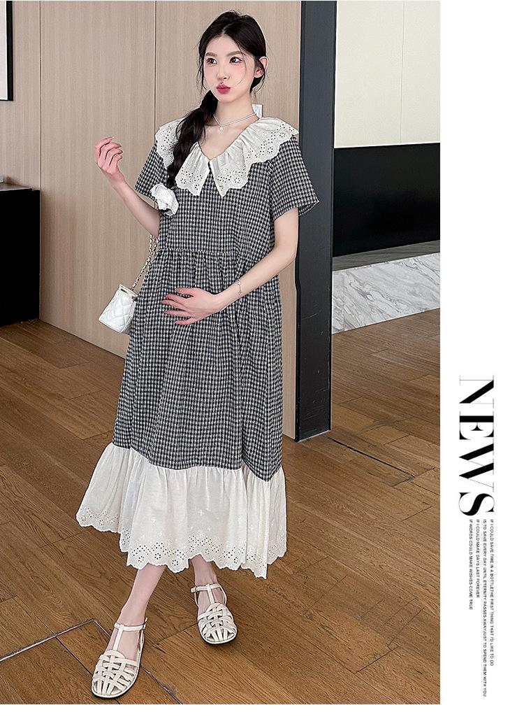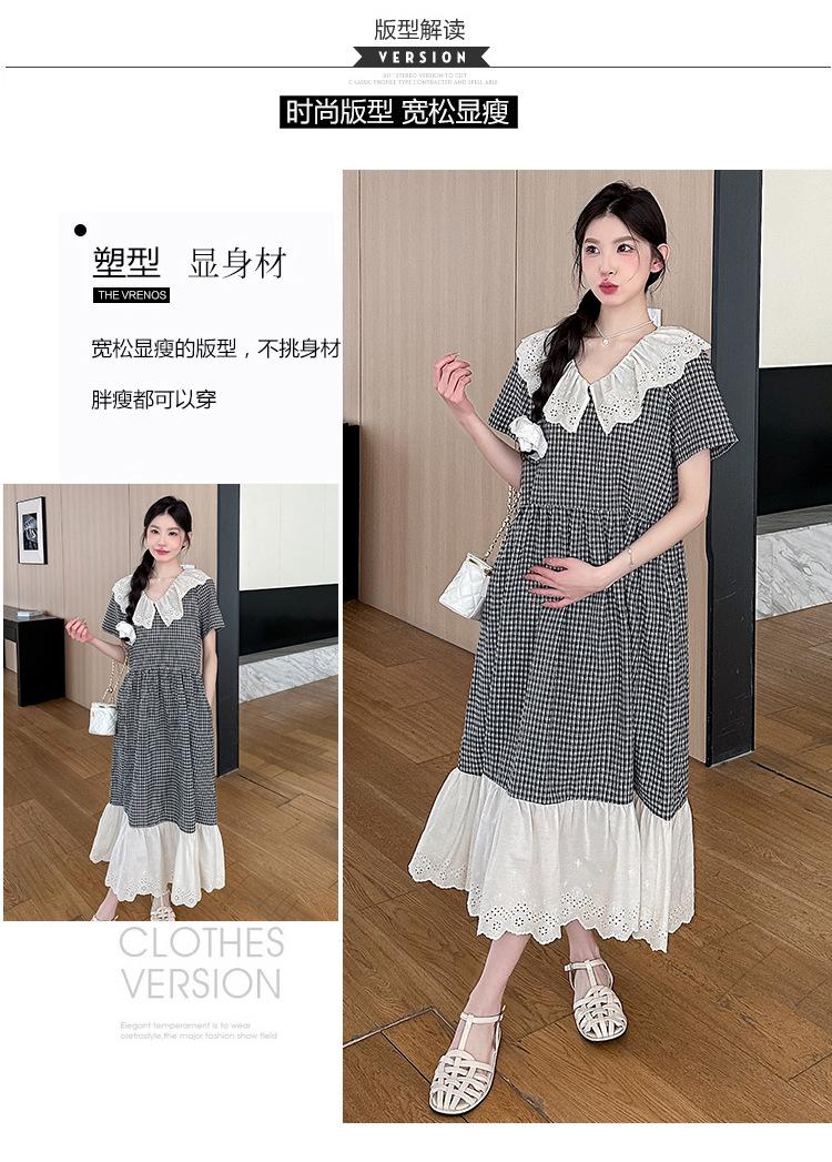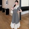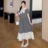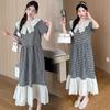 Maternidad 2025 Verano Nuevo Encaje Encaje Costuras a Cuadros Cuello en V Temperamento Retro Francés Vestido de Mujer Embarazada