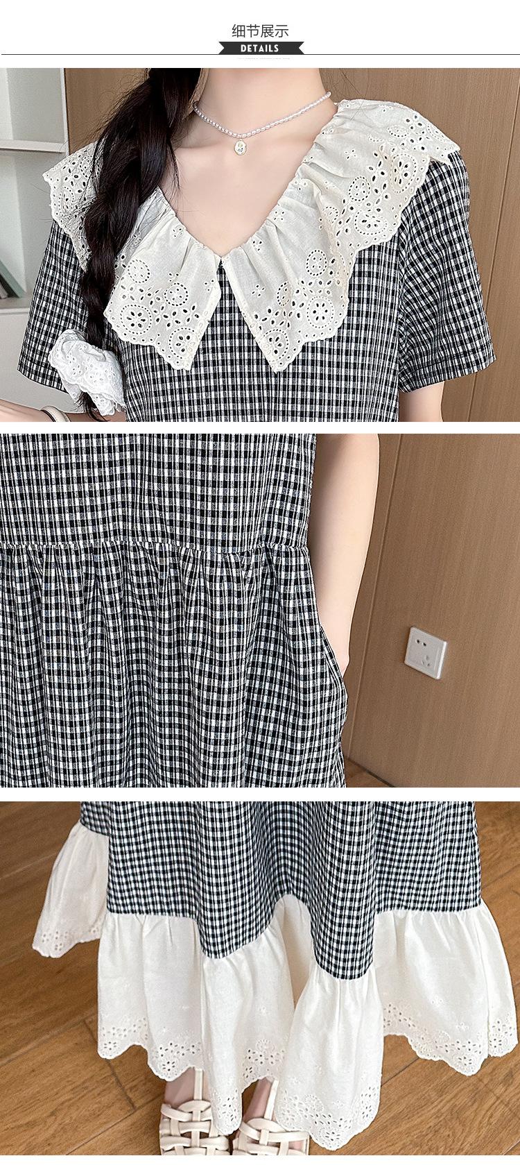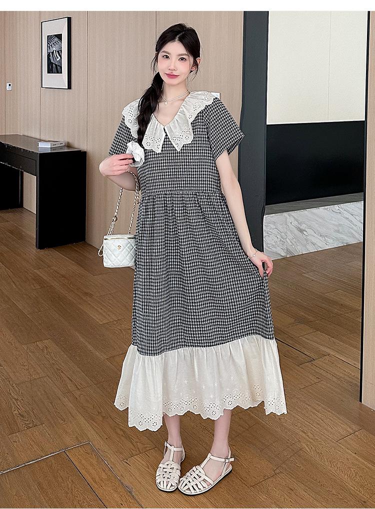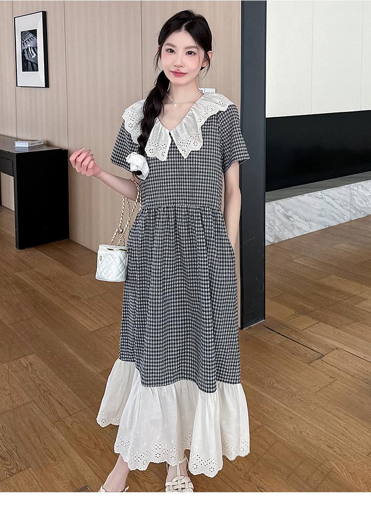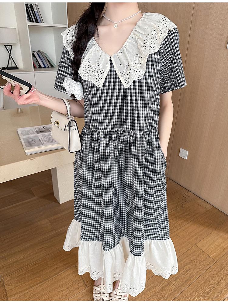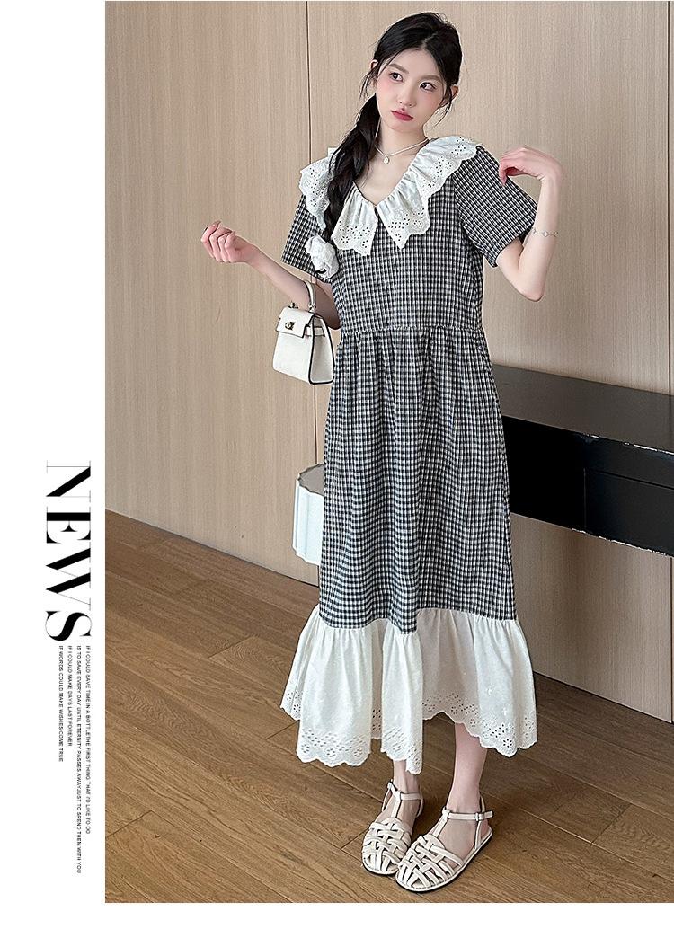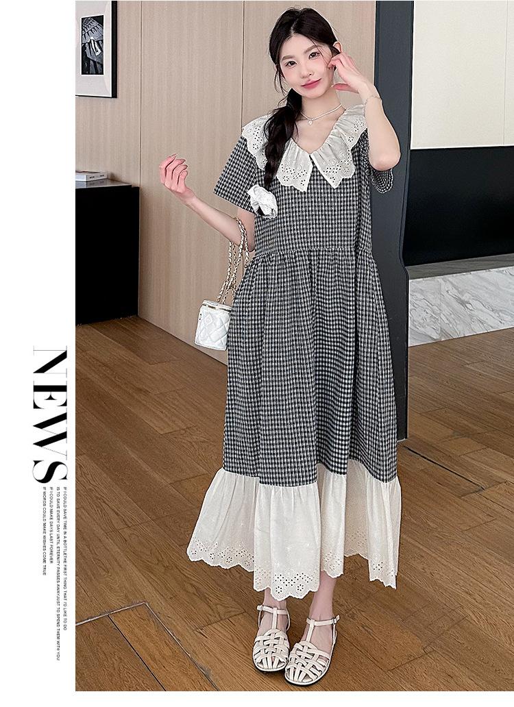 Maternidad 2025 Verano Nuevo Encaje Encaje Costuras a Cuadros Cuello en V Temperamento Retro Francés Vestido de Mujer Embarazada