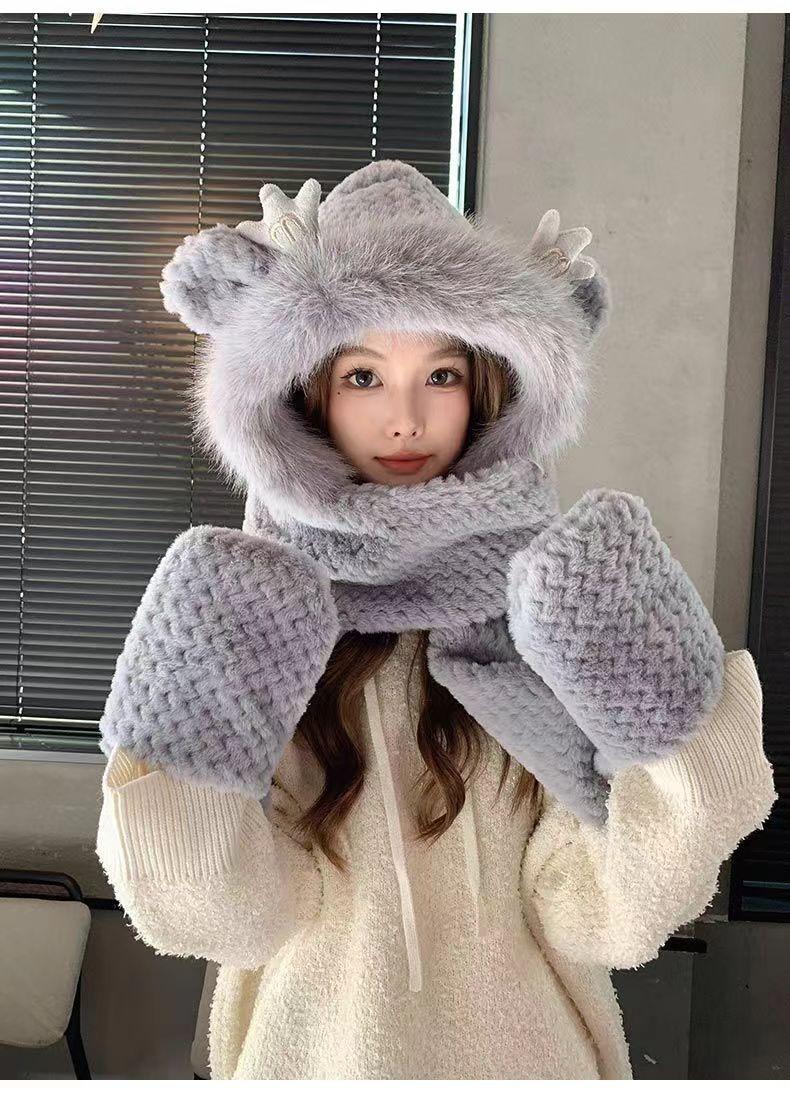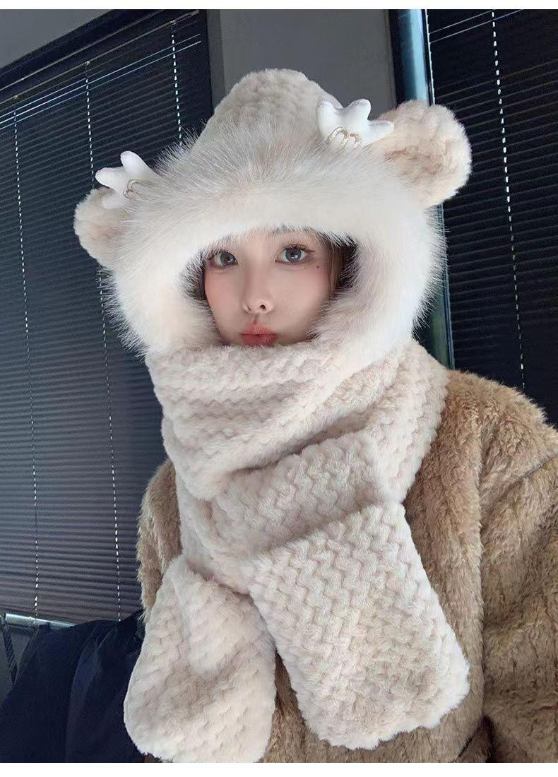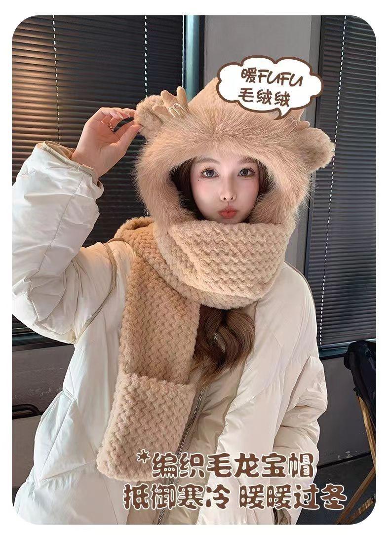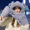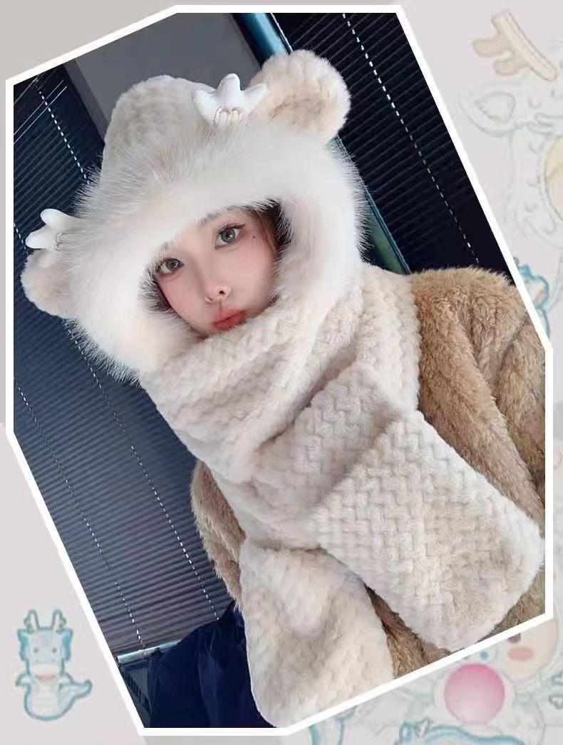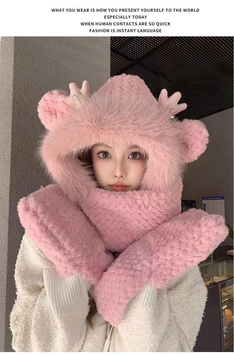Gorro de Invierno Bufanda y Guantes para Niños Conjunto de Tres Piezas de Una Pieza Gorro Esponjoso Lindo Longbao Bufanda Gruesa Cálido para Montar