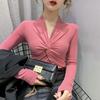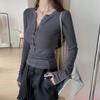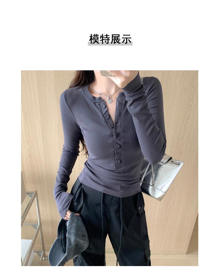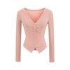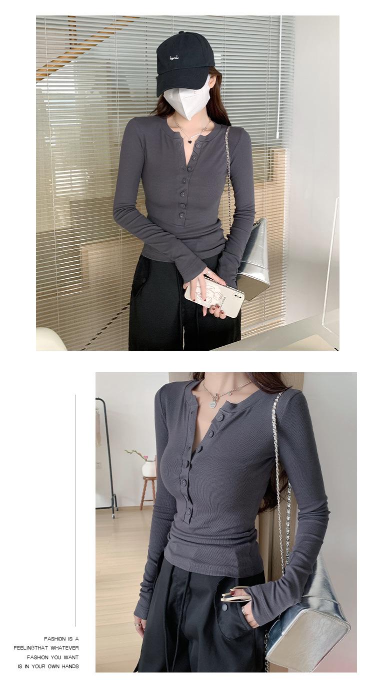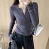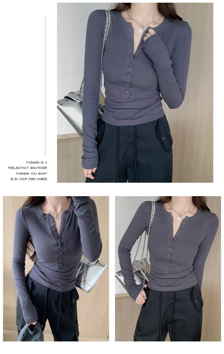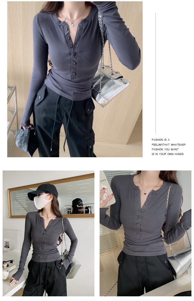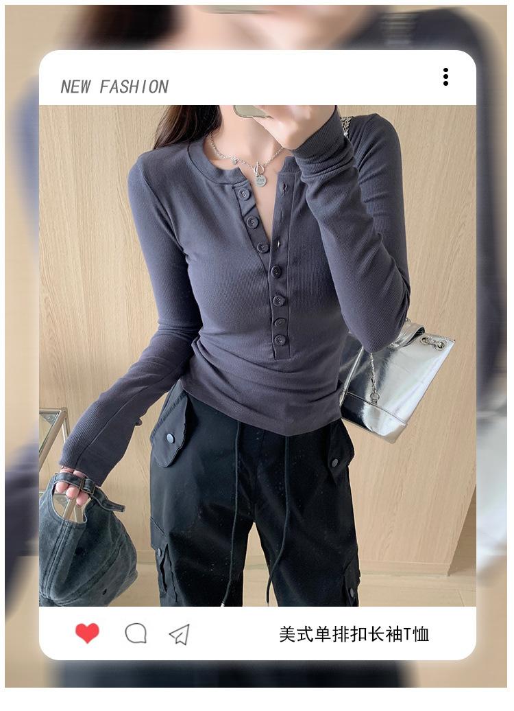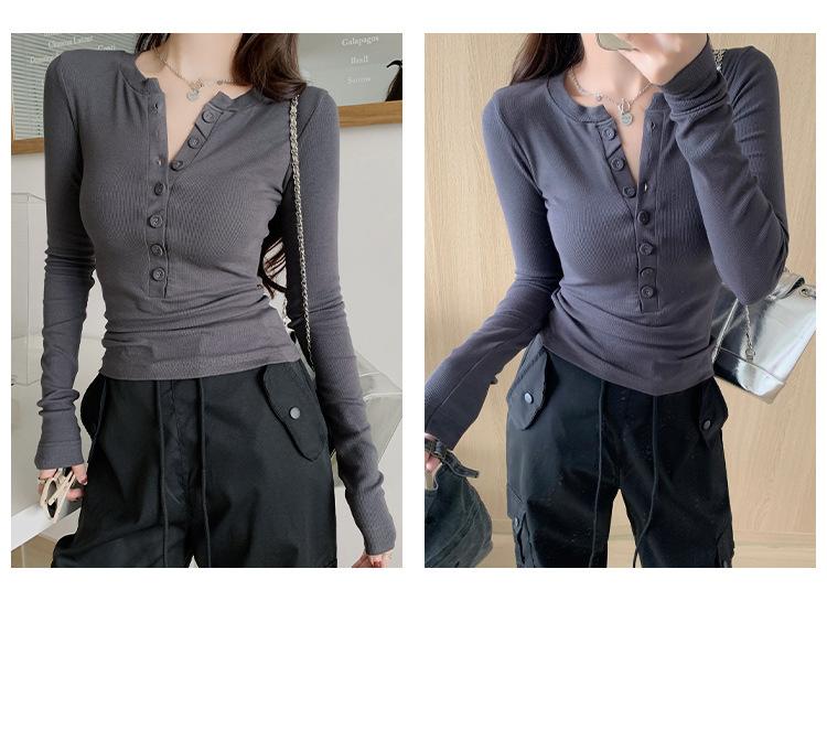 Camiseta de Manga Larga con Diseño de Botones y Cuello en V de Corte Slim para Primavera 2025, Top Urbano de Moda para Mujer