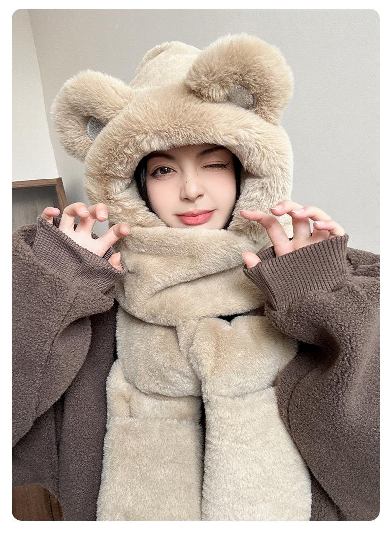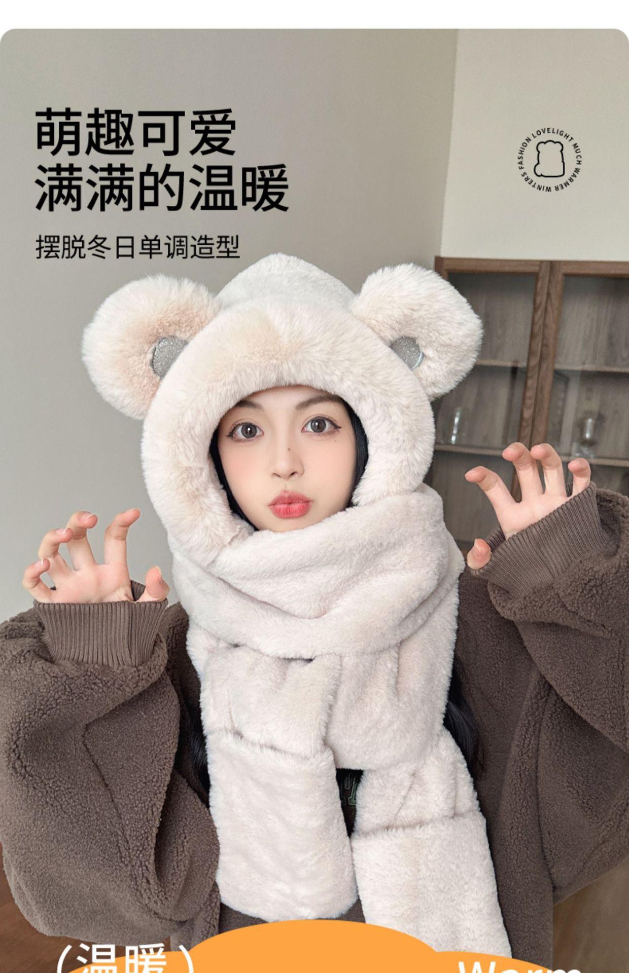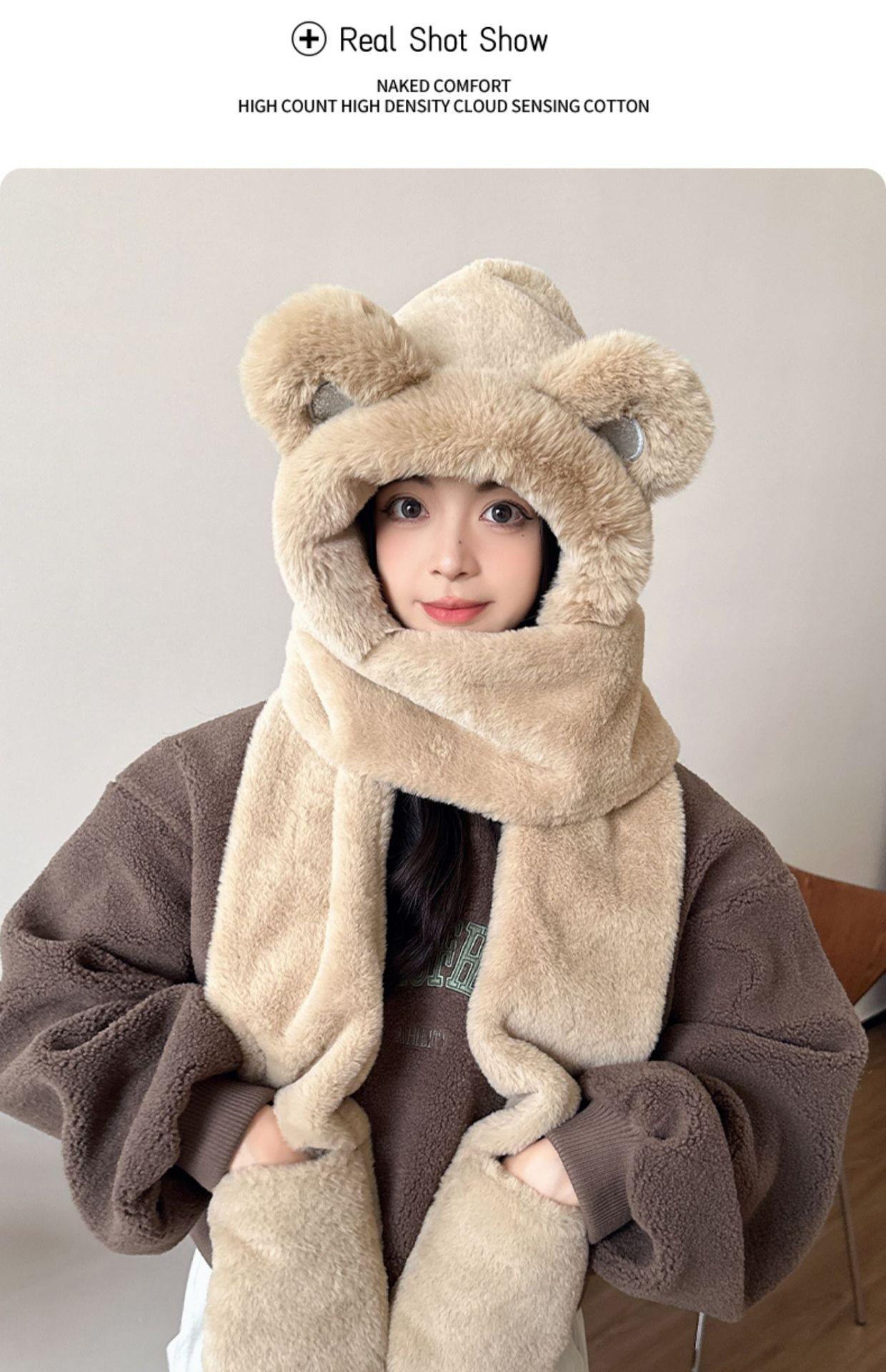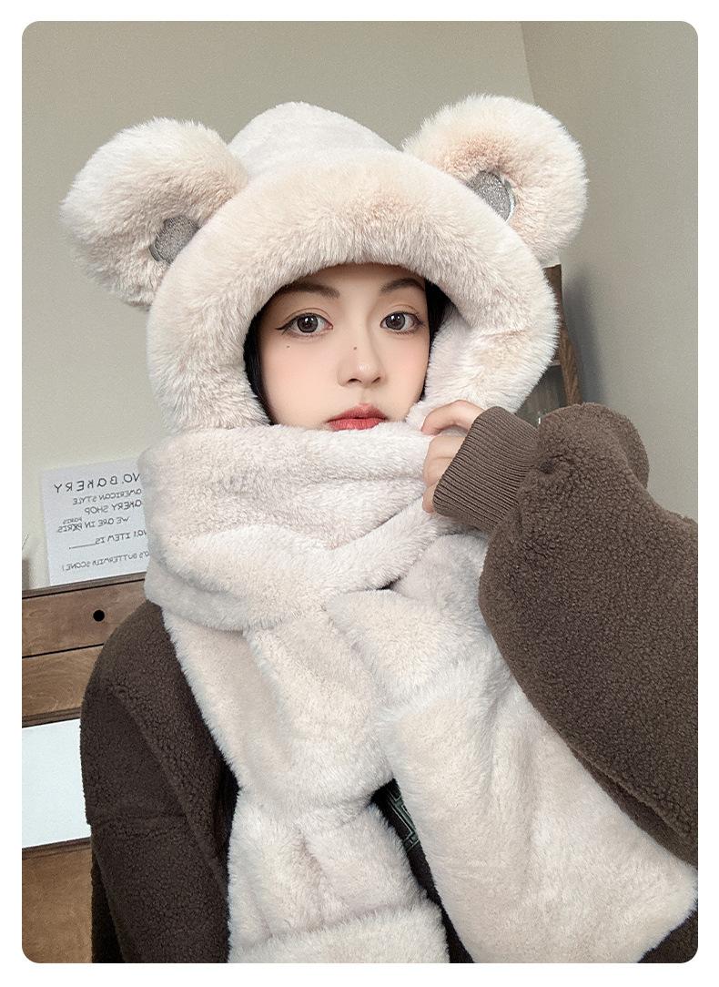 Otoño e Invierno Cálido Sombrero de Felpa y Bufanda Todo en Uno Invierno Lindo Bufanda de Oso con Capucha Protección para los Oídos a Prueba de Viento Set de Tres Piezas