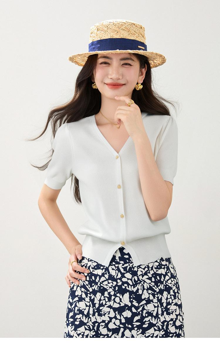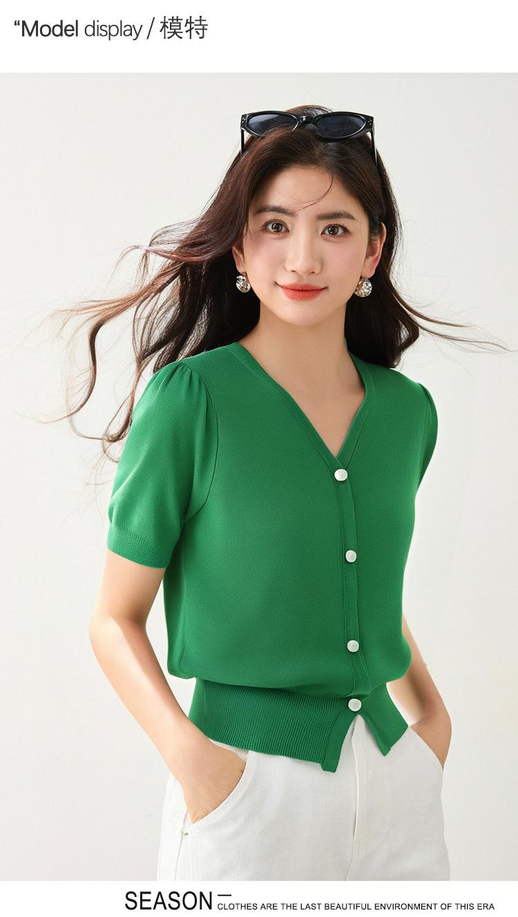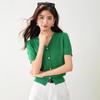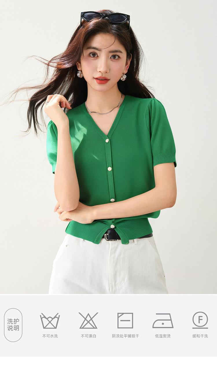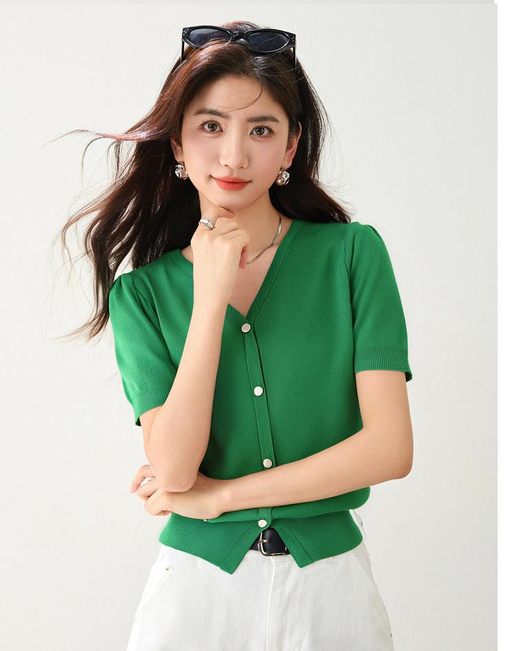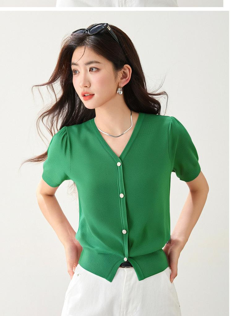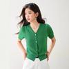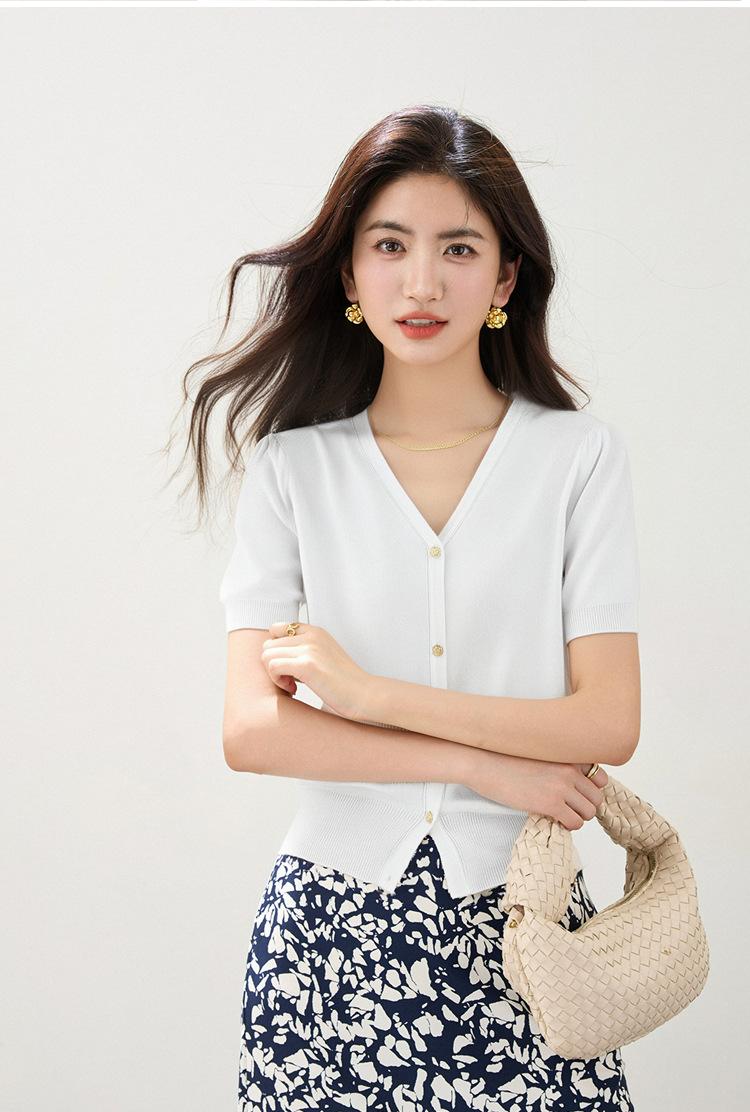 Cárdigan de Punto Fino de Manga Corta Suave Francés para Mujer 2025 Verano Nuevo Estilo Coreano Simple Cuello en V Top Suave Encerado
