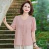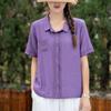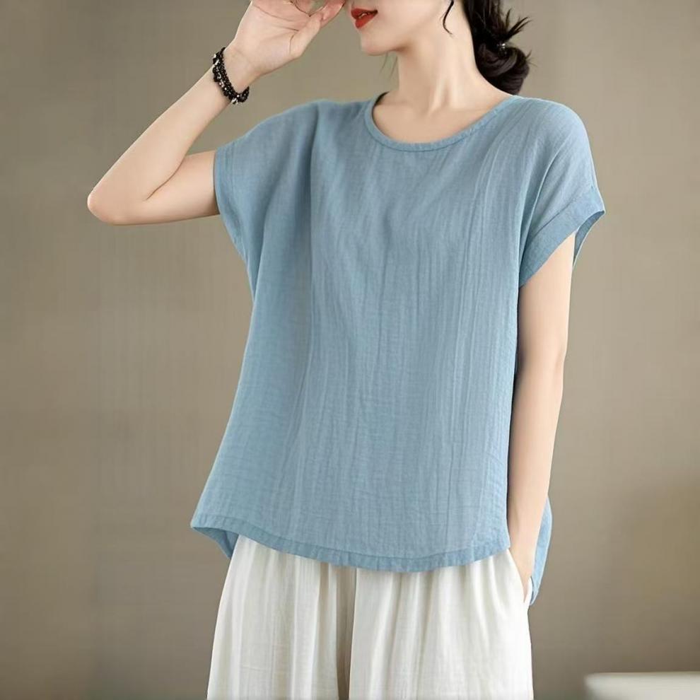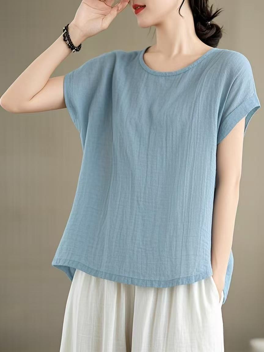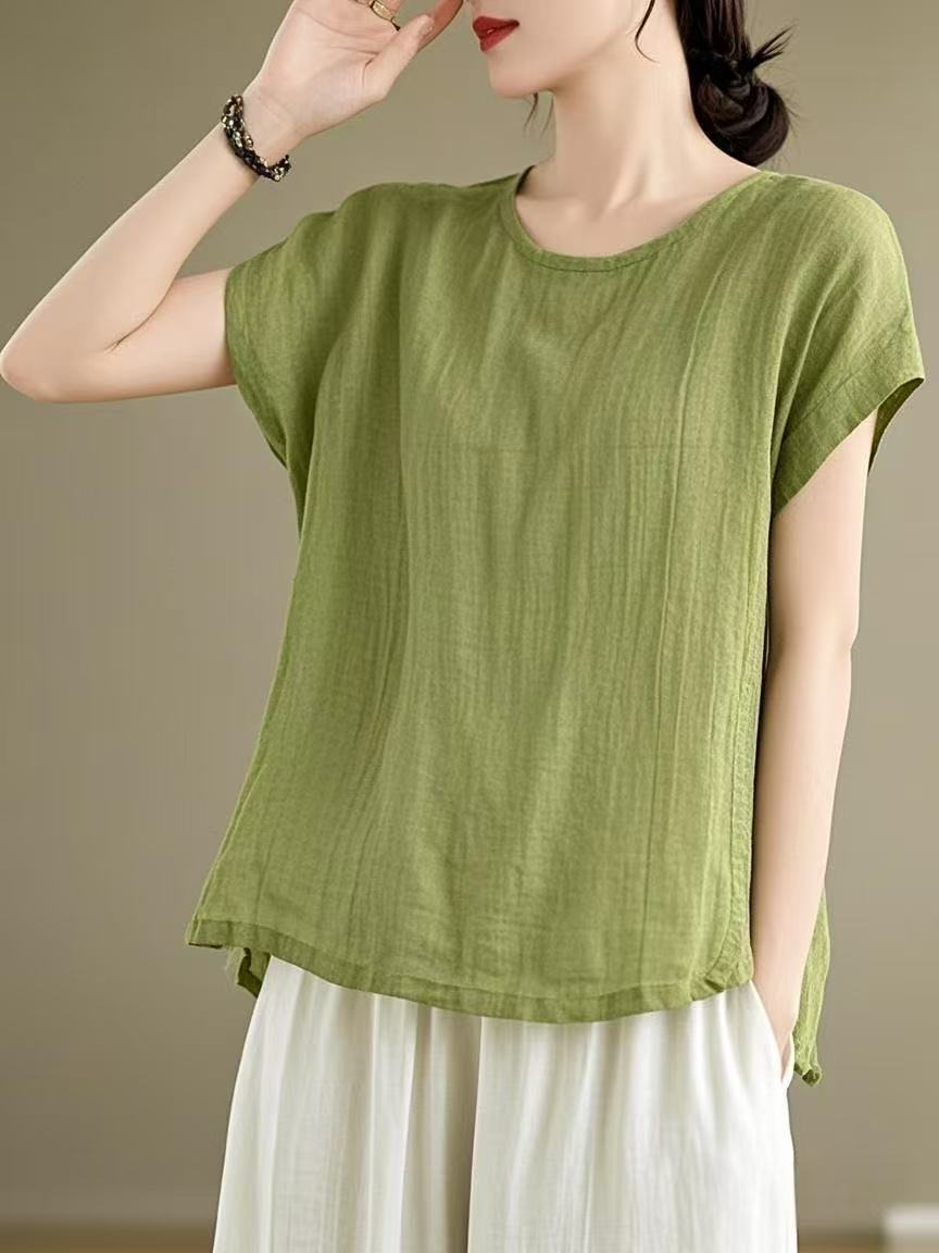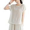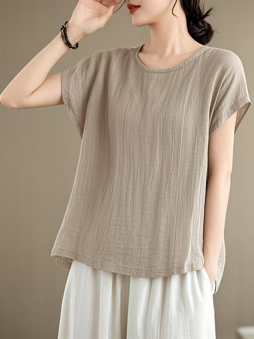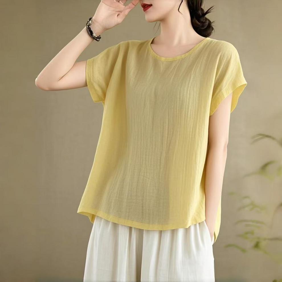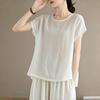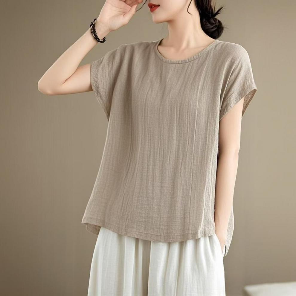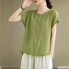 Camisa de Verano Retro de Color Puro de Algodón y Lino para Mujer 2025 Nueva Slim Holgada Versátil Cuello Redondo Top Casual para Mujer